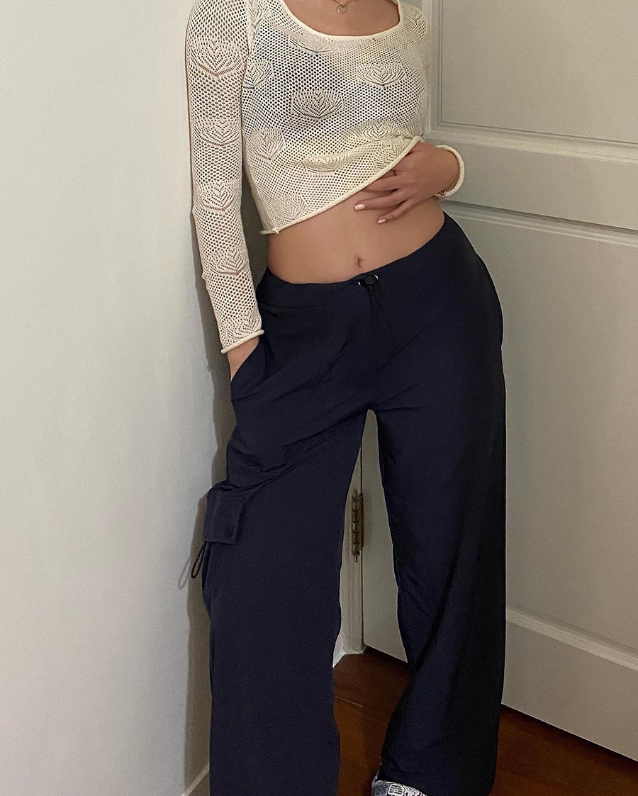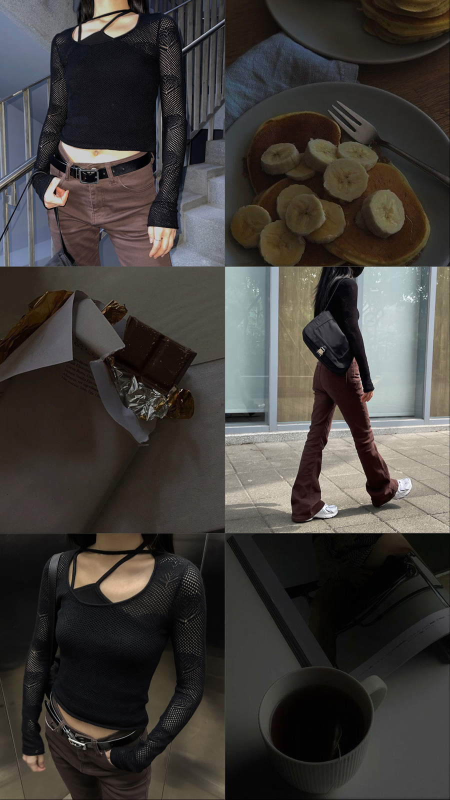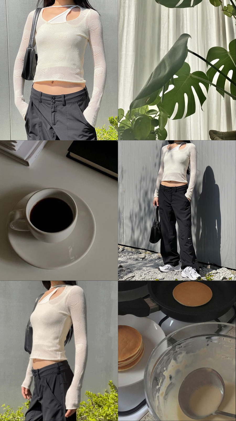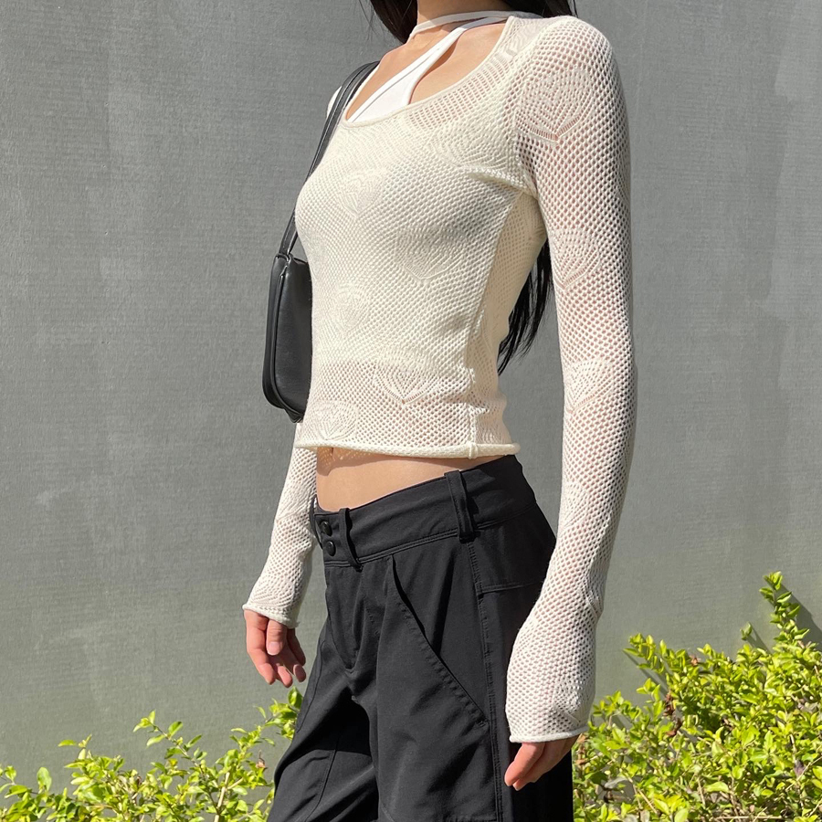 大U領,頸部細帶,微妙平衡,鏤空心型針織上衣,貼身版型,觸感舒適,捲邊下擺。