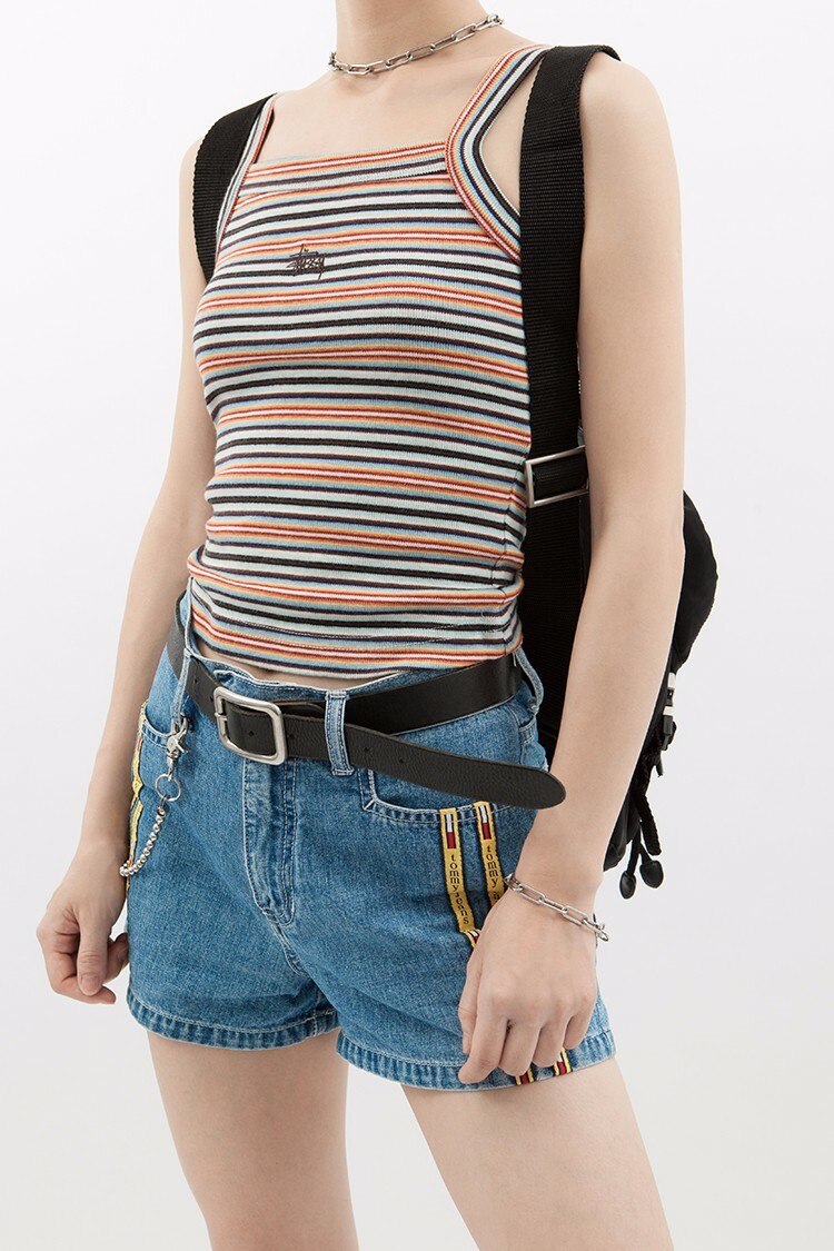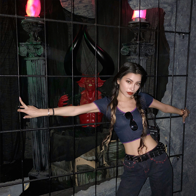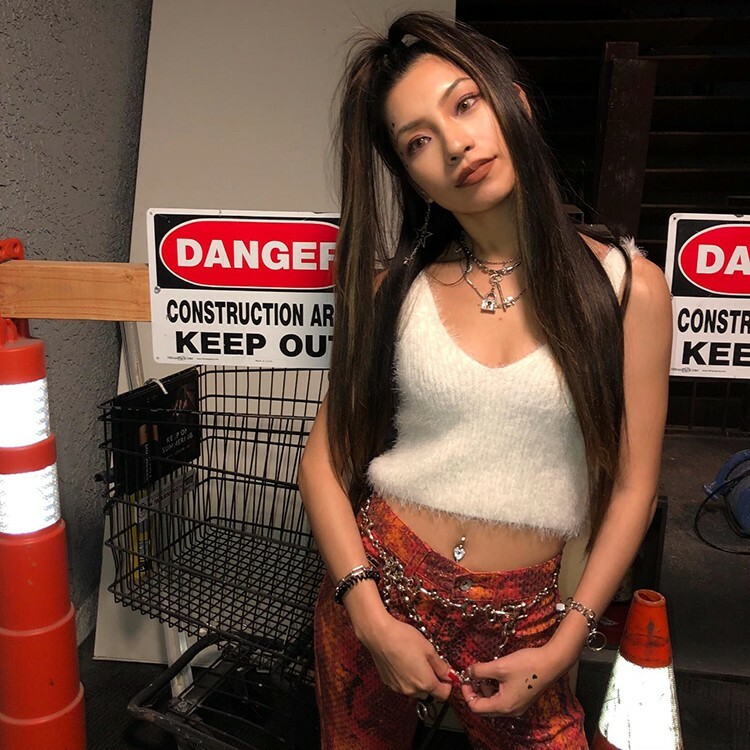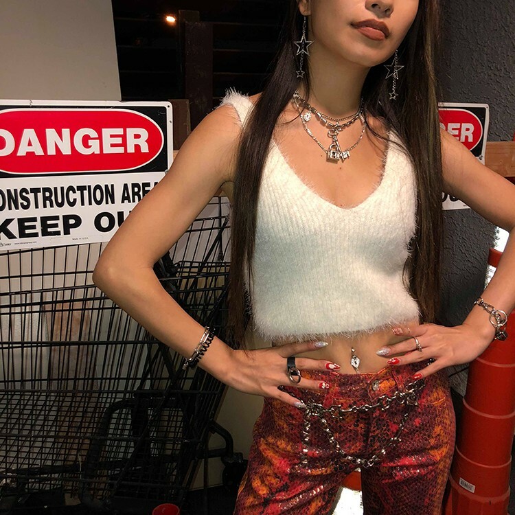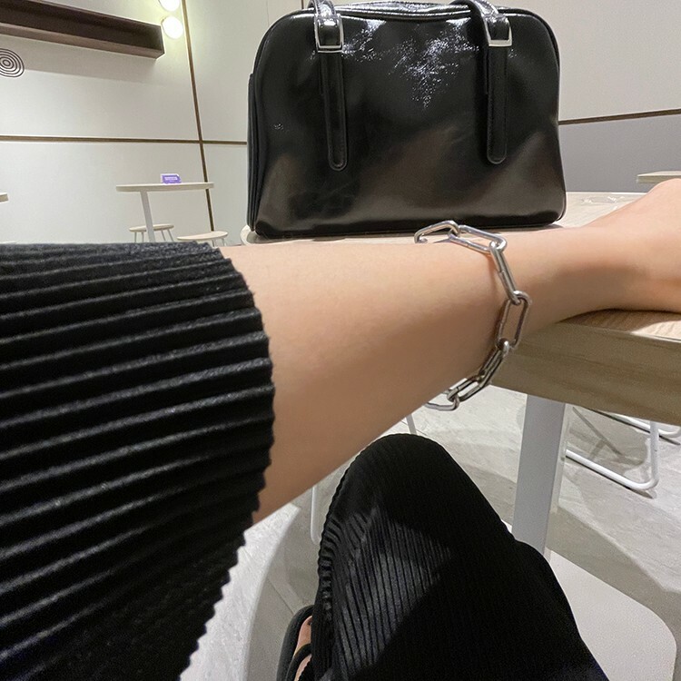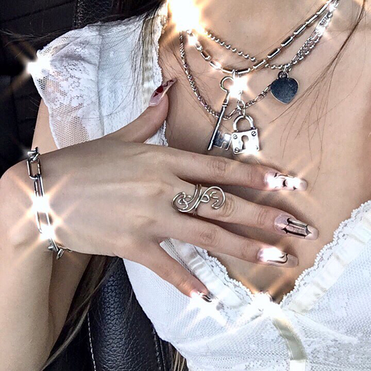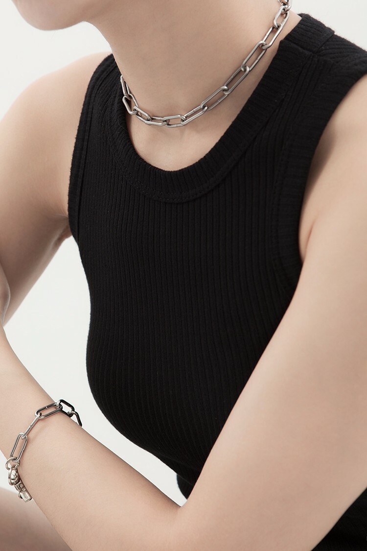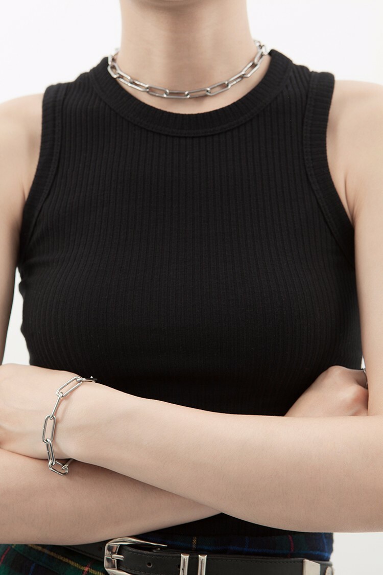 金屬勾環,大鎖鍊條,與素面上衣一起搭配提升造型重點。