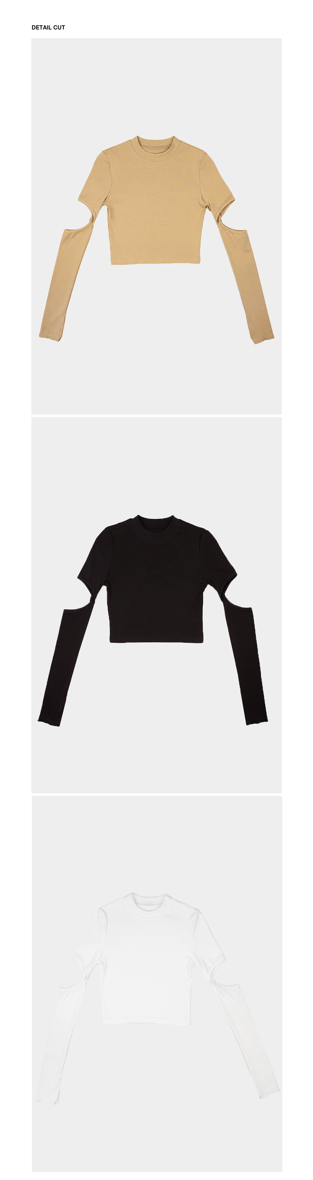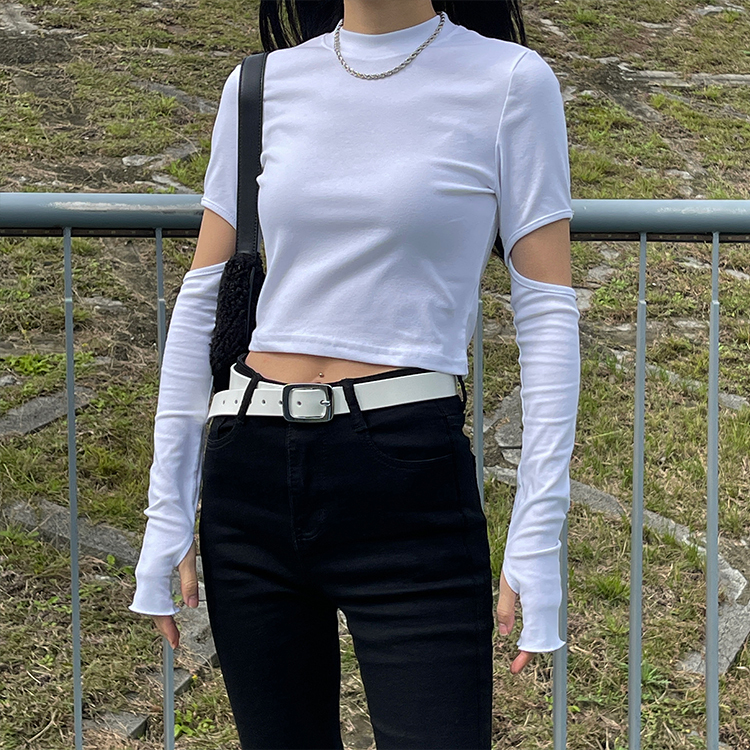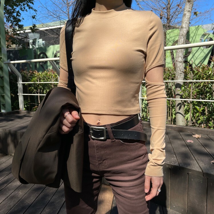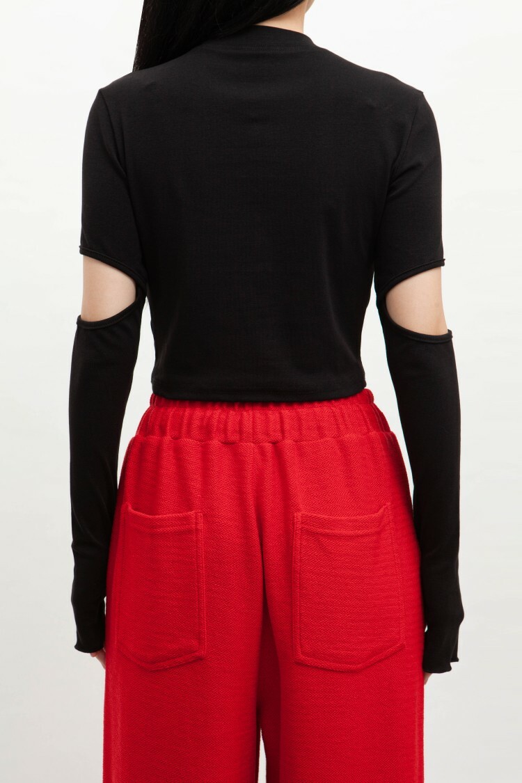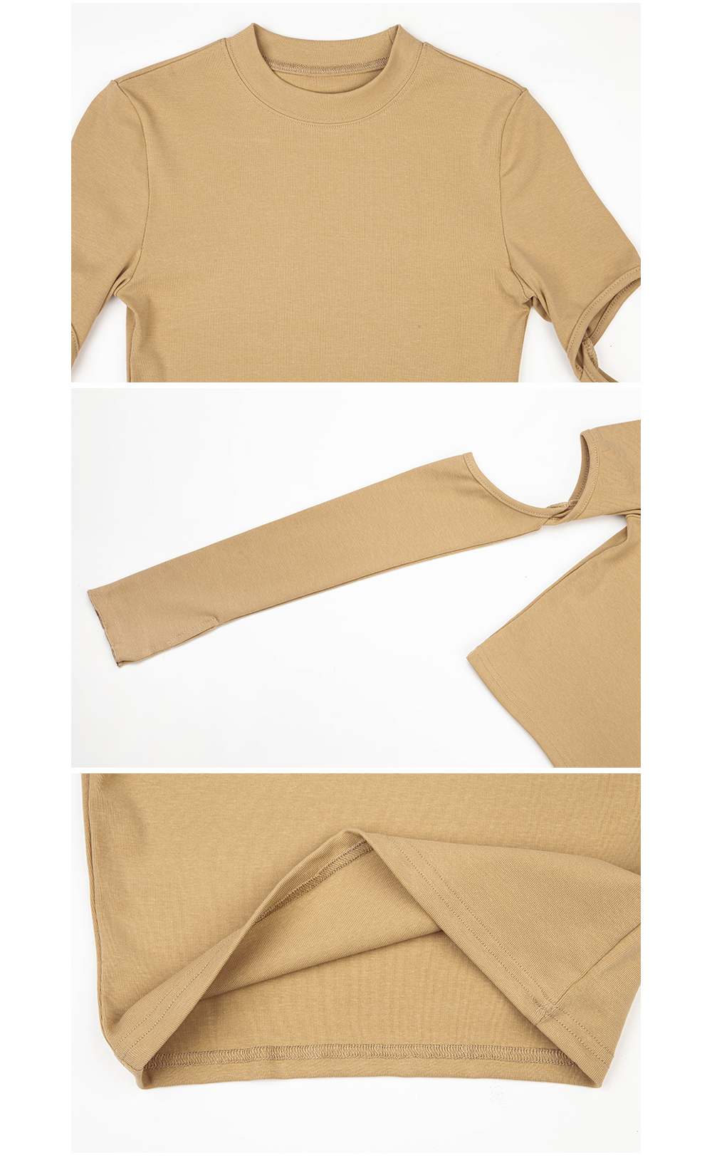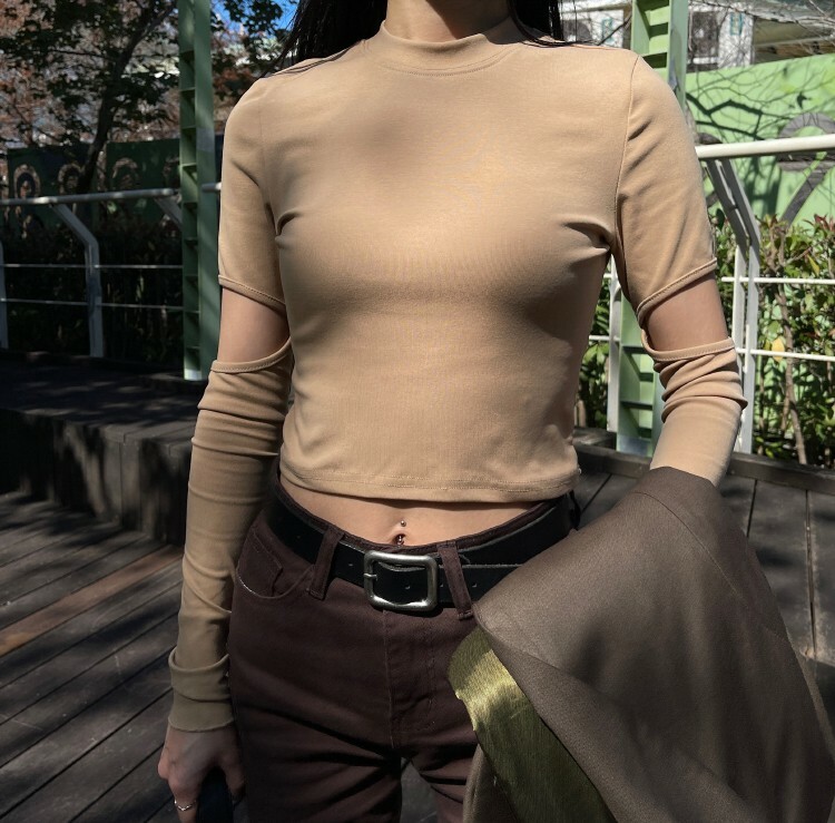 圓領,貼身短版,手袖處鏤空設計,基礎帶點變化,好的彈性。