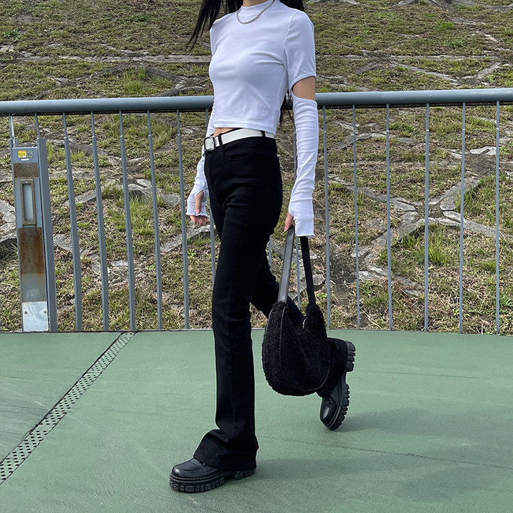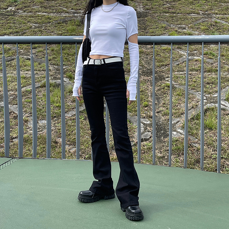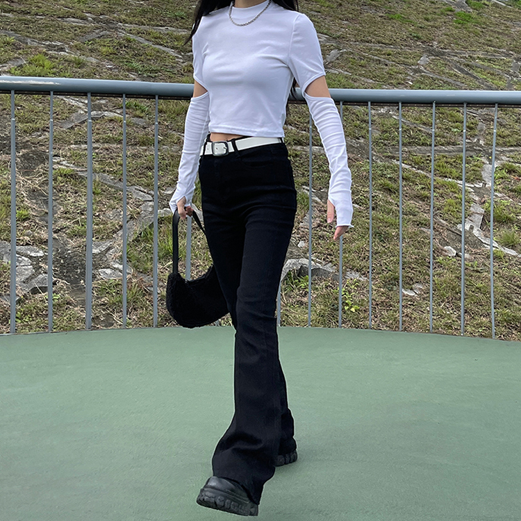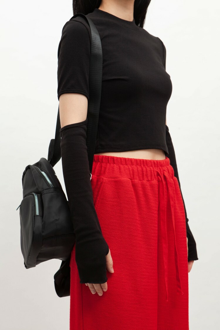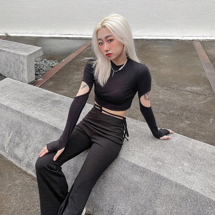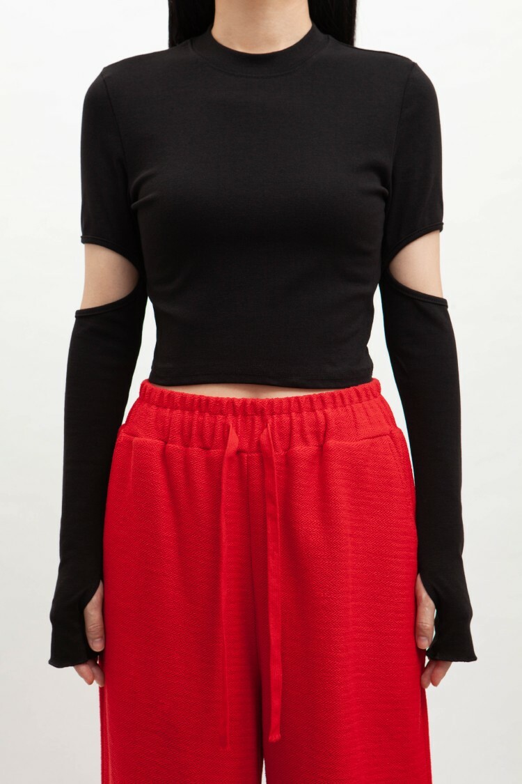 圓領,貼身短版,手袖處鏤空設計,基礎帶點變化,好的彈性。