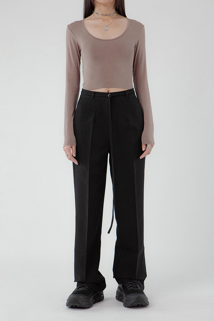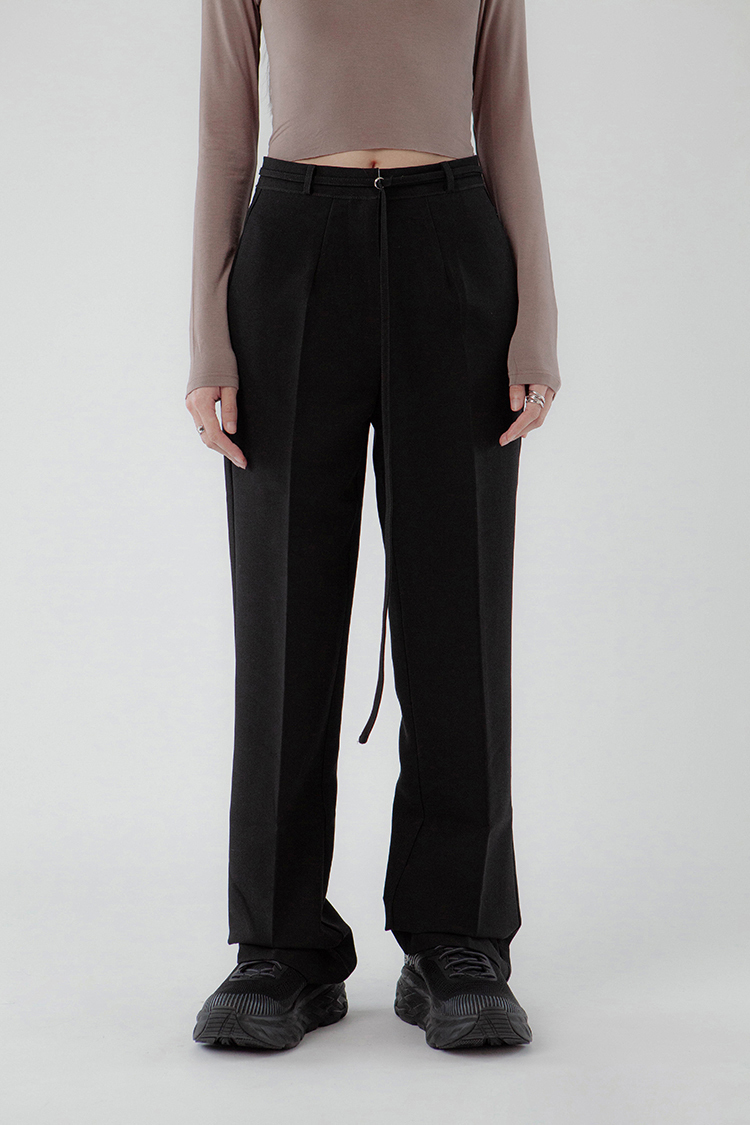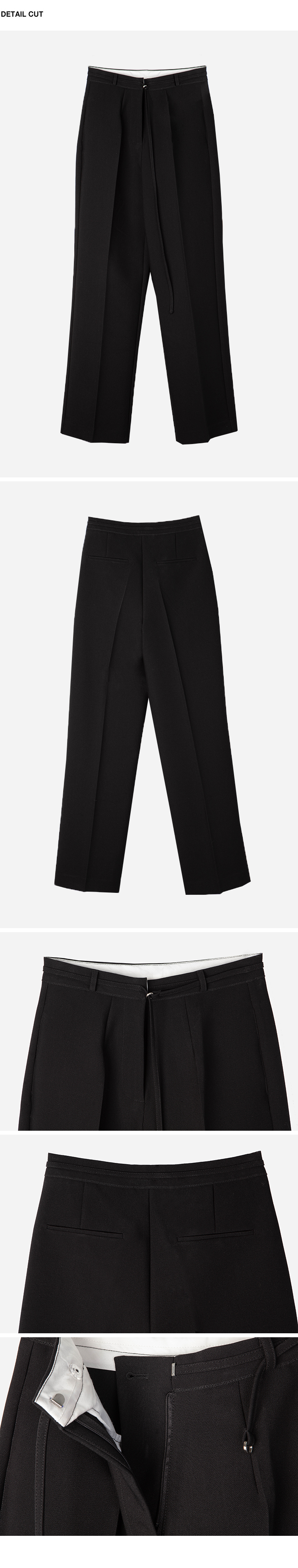 高腰直筒西裝褲,拉鍊門襟配隱形鉤扣,褲頭配金屬釦細繩設計(不可拆),增添細緻感,褲腿打褶細節,使整體腿部視覺更修長,兩側隱形口袋,後面裝飾假口袋,高質感挺版西裝材質,經典簡約。