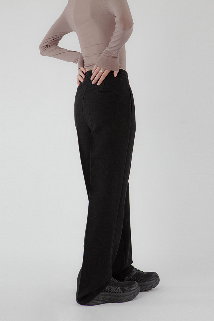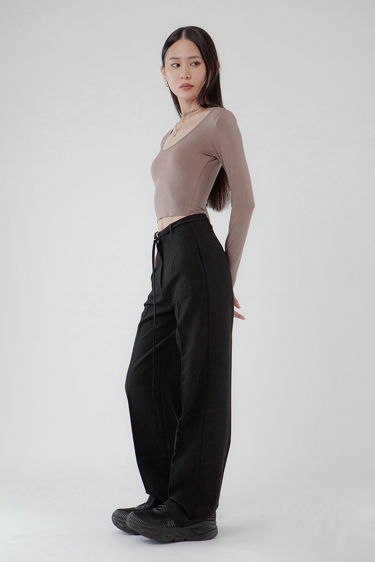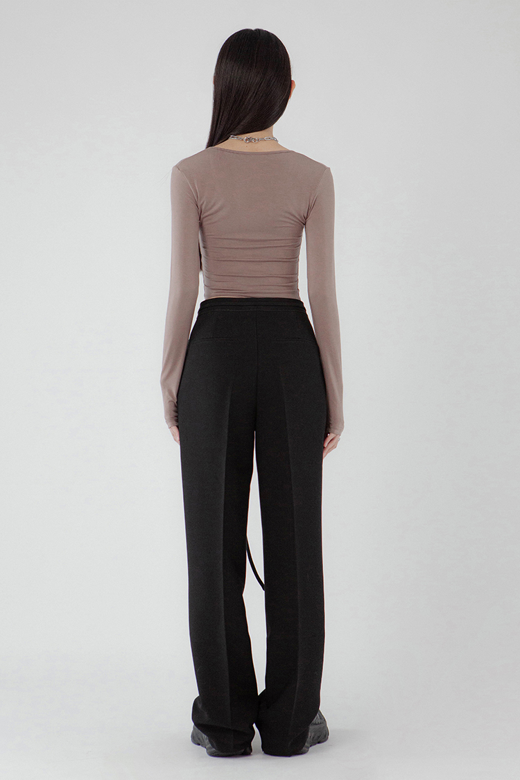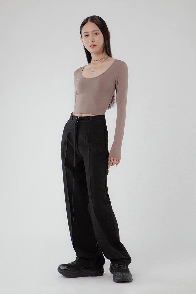 高腰直筒西裝褲,拉鍊門襟配隱形鉤扣,褲頭配金屬釦細繩設計(不可拆),增添細緻感,褲腿打褶細節,使整體腿部視覺更修長,兩側隱形口袋,後面裝飾假口袋,高質感挺版西裝材質,經典簡約。