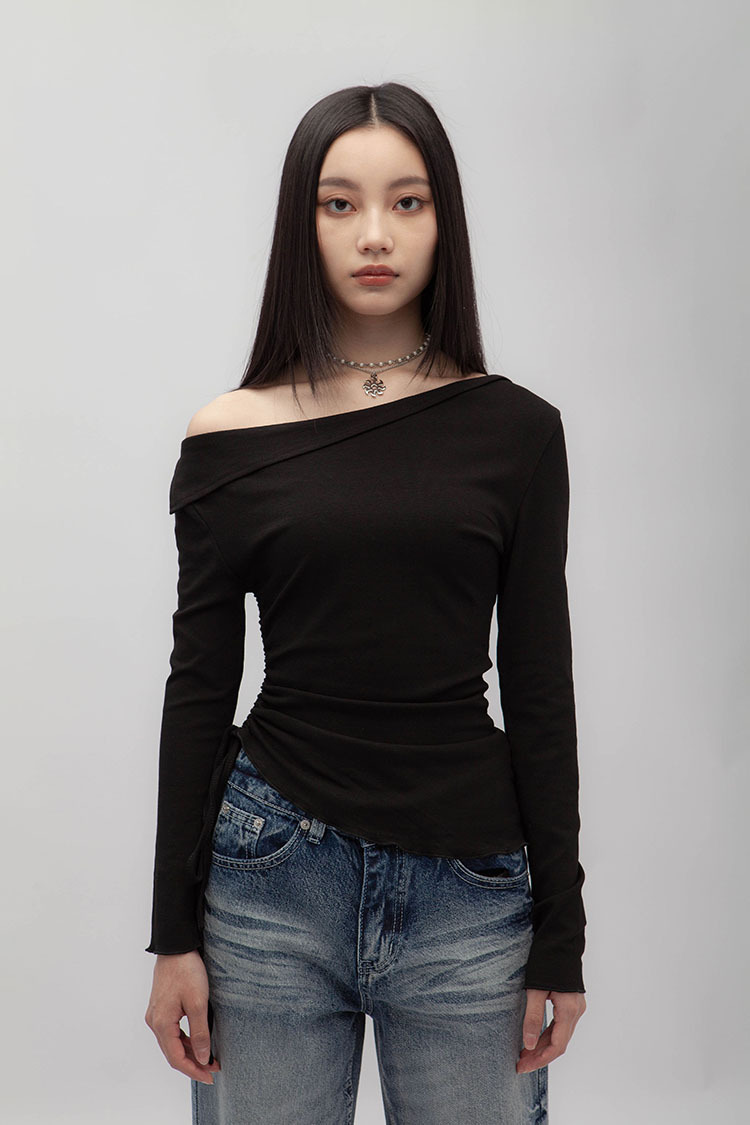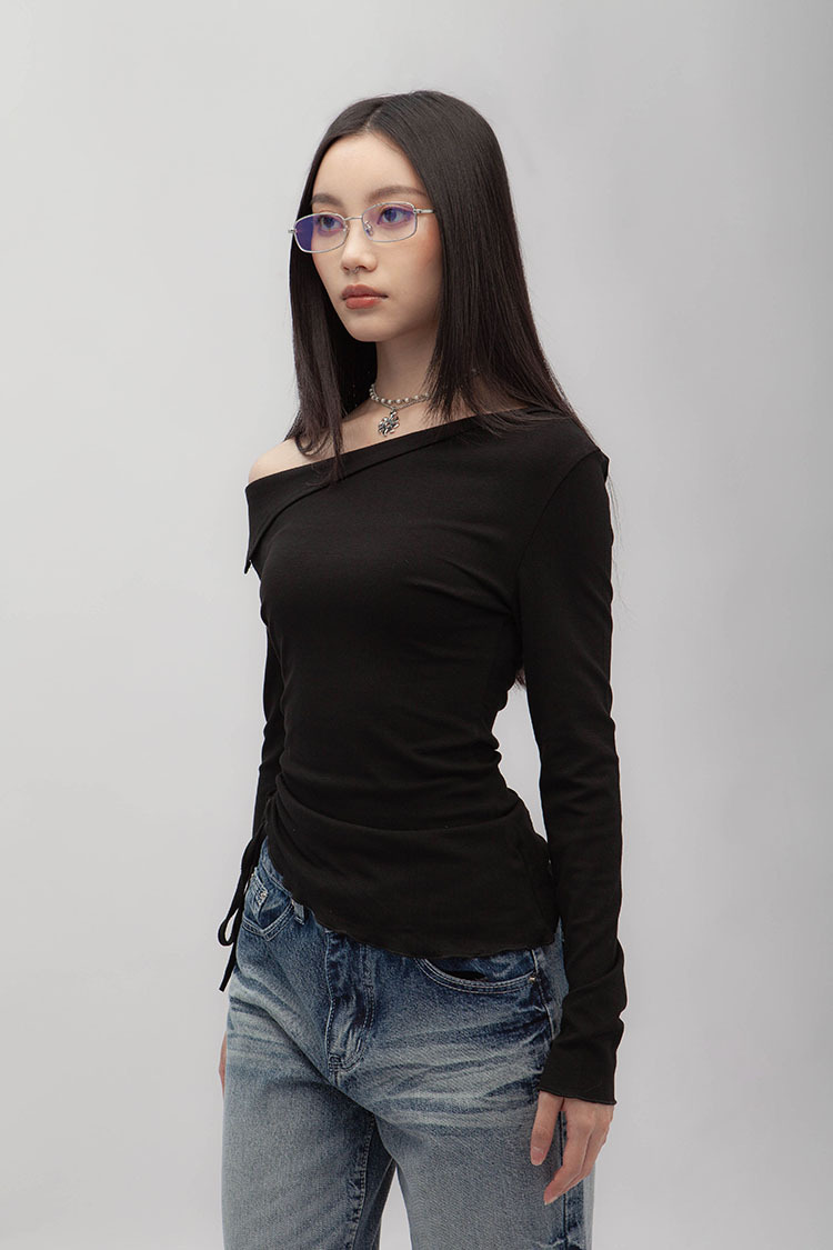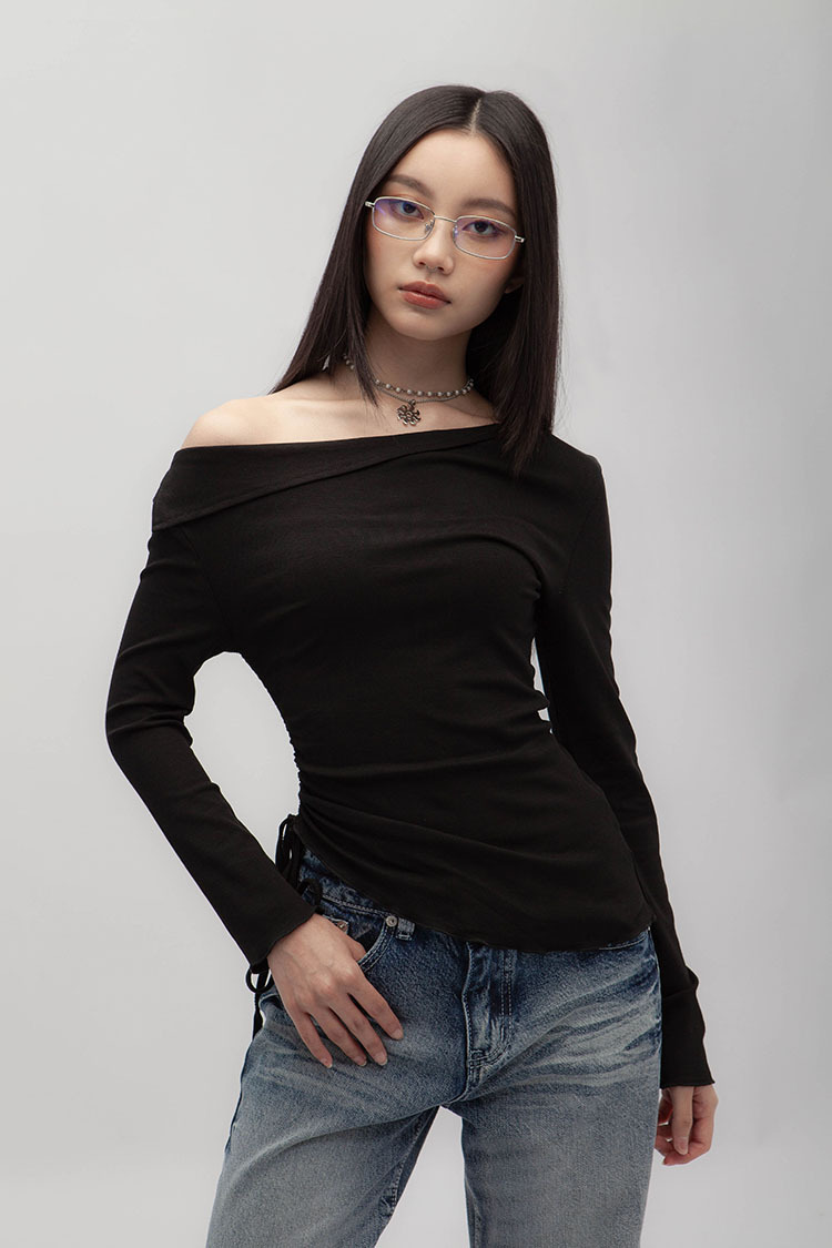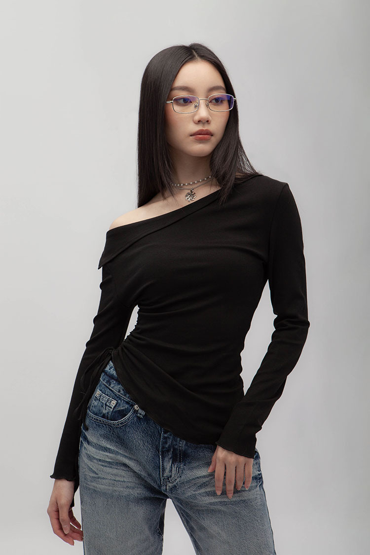 修身廓形結合斜肩設計,肩線自然翻折延伸出露肩效果,搭配單側抽繩微收腰身,讓整體線條更加流暢。是日常中想展現造型感的理想選擇。穿著舒適自在,細節設計帶出甜辣氛圍。