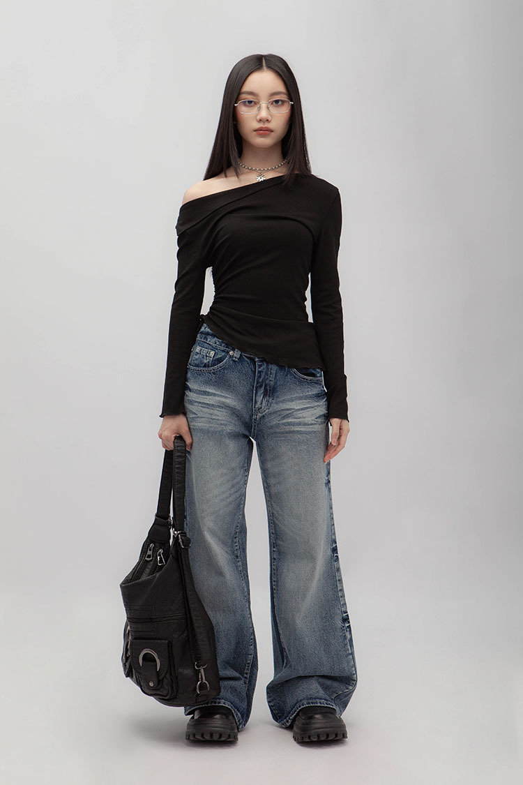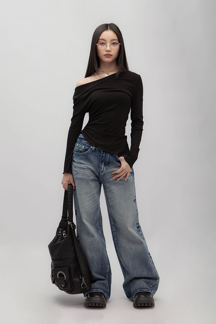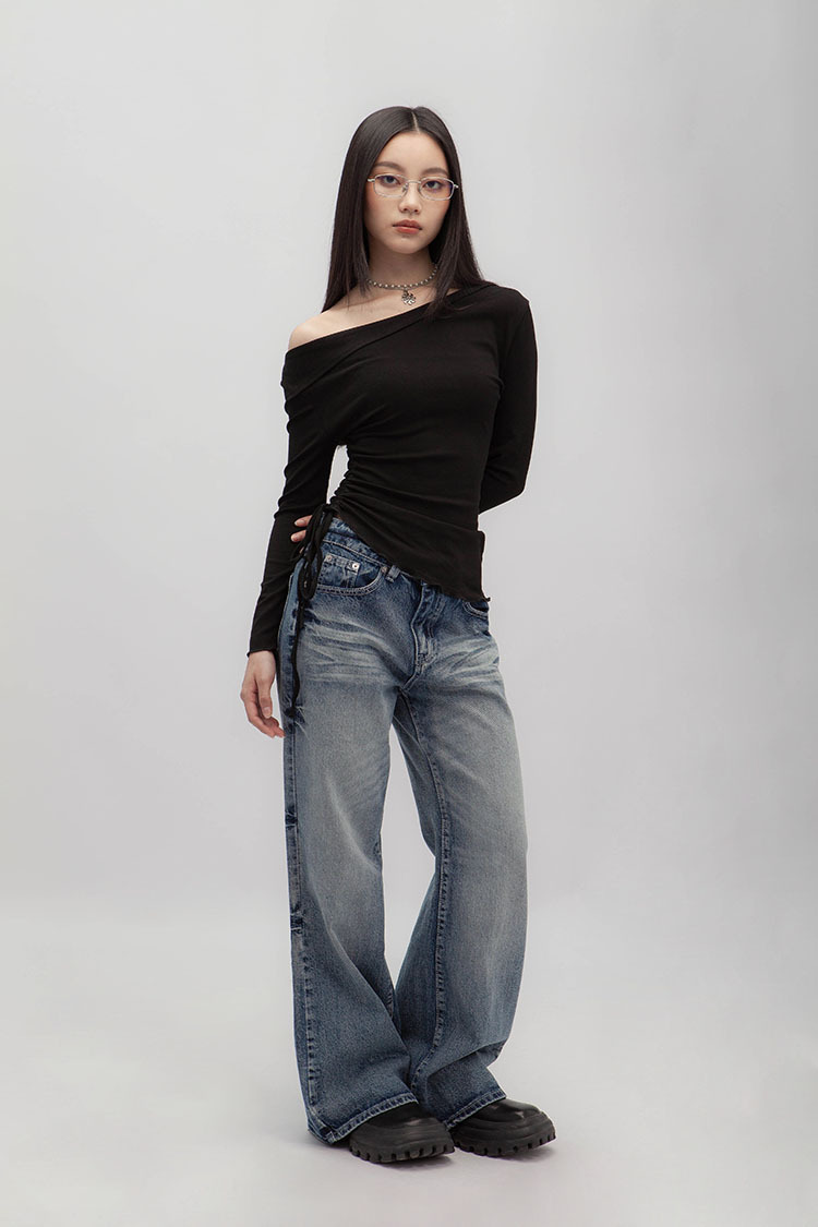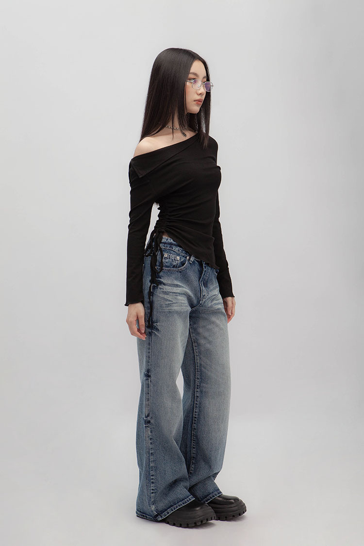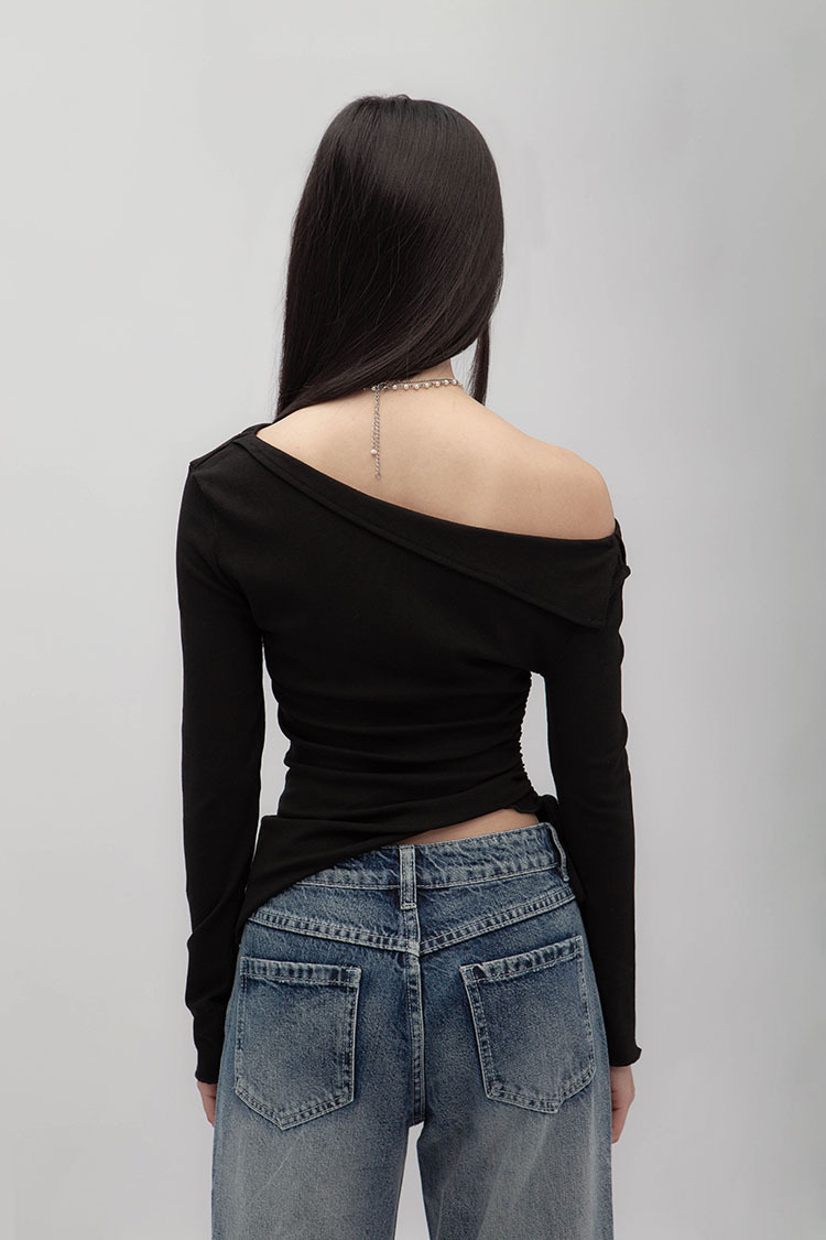 修身廓形結合斜肩設計,肩線自然翻折延伸出露肩效果,搭配單側抽繩微收腰身,讓整體線條更加流暢。是日常中想展現造型感的理想選擇。穿著舒適自在,細節設計帶出甜辣氛圍。