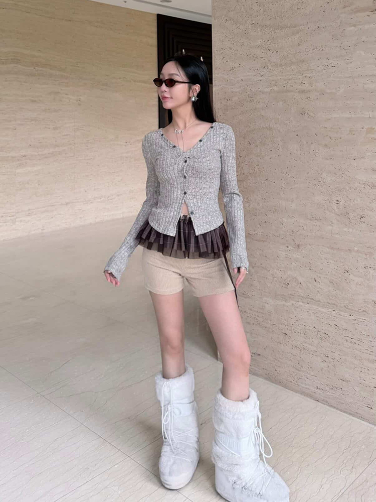 V領,鈕扣設計,中長版型,立體紋理,溫暖、修身、舒適的外觀。