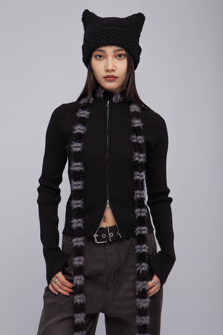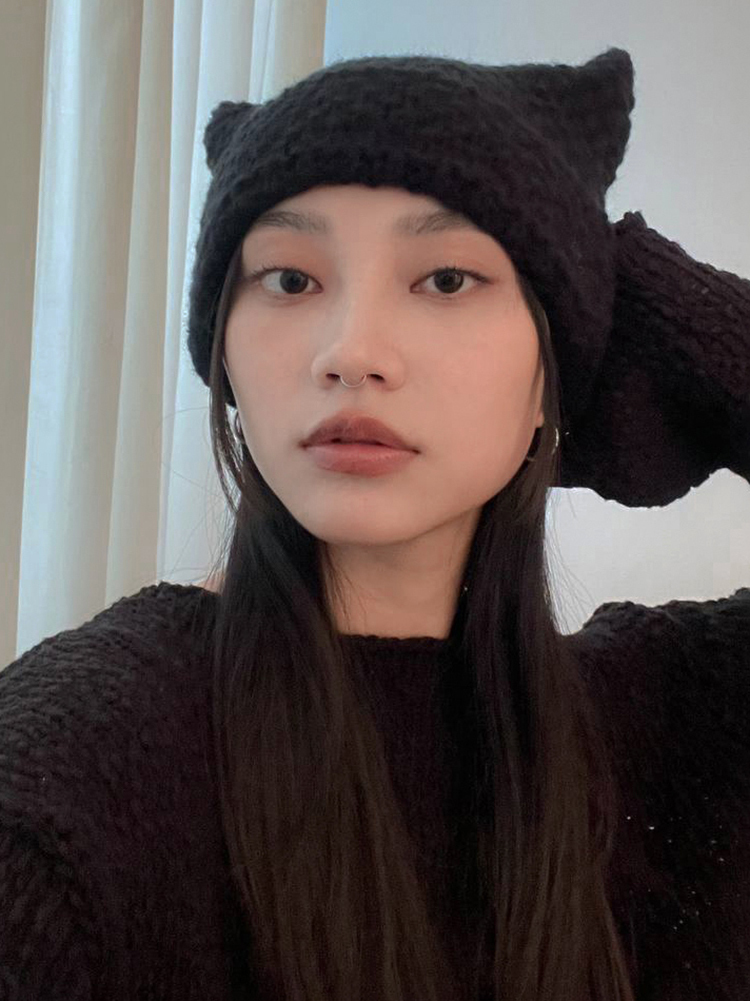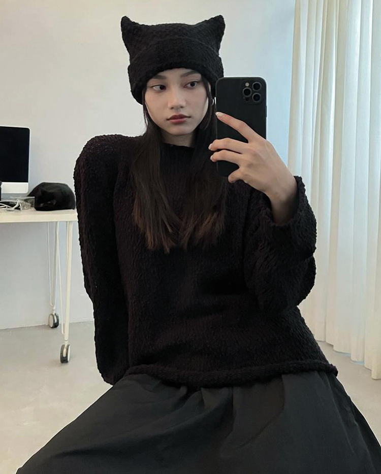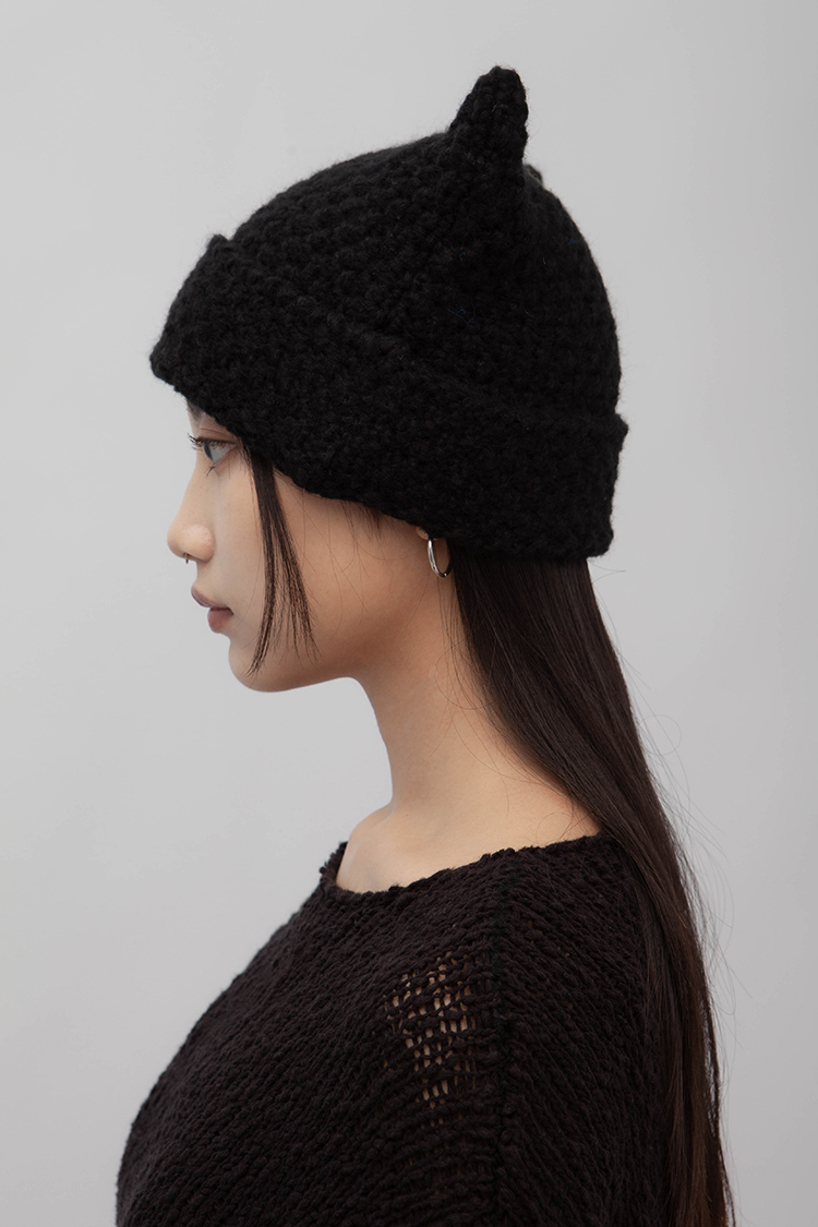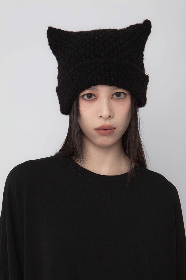 粗毛線針織帽,貓耳朵輪廓,翻邊帽沿,又暖又萌。