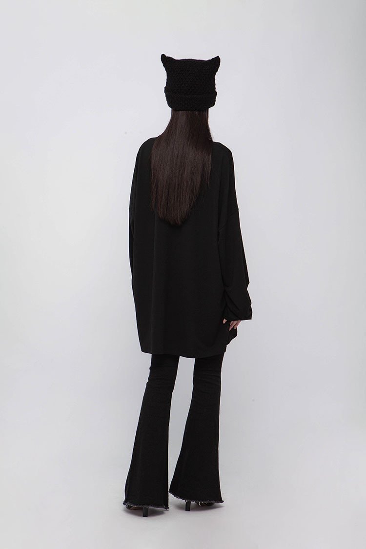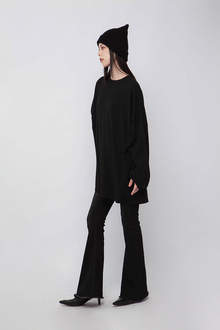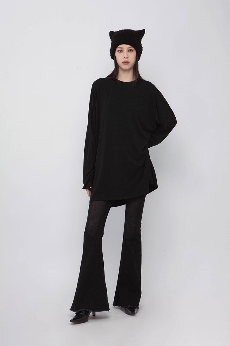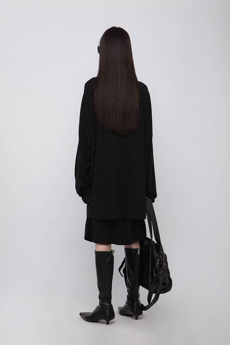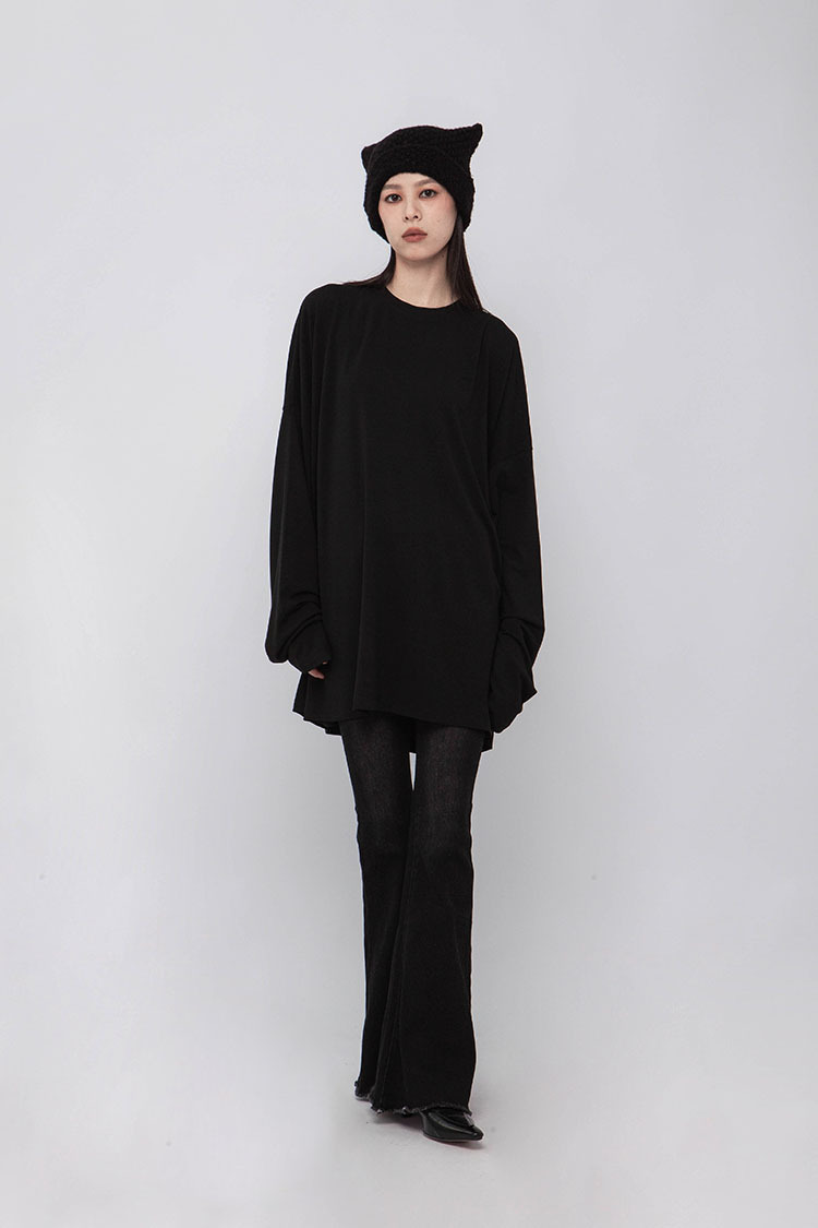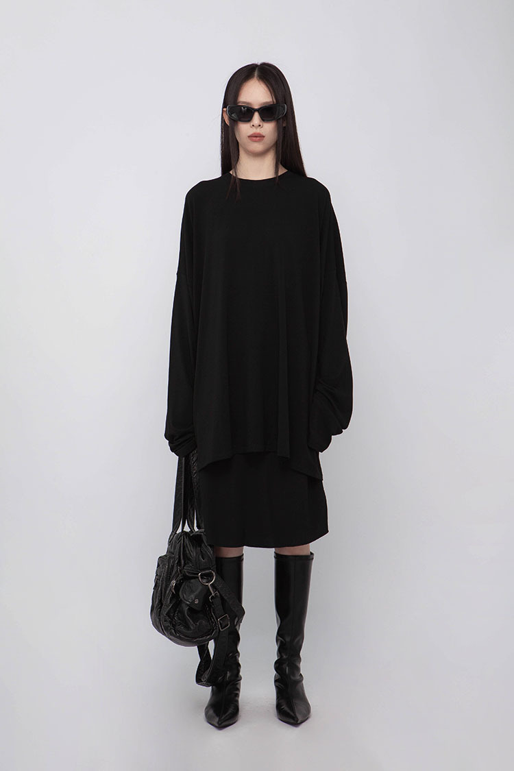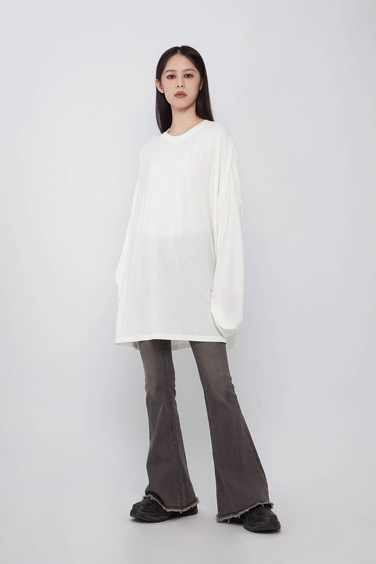圓領,落肩袖,長版長袖,寬鬆T恤輪廓,混紡材質,細緻垂墜感,無性別適穿款,慵懶氛圍,日常經典單品。