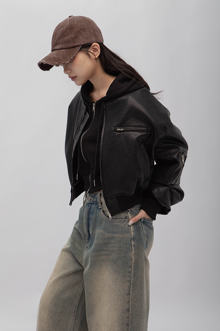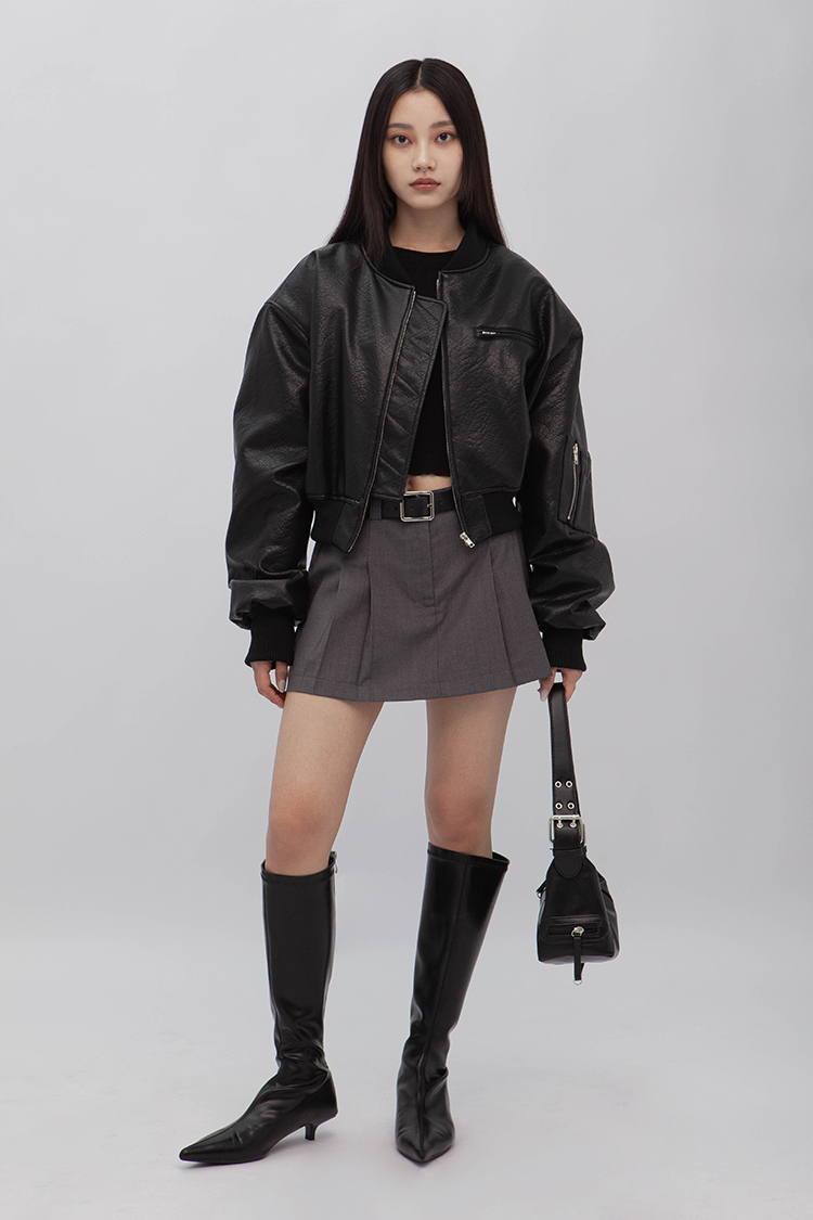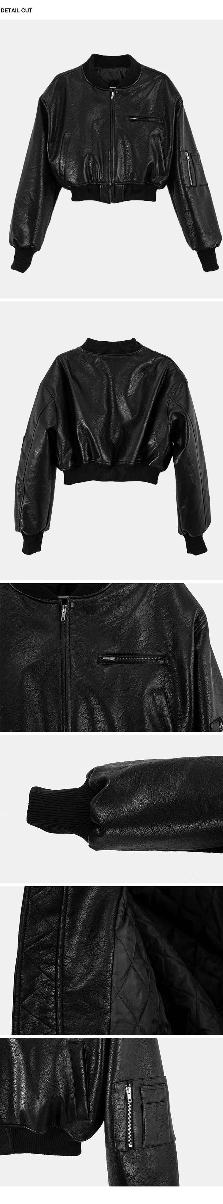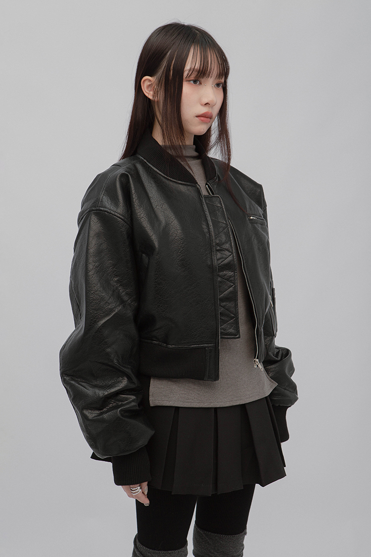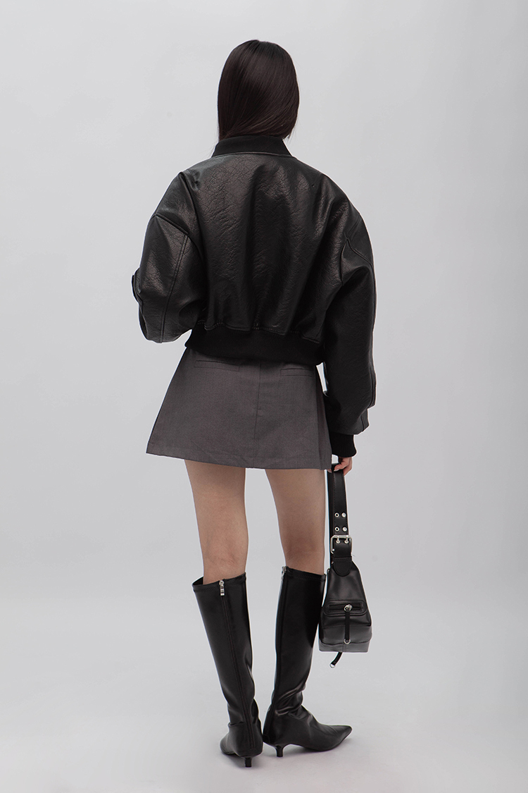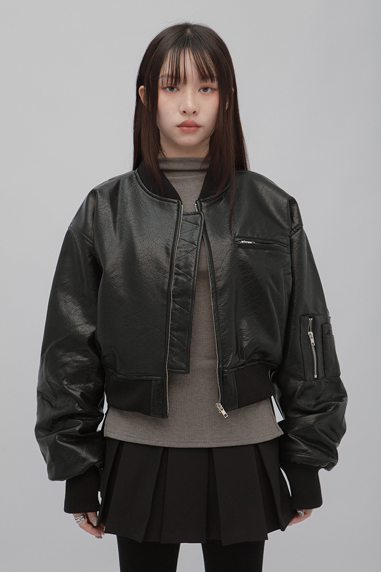 粒面紋理人造皮革,羅紋針織立領、下擺與袖口,微墊肩,拉鍊門襟,左前胸裝飾拉鍊袋,嵌線前口袋,左手臂拉鍊口袋設計,短版,全內裡菱形網格夾棉,率性不羈的狂放感。