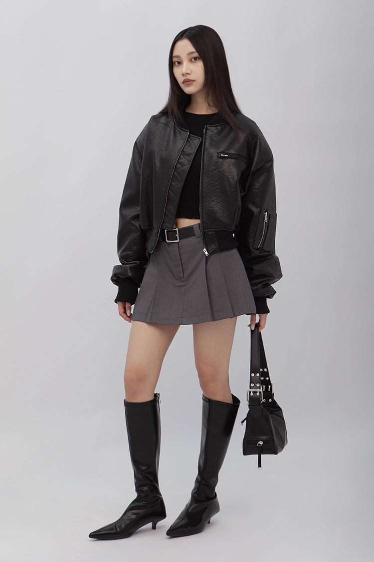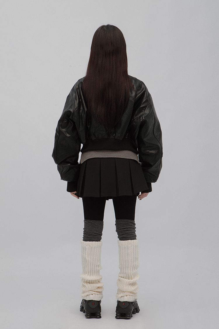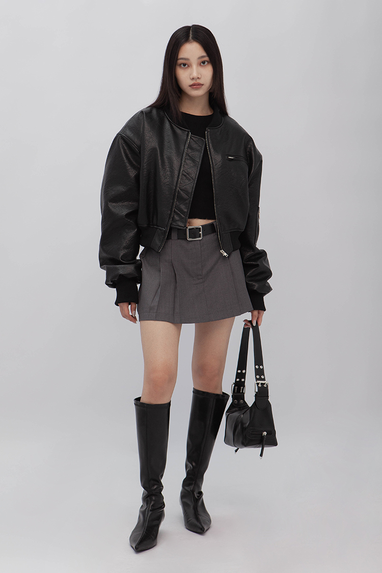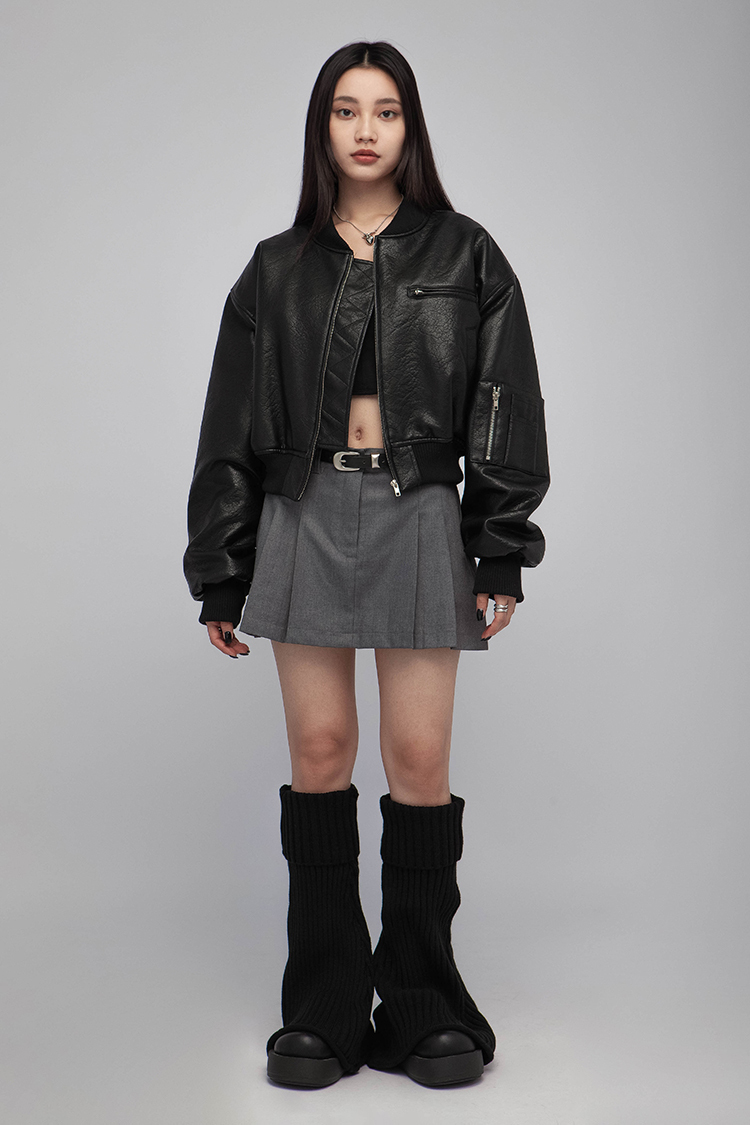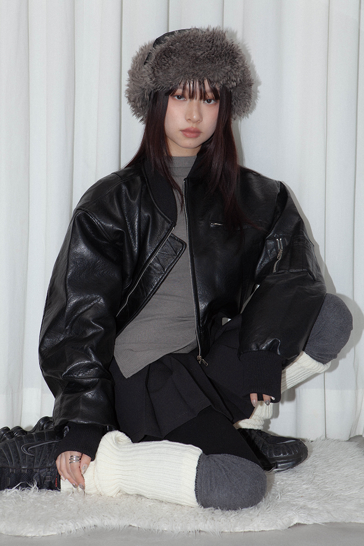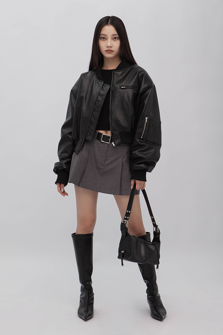 粒面紋理人造皮革,羅紋針織立領、下擺與袖口,微墊肩,拉鍊門襟,左前胸裝飾拉鍊袋,嵌線前口袋,左手臂拉鍊口袋設計,短版,全內裡菱形網格夾棉,率性不羈的狂放感。