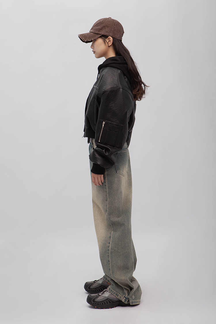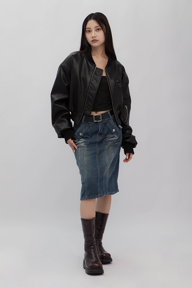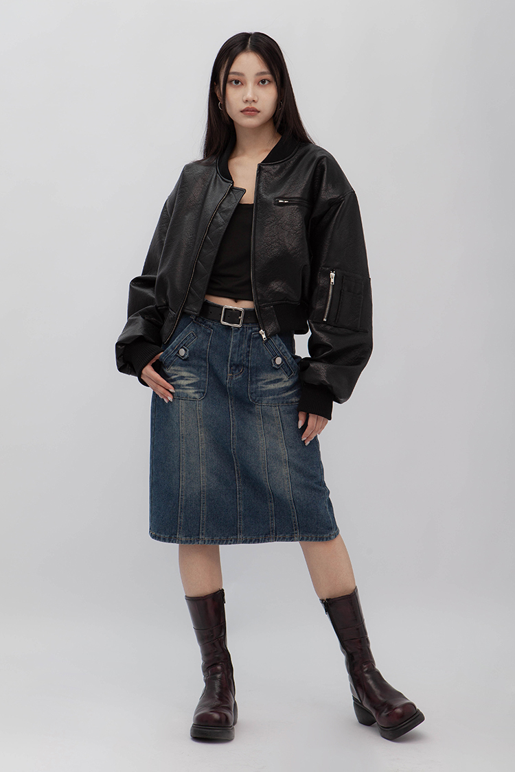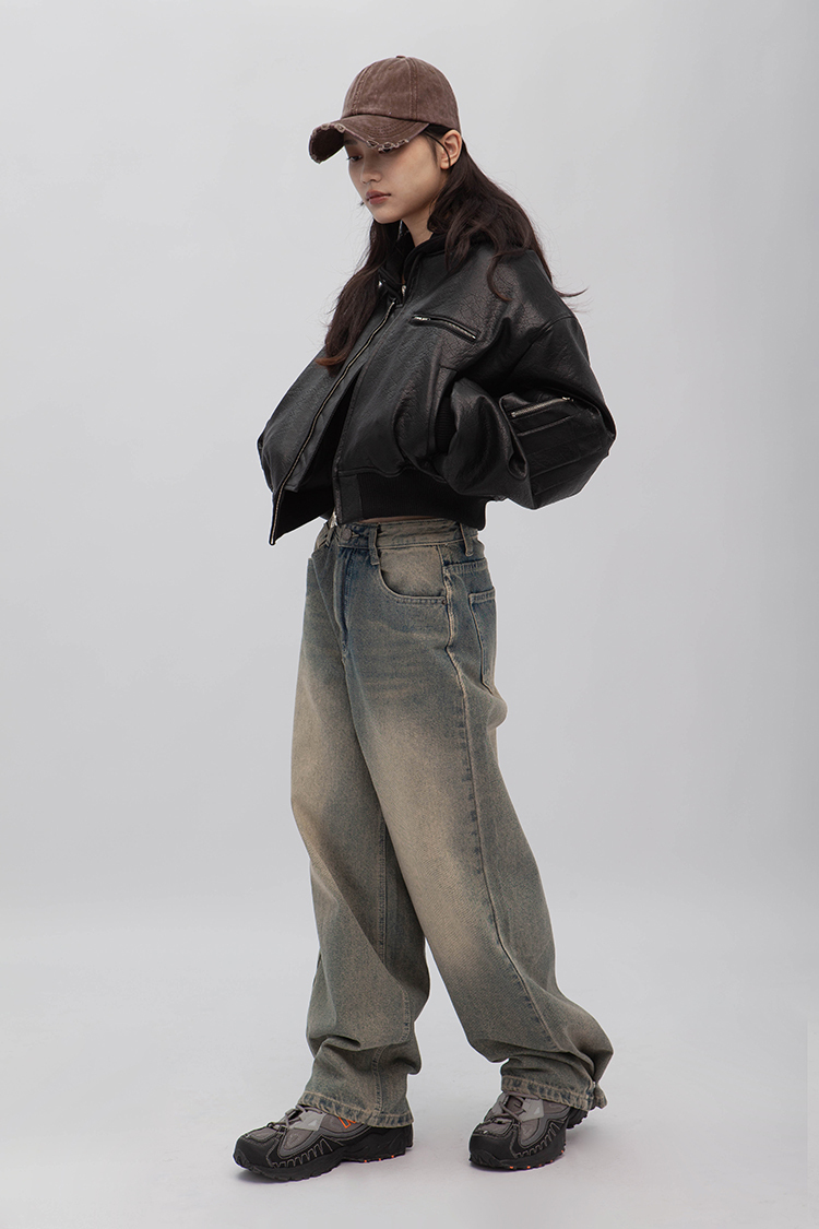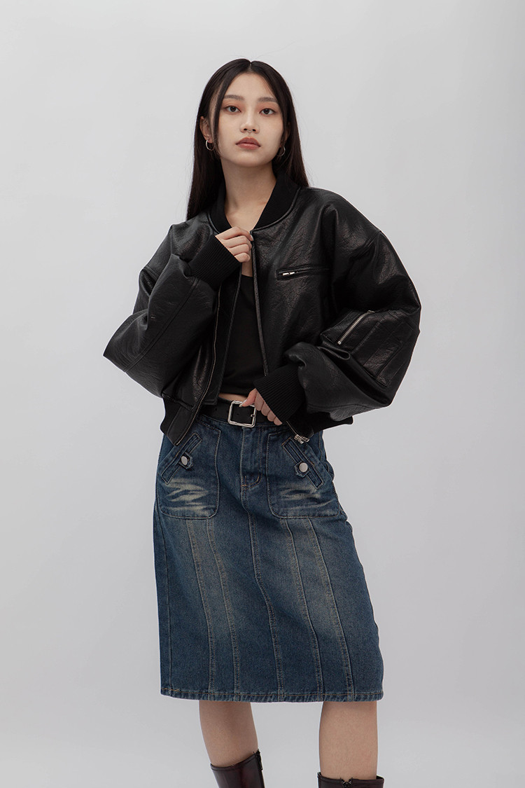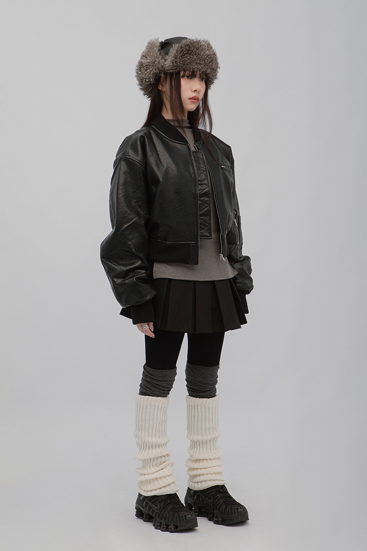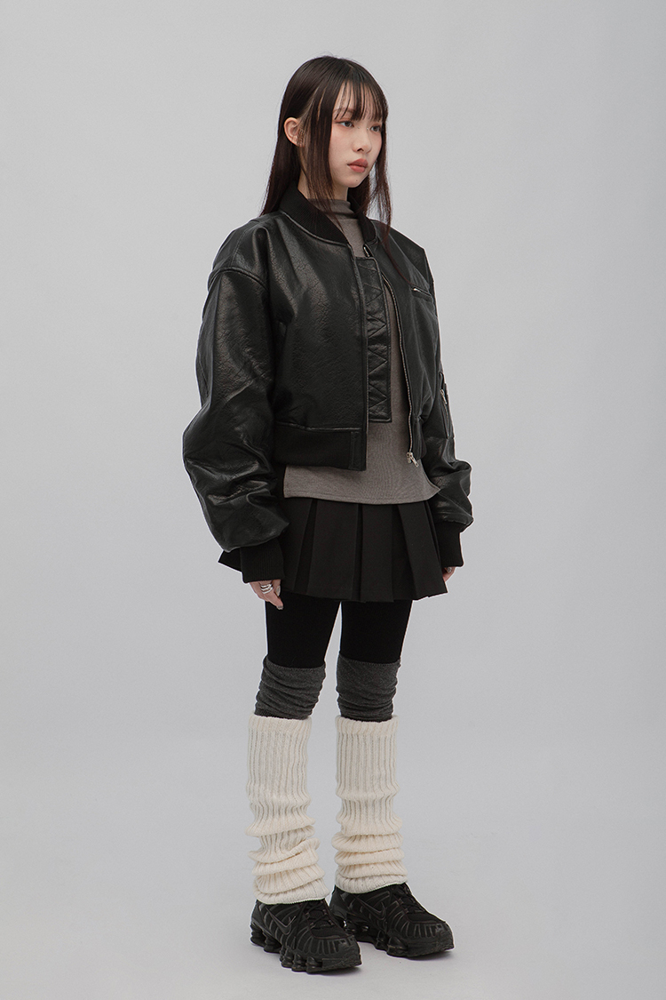 粒面紋理人造皮革,羅紋針織立領、下擺與袖口,微墊肩,拉鍊門襟,左前胸裝飾拉鍊袋,嵌線前口袋,左手臂拉鍊口袋設計,短版,全內裡菱形網格夾棉,率性不羈的狂放感。