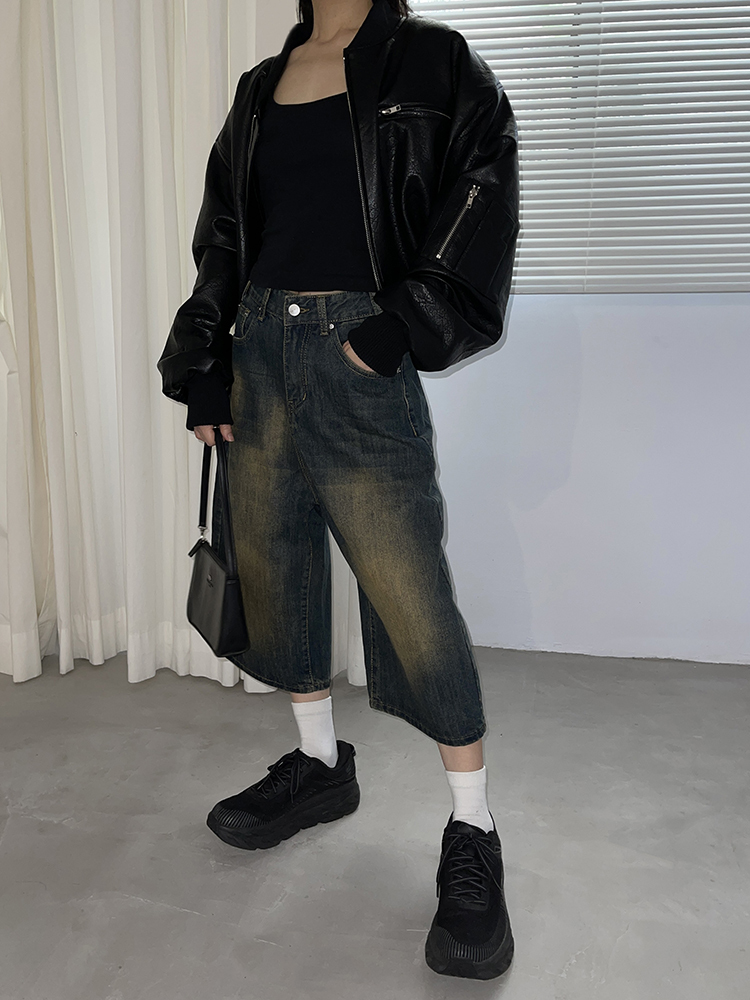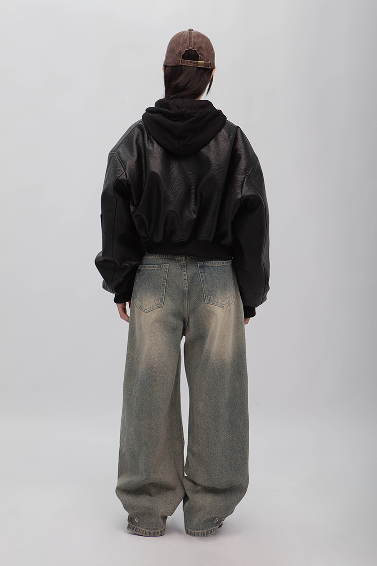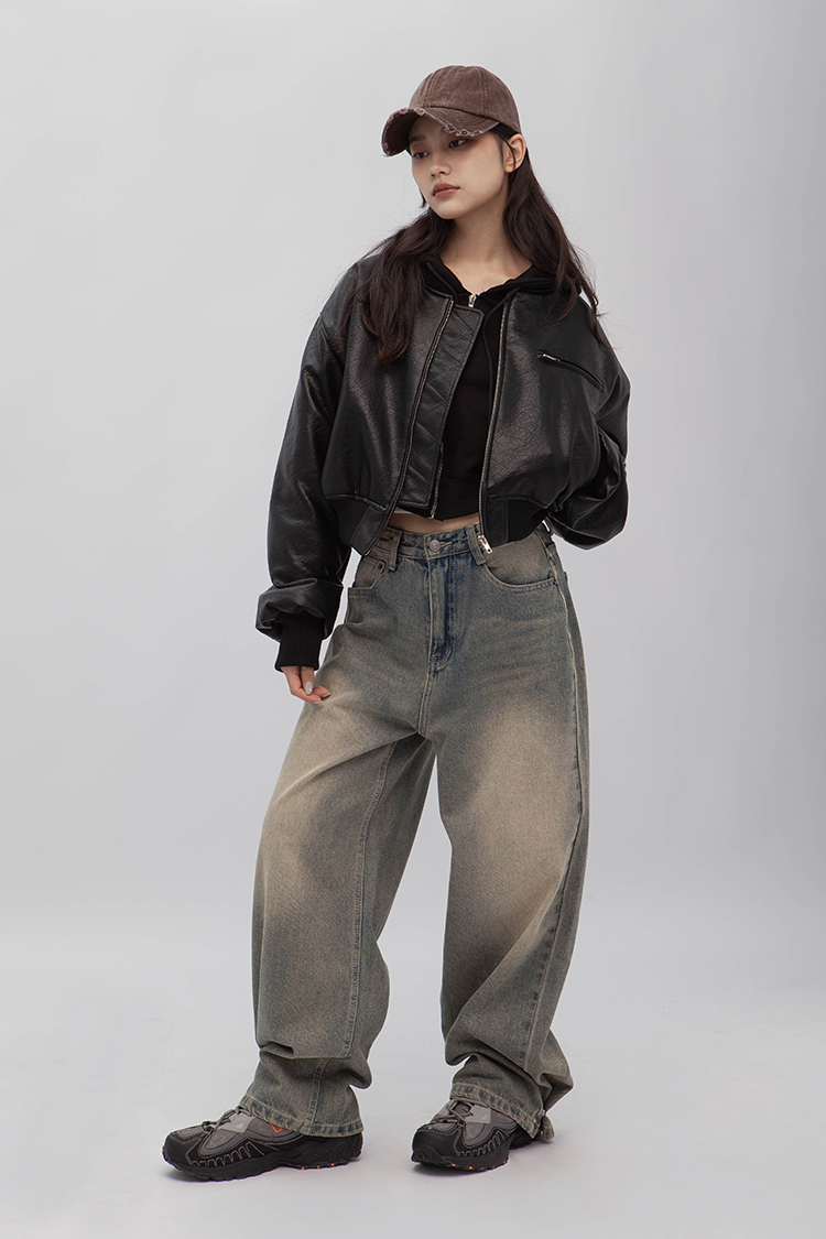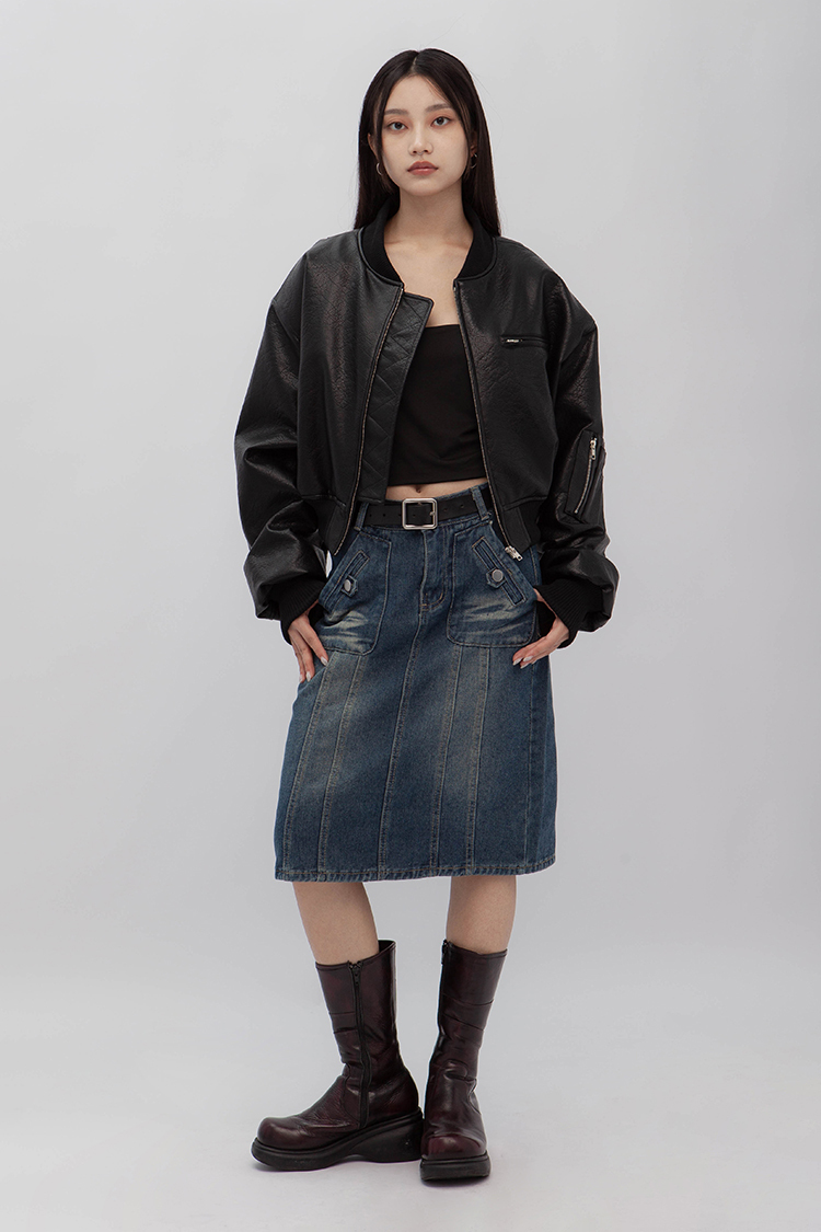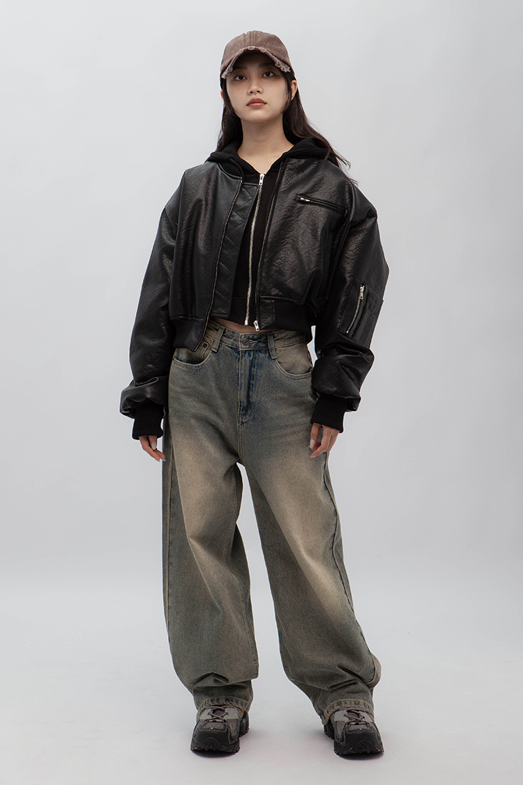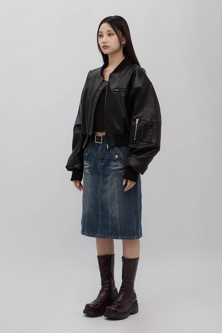 粒面紋理人造皮革,羅紋針織立領、下擺與袖口,微墊肩,拉鍊門襟,左前胸裝飾拉鍊袋,嵌線前口袋,左手臂拉鍊口袋設計,短版,全內裡菱形網格夾棉,率性不羈的狂放感。