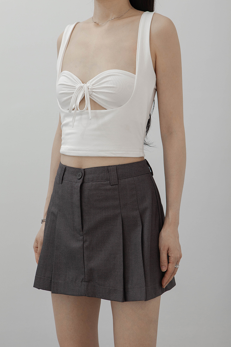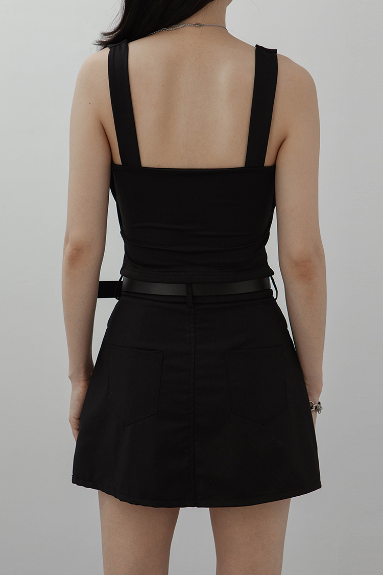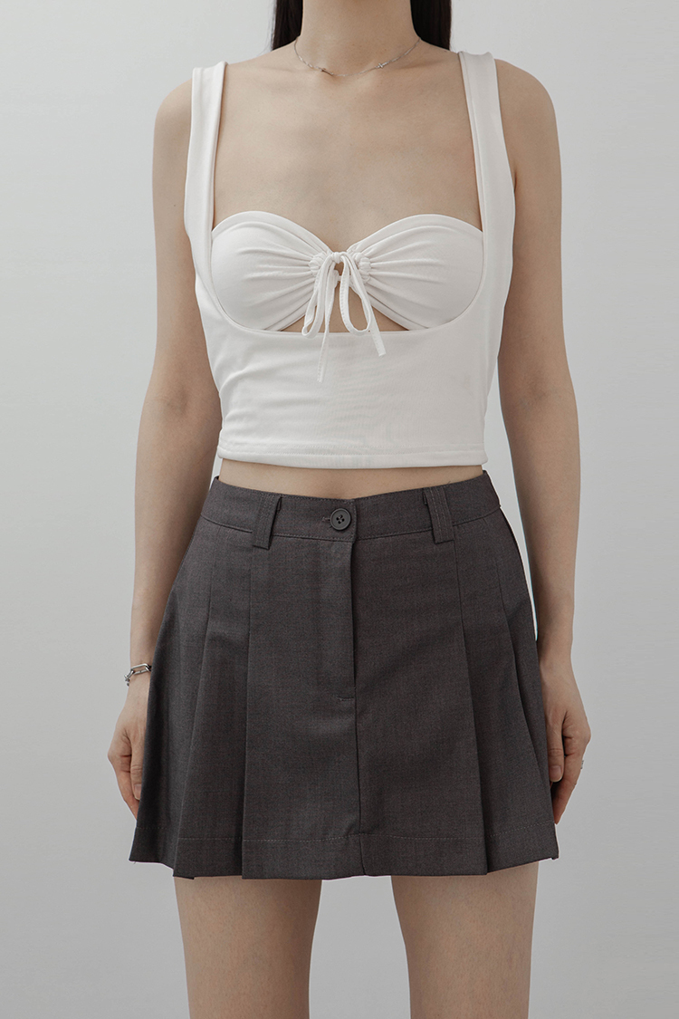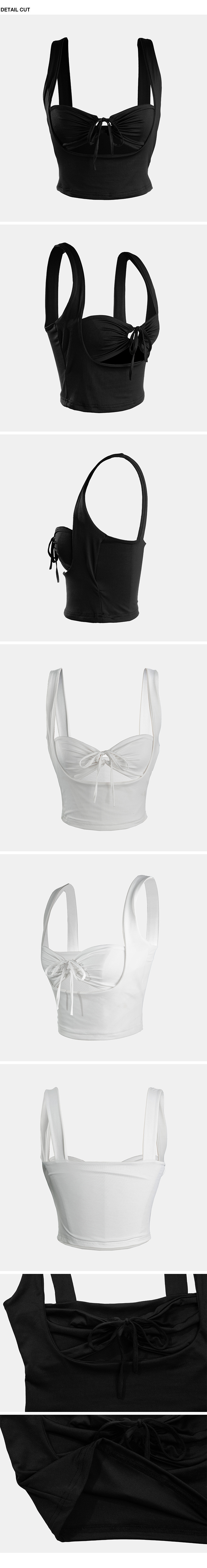 方領,短版無袖背心,一件式綁繩胸罩設計,展現鏤空性感巧思,沒有胸墊,選用良好的彈性與抗皺性材質,這種剪裁特別適合胸型豐滿的女性,能夠展現出迷人的身材曲線。