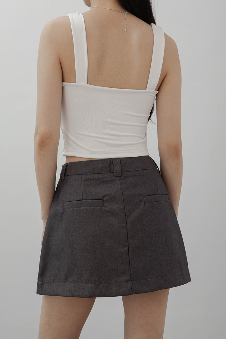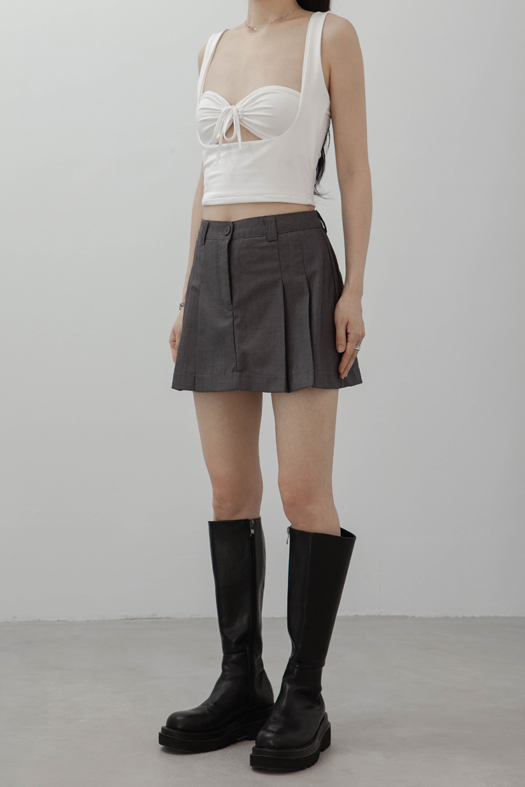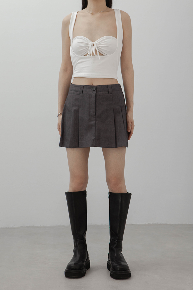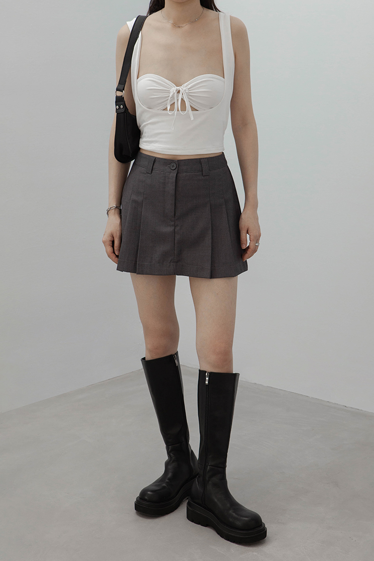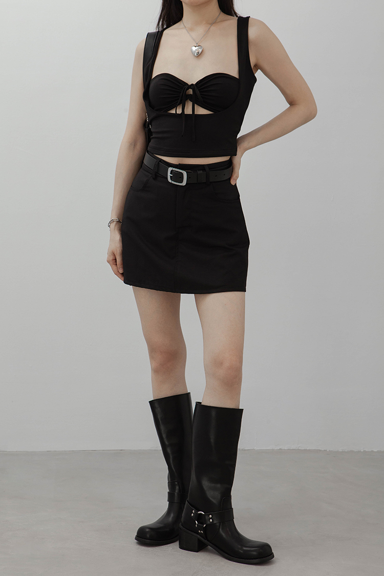 方領,短版無袖背心,一件式綁繩胸罩設計,展現鏤空性感巧思,沒有胸墊,選用良好的彈性與抗皺性材質,這種剪裁特別適合胸型豐滿的女性,能夠展現出迷人的身材曲線。