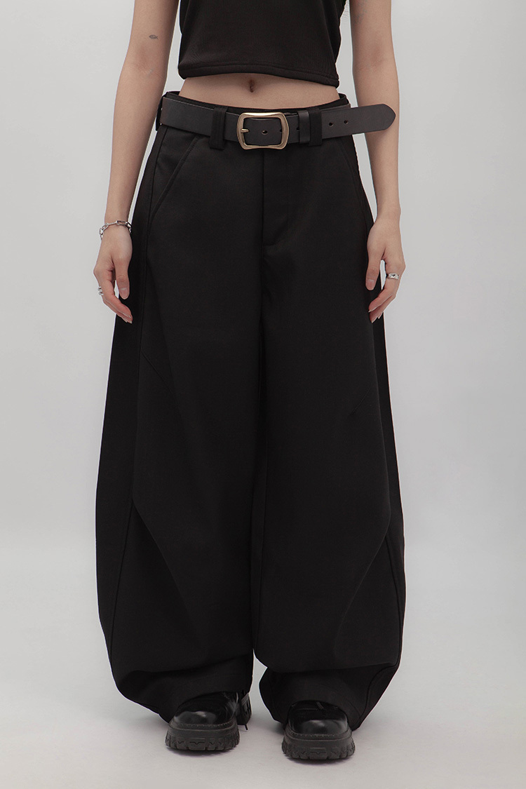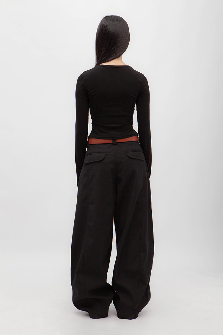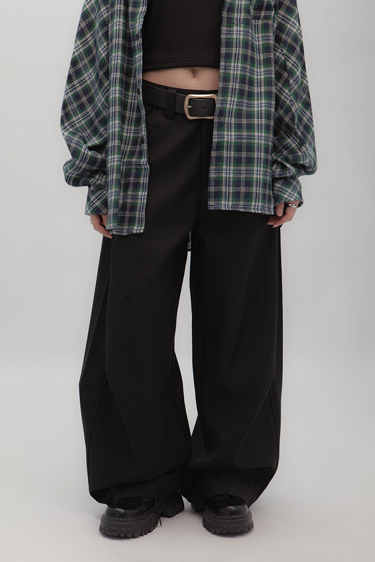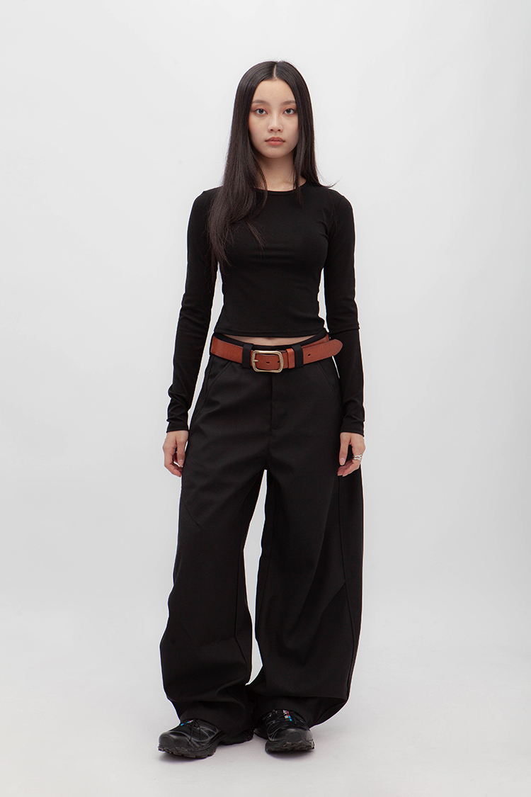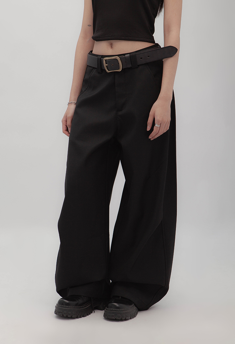 以立體彎刀剪裁為設計重點,透過側邊弧線與份量感褲管,打造結構感強烈的寬鬆輪廓。布料具有挺度與微微重量,手感厚實。褲型自然修飾腿部線條,視覺上提升整體比例,兼具正式與休閒。