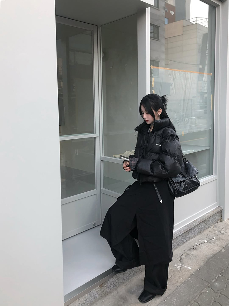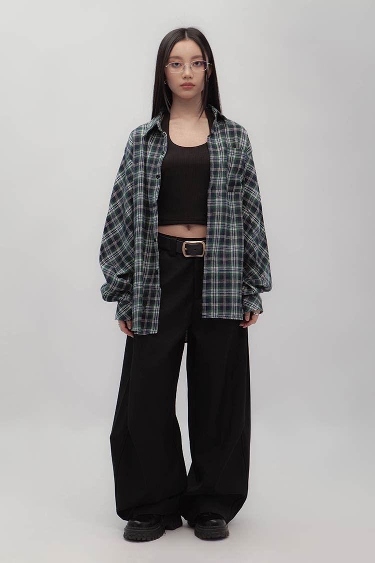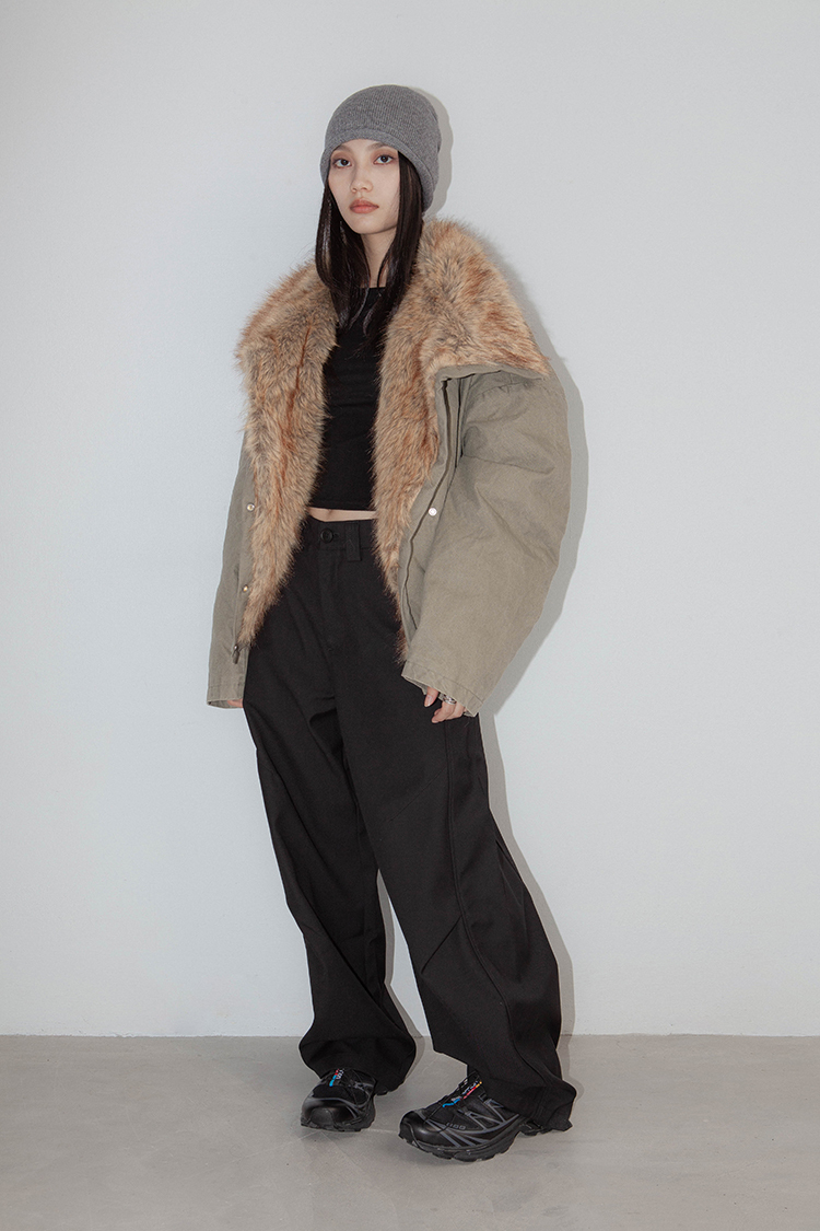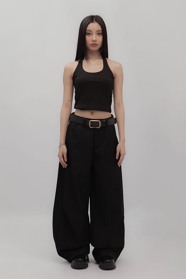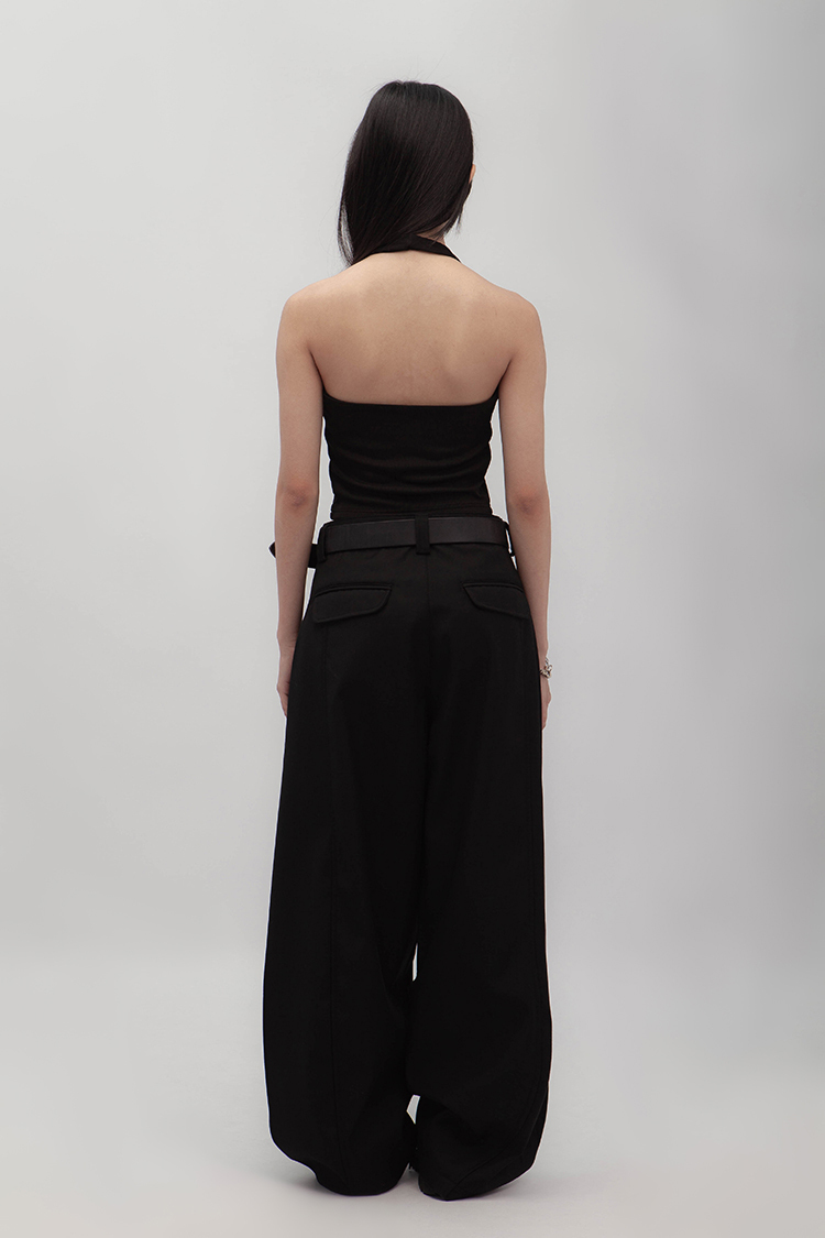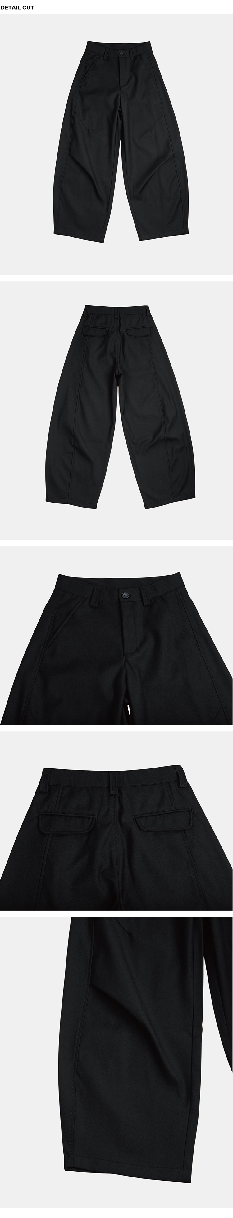 以立體彎刀剪裁為設計重點,透過側邊弧線與份量感褲管,打造結構感強烈的寬鬆輪廓。布料具有挺度與微微重量,手感厚實。褲型自然修飾腿部線條,視覺上提升整體比例,兼具正式與休閒。