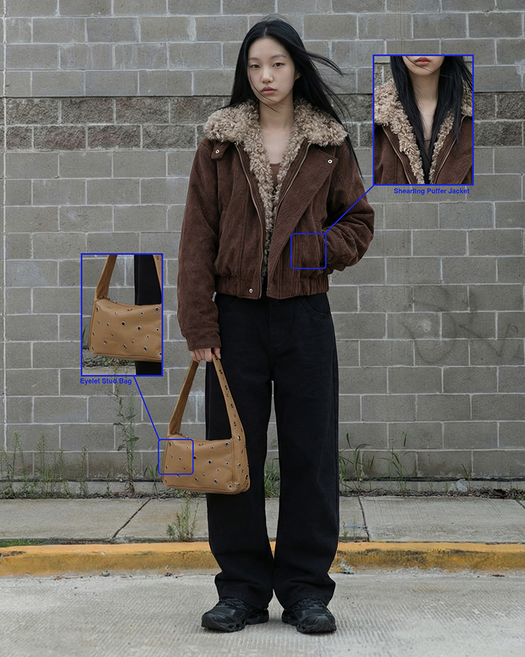 以不規則壓紋皮革呈現出特殊紋理感,表面佈滿金屬圓孔釦飾設計,側面為厚實挺立版型,背面則為無孔設計,保持簡約乾淨。袋身容量適中,內裡含拉鍊開口,方便收納日常小物。單肩或手提皆為日常造型增添亮點。