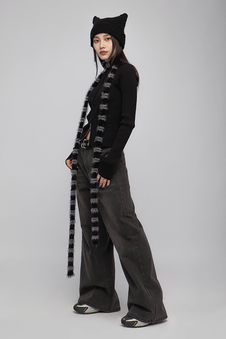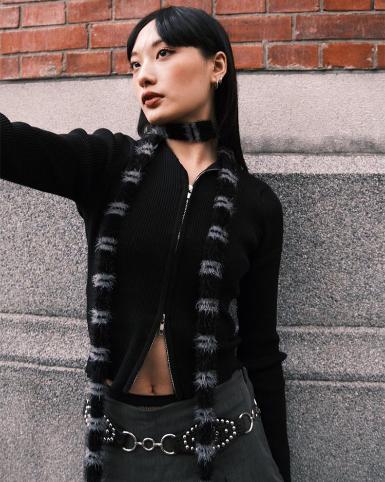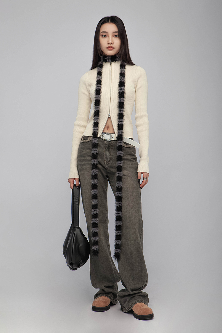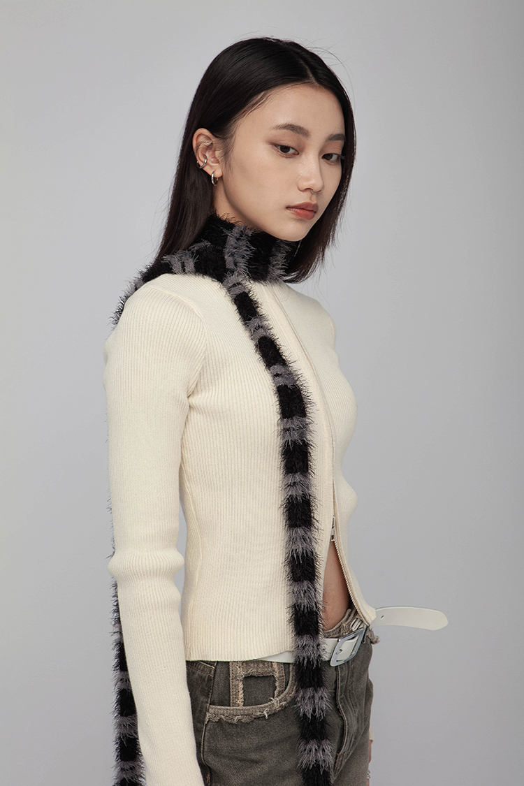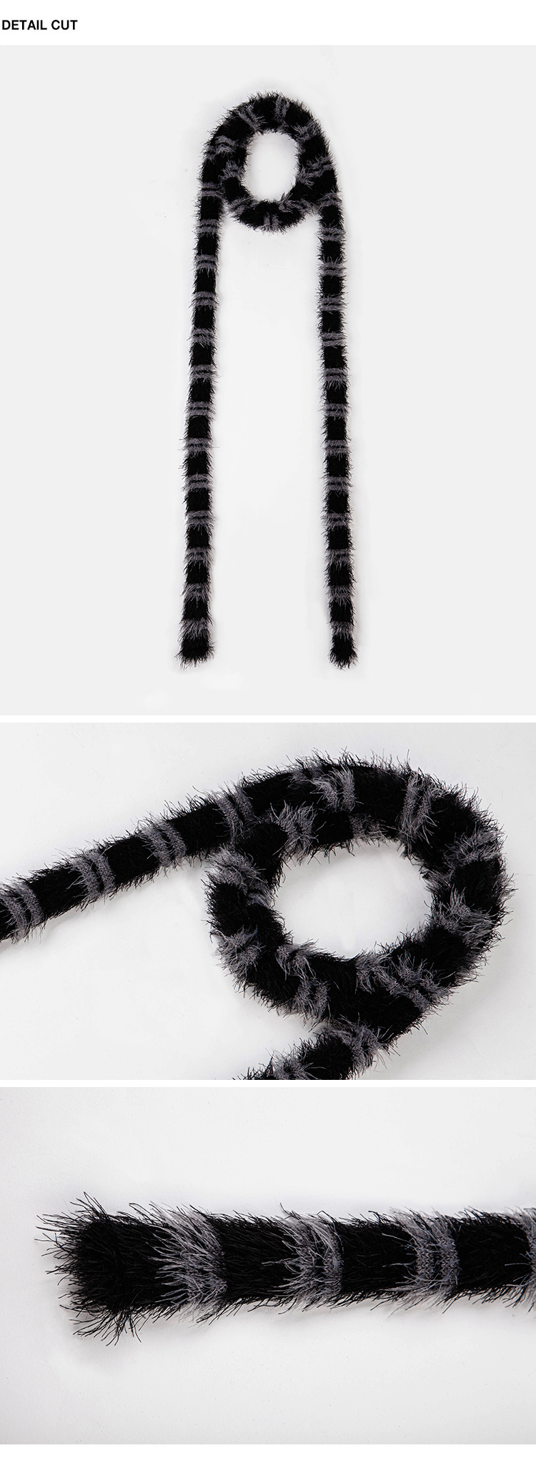 毛絨加長圍巾,柔軟羽毛紗製成,獨特細窄與加長的設計,巧妙地以黑色為底,搭配著銀色環形圖案,帶來時髦與溫暖的完美結合。