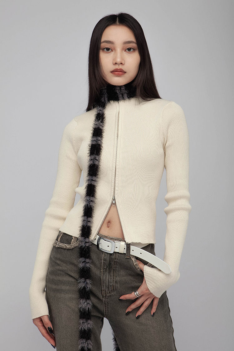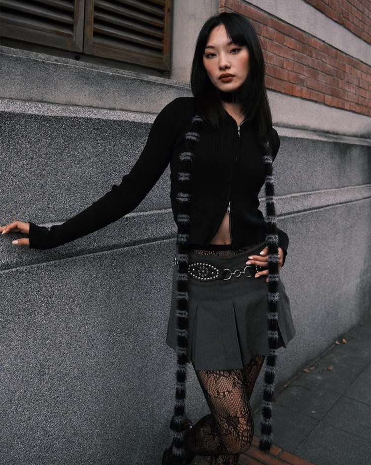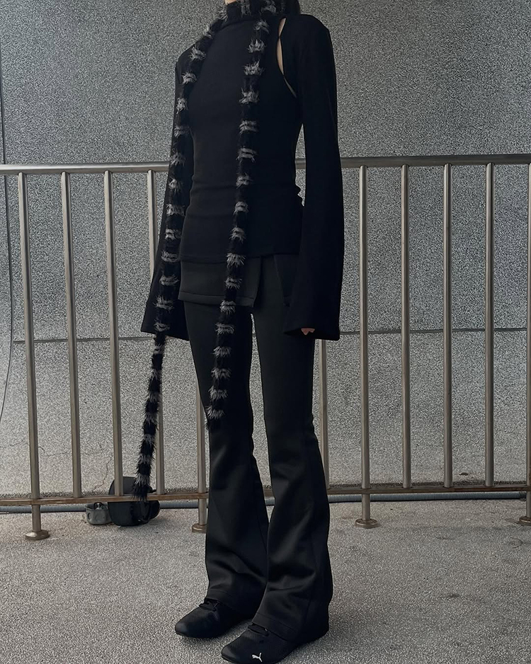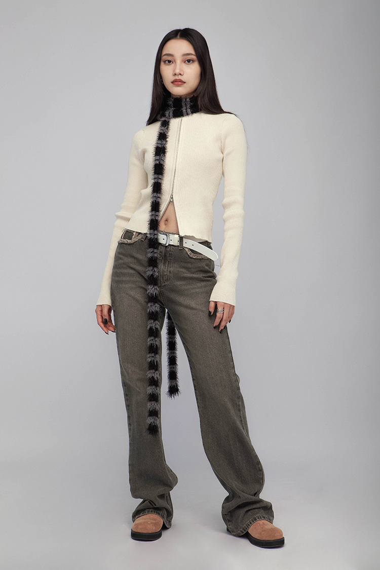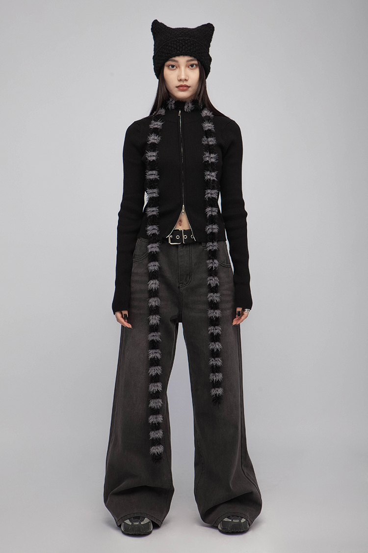 毛絨加長圍巾,柔軟羽毛紗製成,獨特細窄與加長的設計,巧妙地以黑色為底,搭配著銀色環形圖案,帶來時髦與溫暖的完美結合。