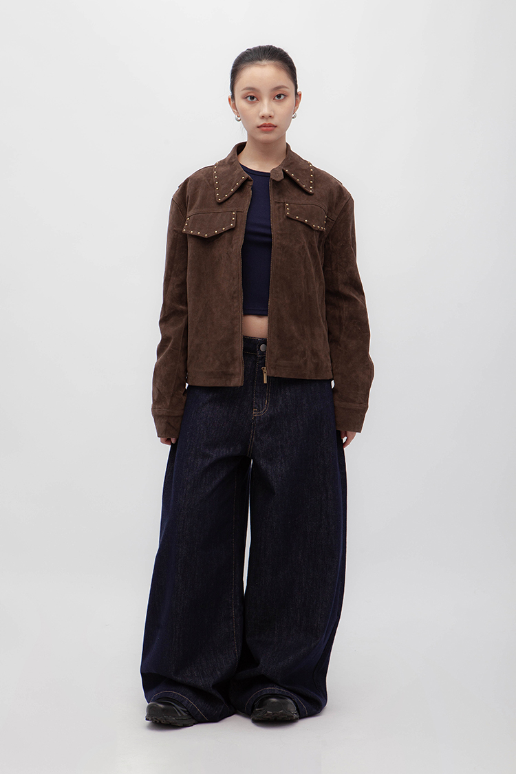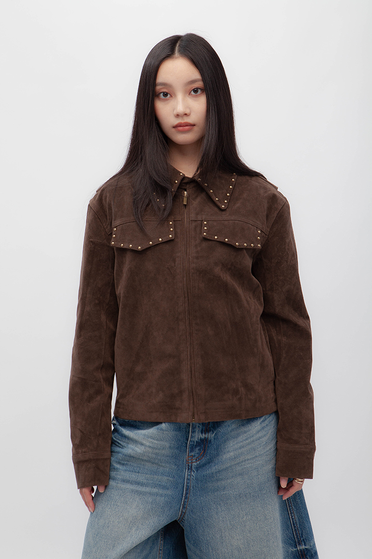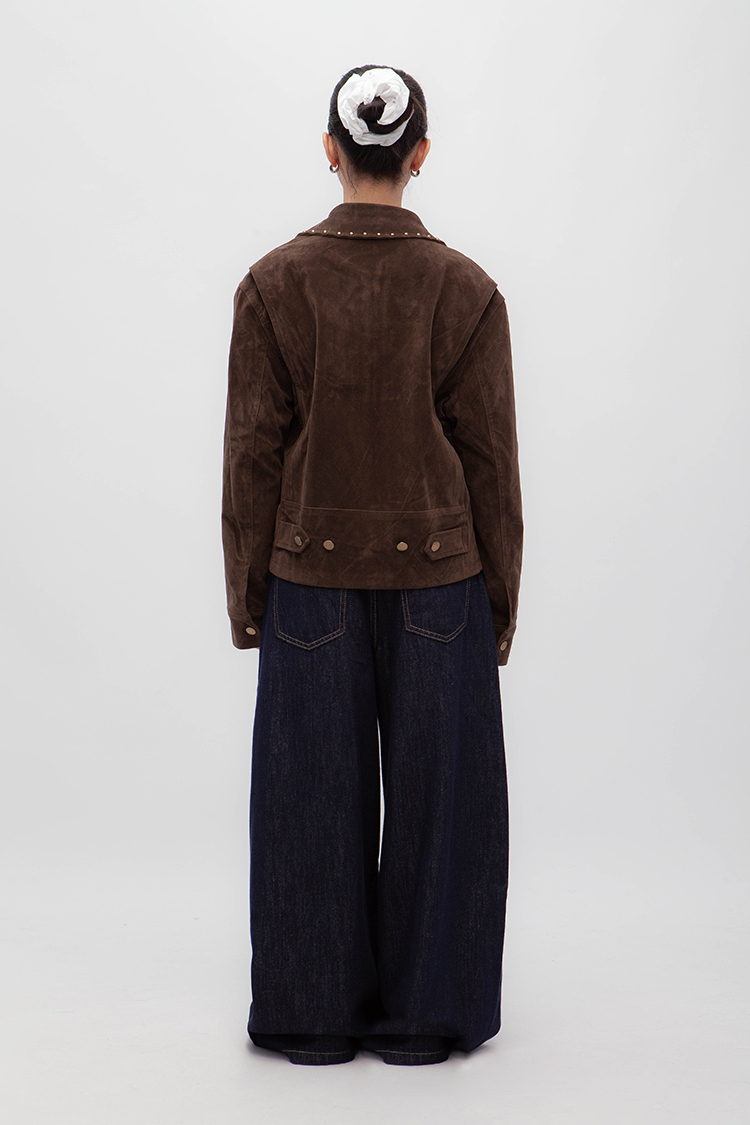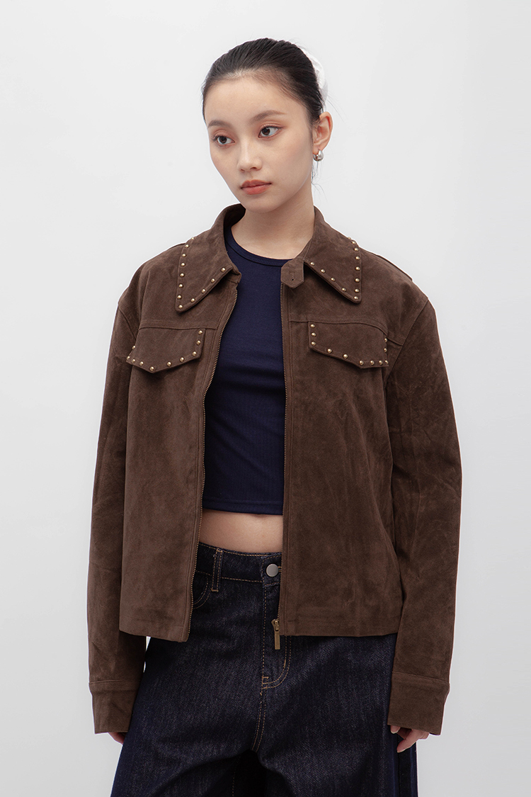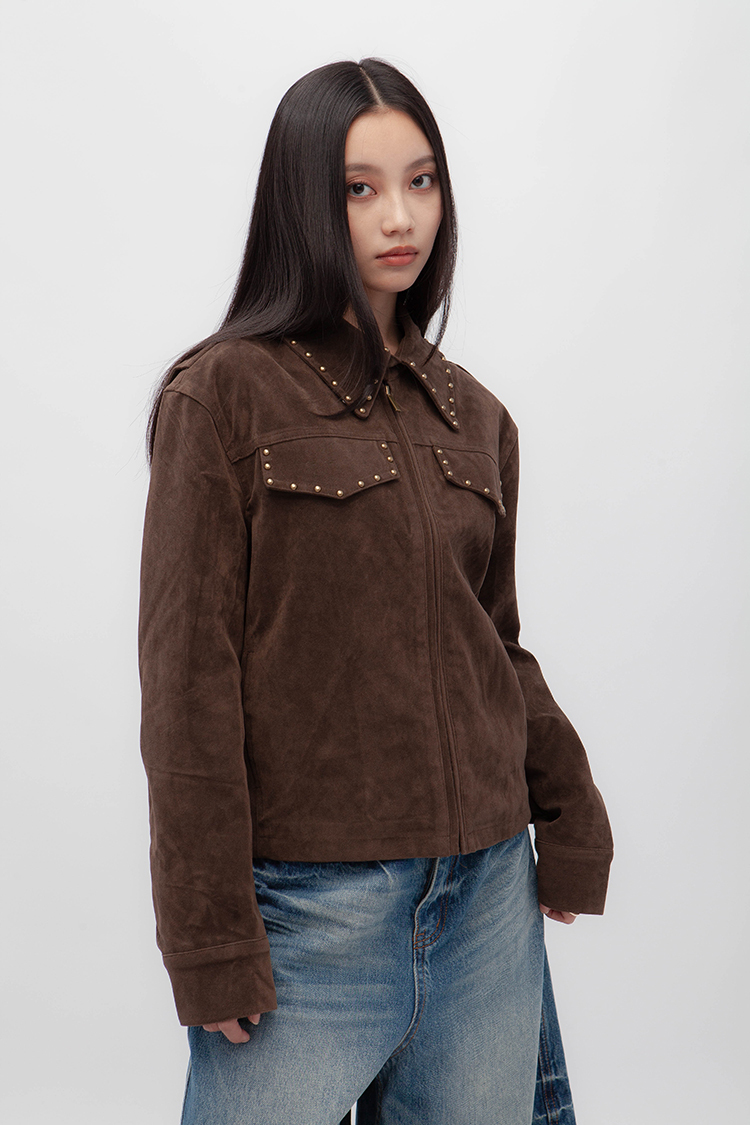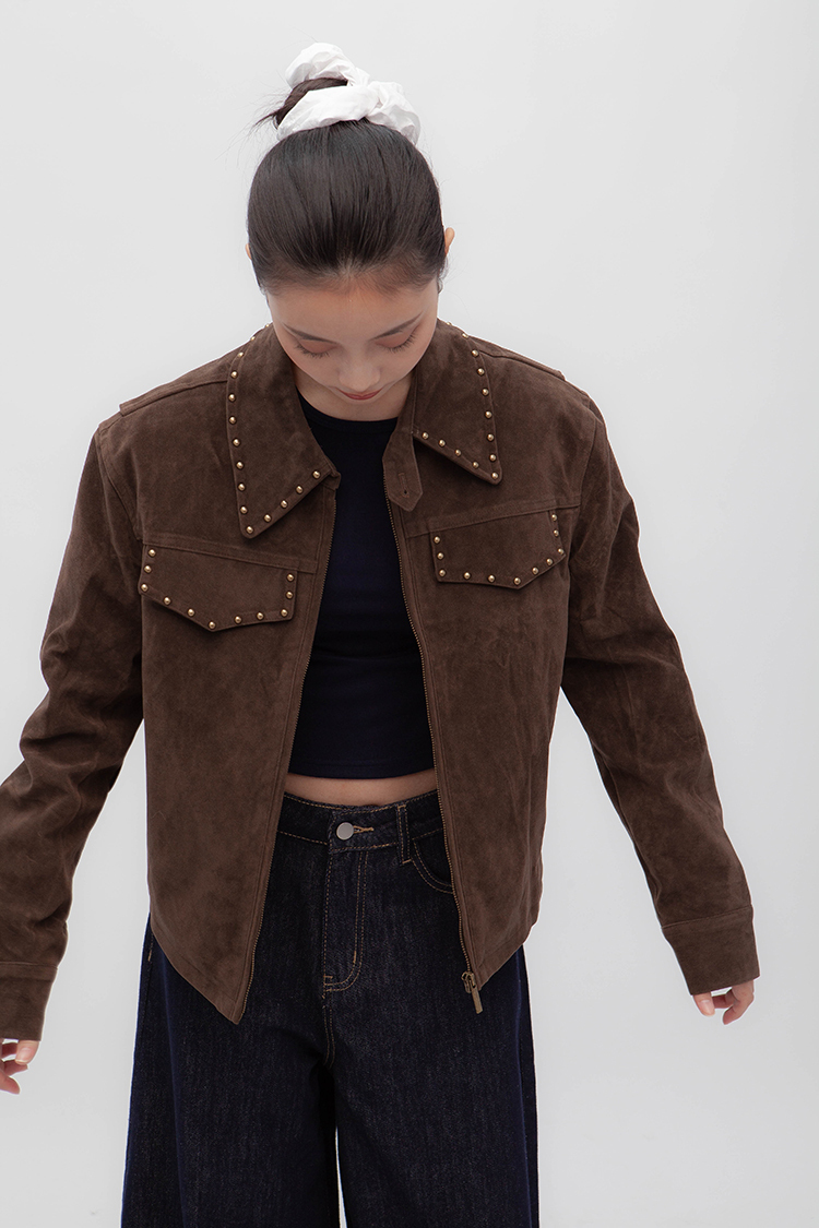 仿麂皮的細緻絨毛質感帶出粗紋理的帥氣氛圍,翻領與口袋上的金屬釘飾更強化 cowboy 風格。剪裁直接拉長比例,小個子穿也剛剛好,套上就有型,外出搭配超輕鬆。