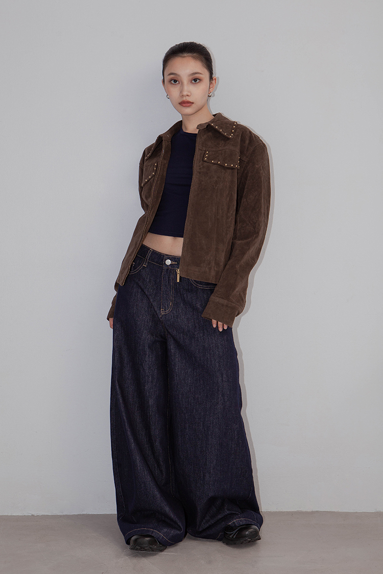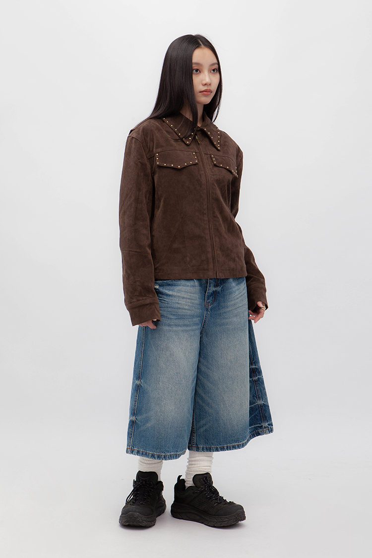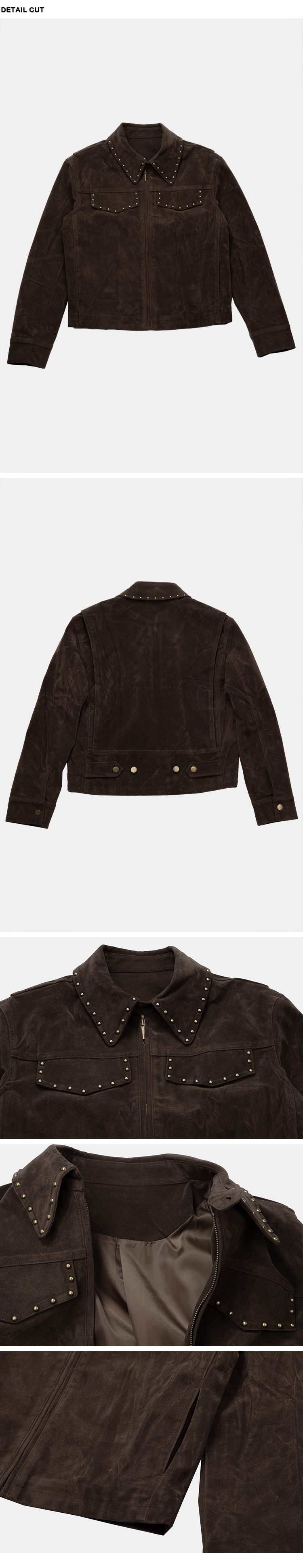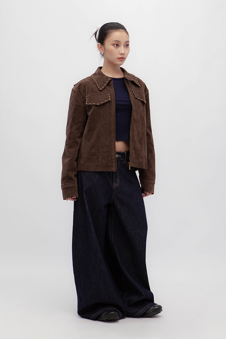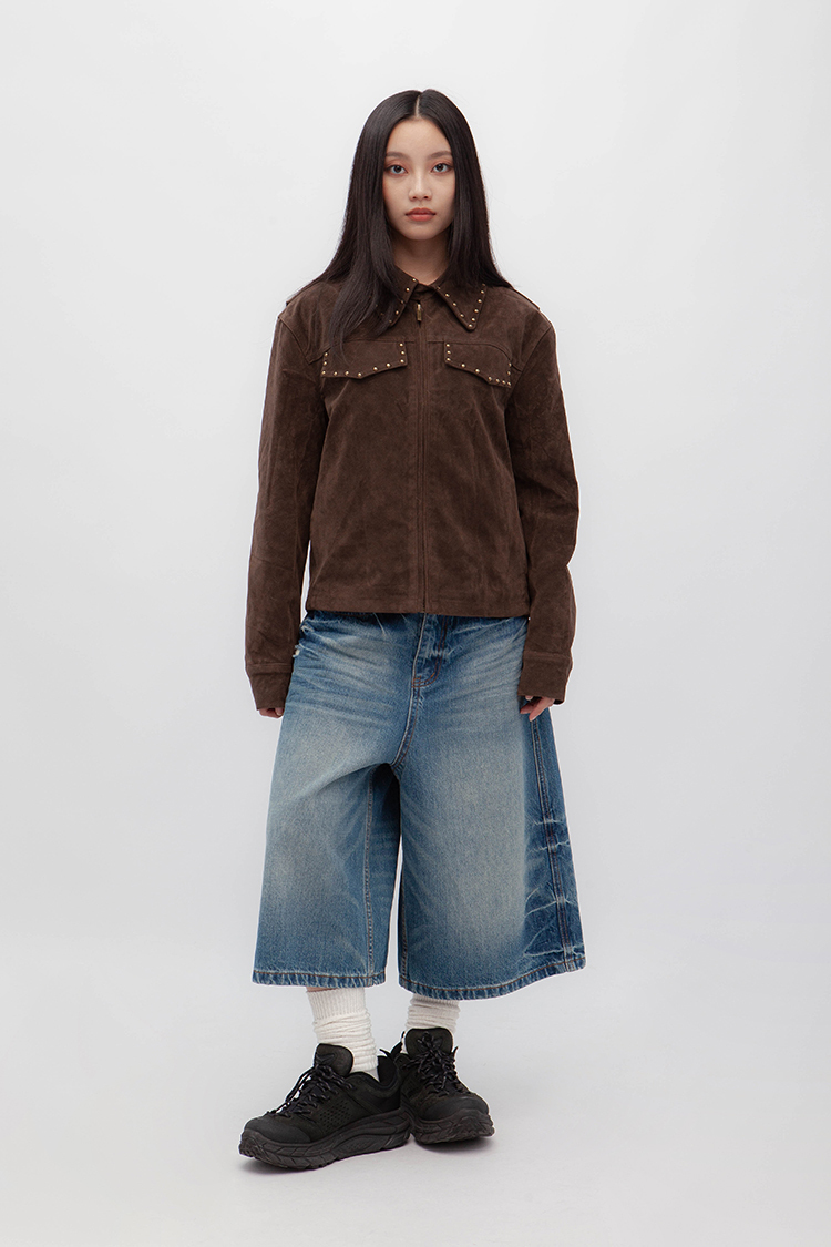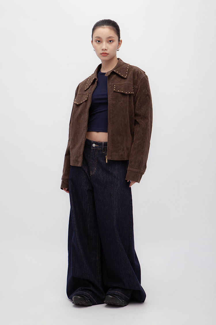 仿麂皮的細緻絨毛質感帶出粗紋理的帥氣氛圍,翻領與口袋上的金屬釘飾更強化 cowboy 風格。剪裁直接拉長比例,小個子穿也剛剛好,套上就有型,外出搭配超輕鬆。