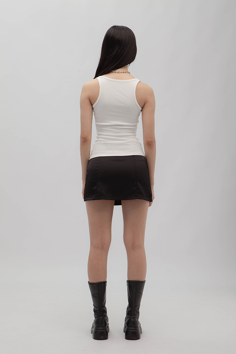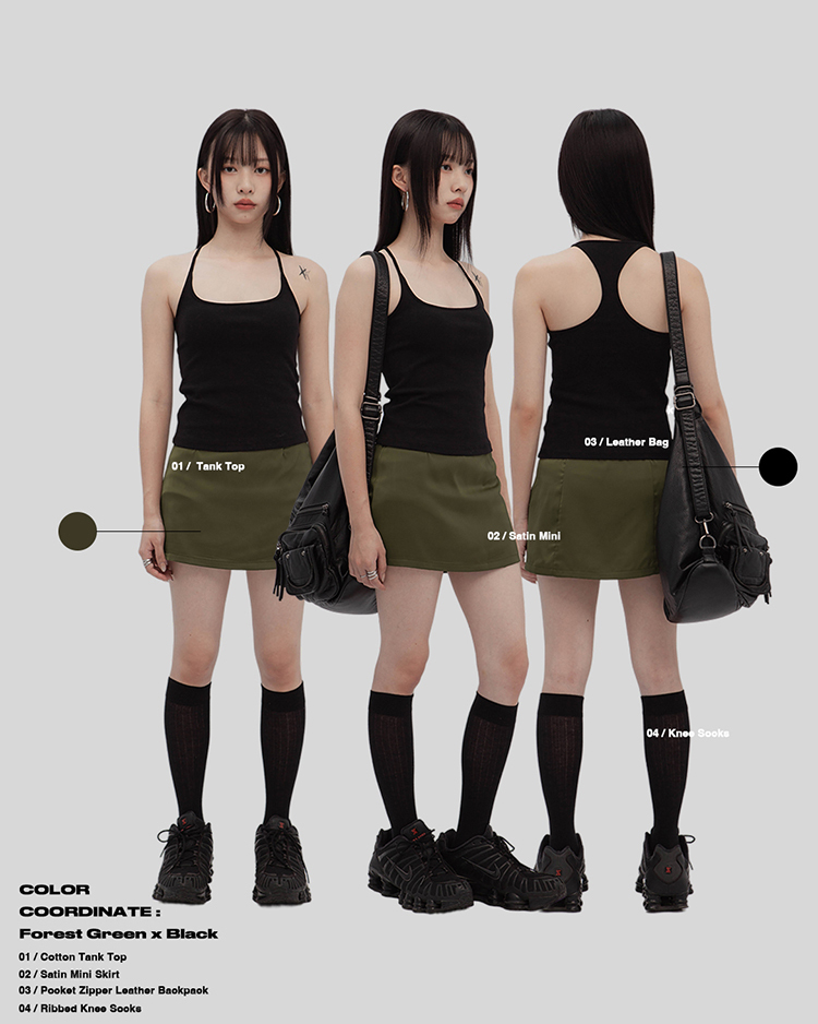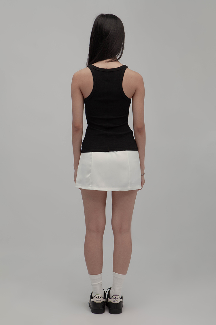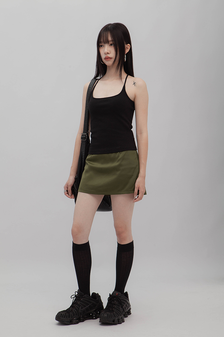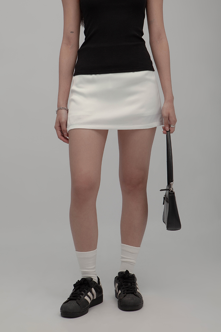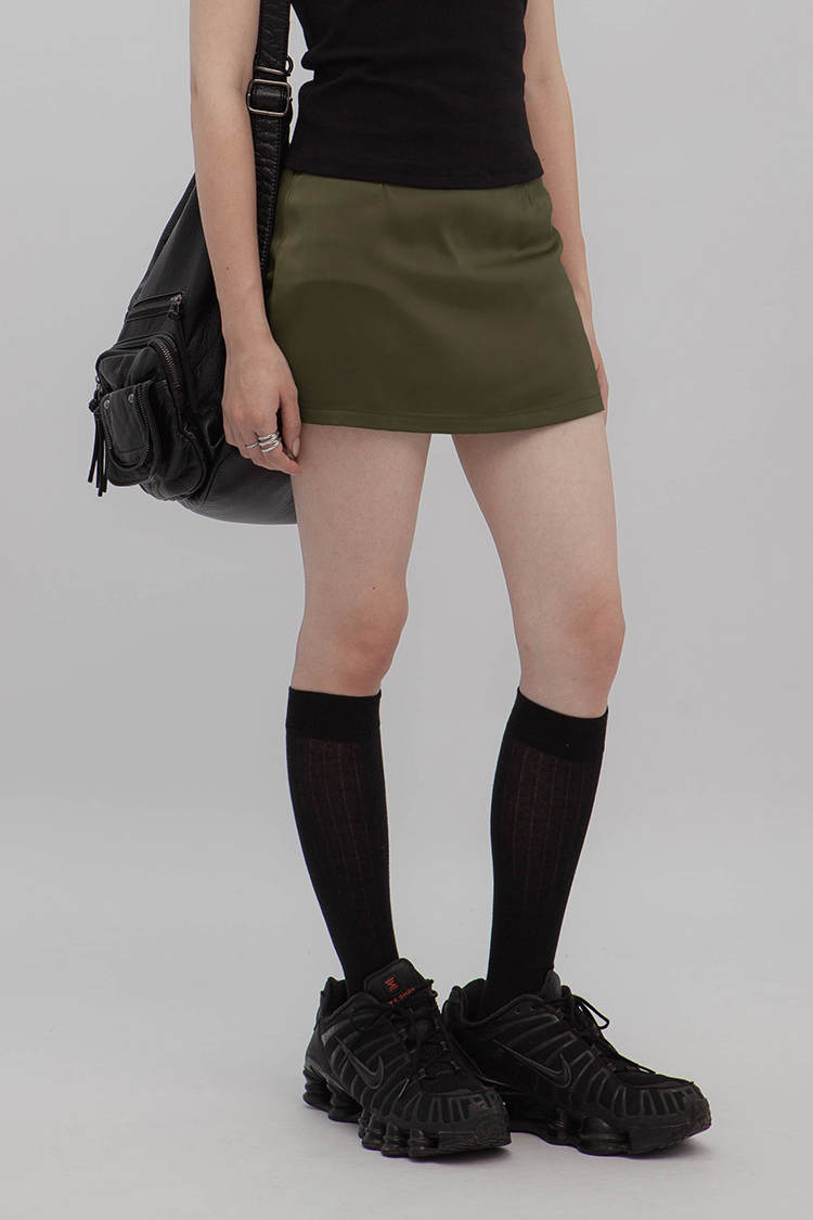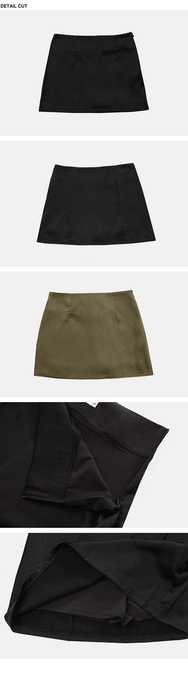 高腰剪裁,A字版型,前面與後面打褶縫線,左側隱形半拉鍊,光澤緞面增添柔美感,提供良好的包覆性,夏日輕盈材質,帶來涼爽與舒適的體驗,全黑色調,無彈性,內含安全褲,穿著更加便利,經典細緻小黑裙。