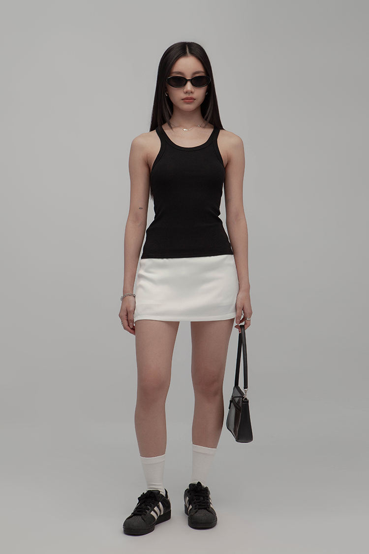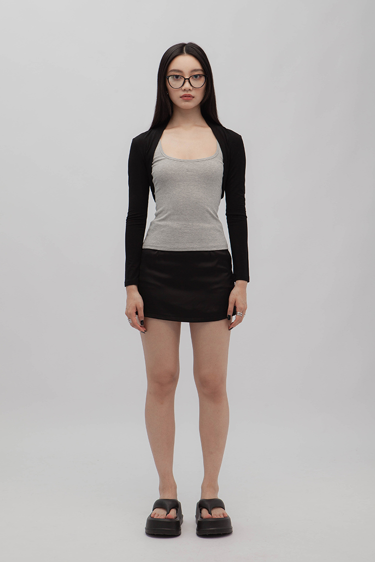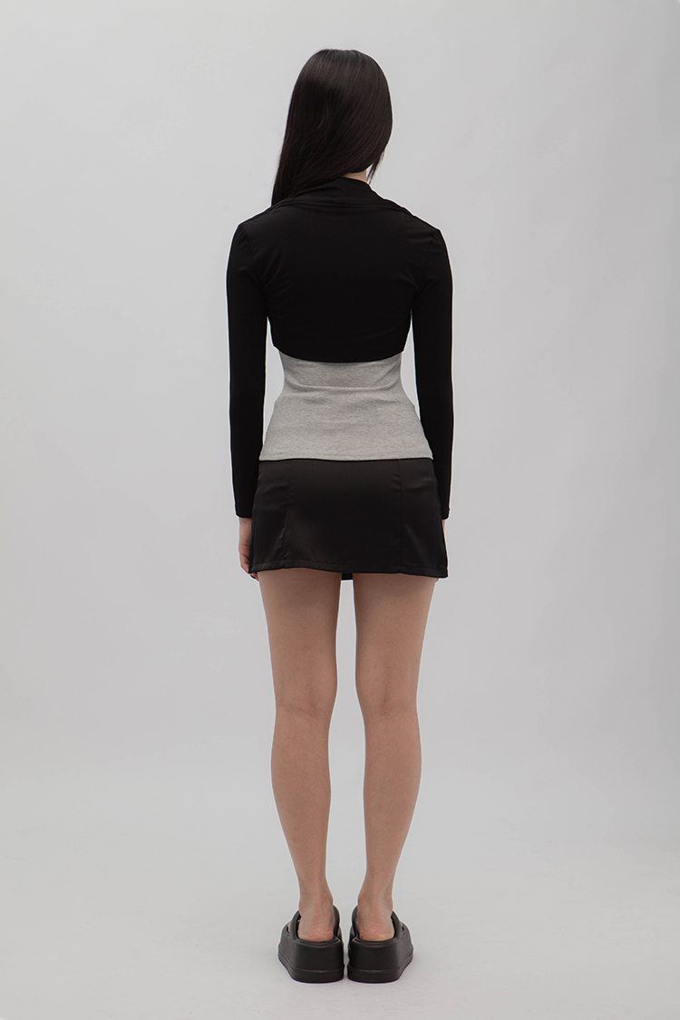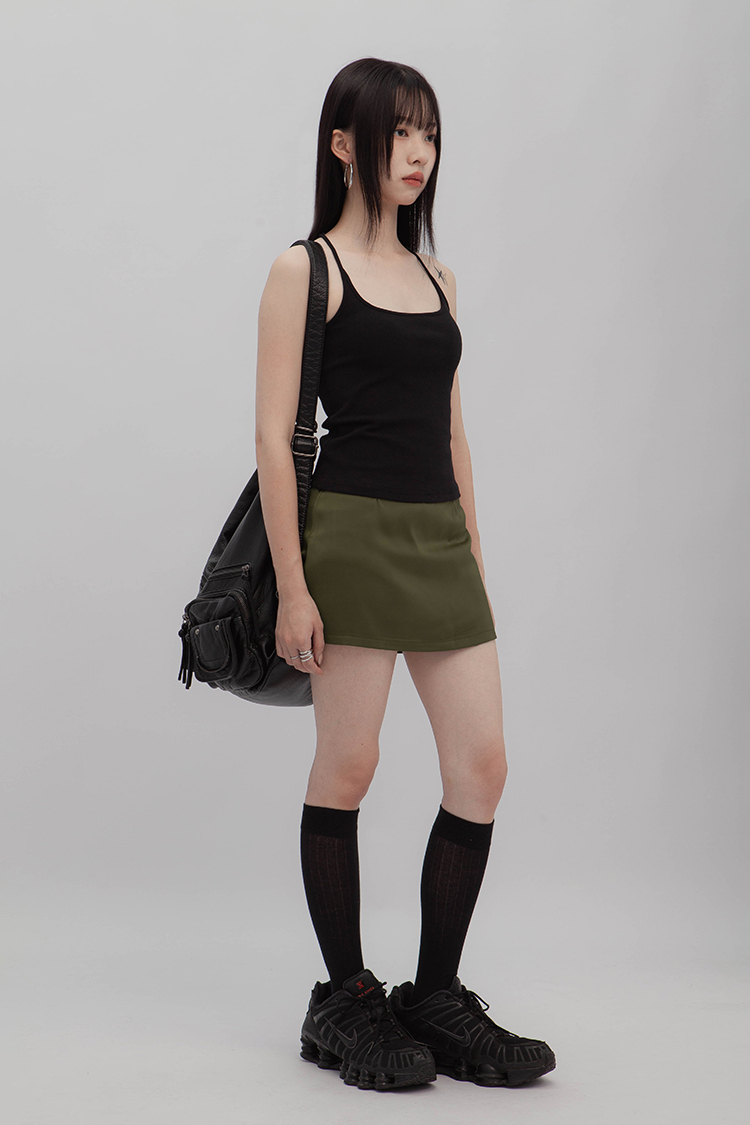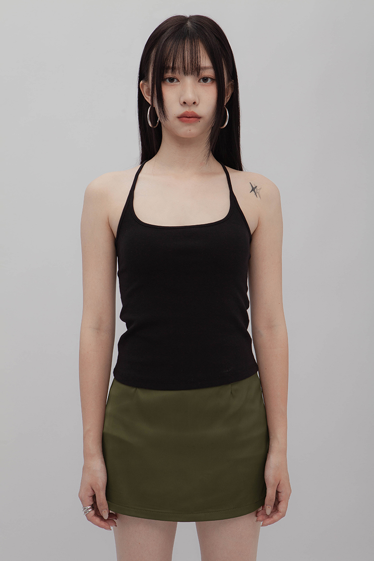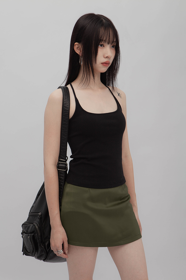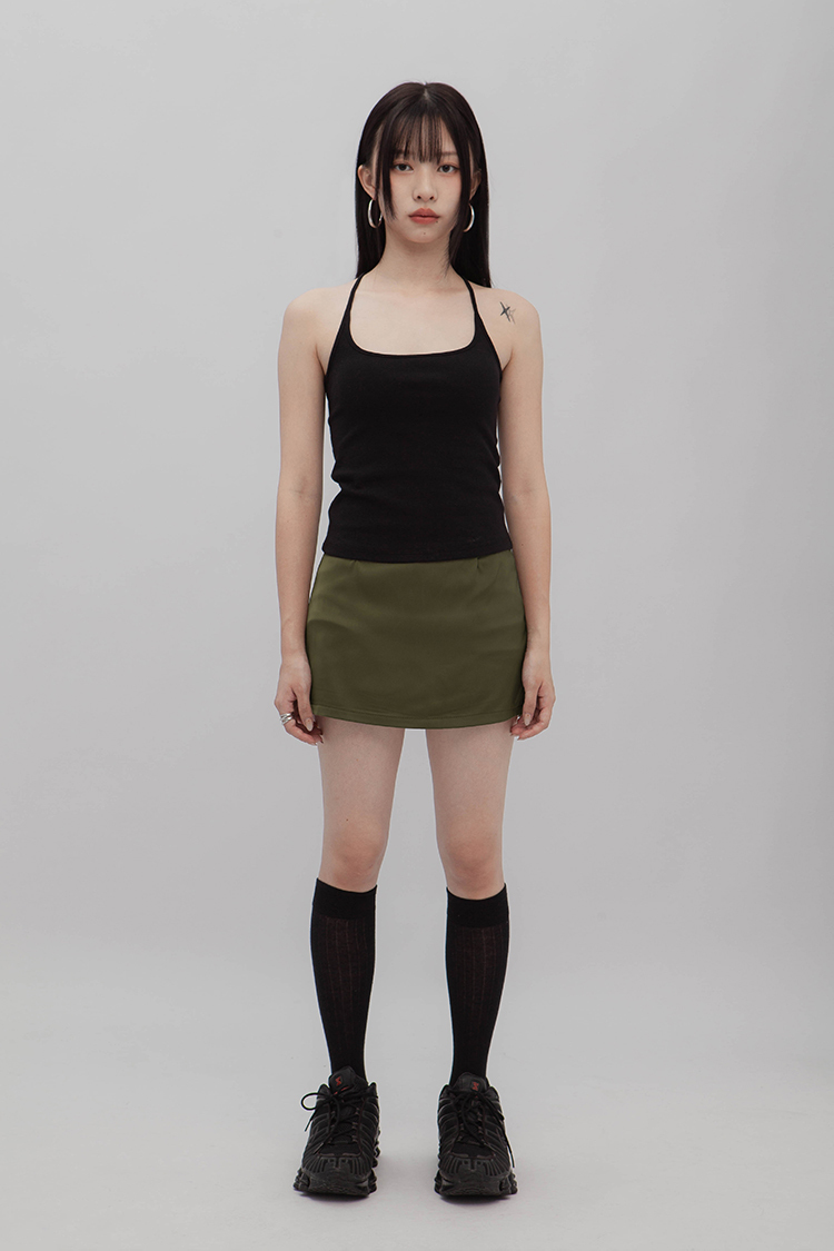 高腰剪裁,A字版型,前面與後面打褶縫線,左側隱形半拉鍊,光澤緞面增添柔美感,提供良好的包覆性,夏日輕盈材質,帶來涼爽與舒適的體驗,全黑色調,無彈性,內含安全褲,穿著更加便利,經典細緻小黑裙。
