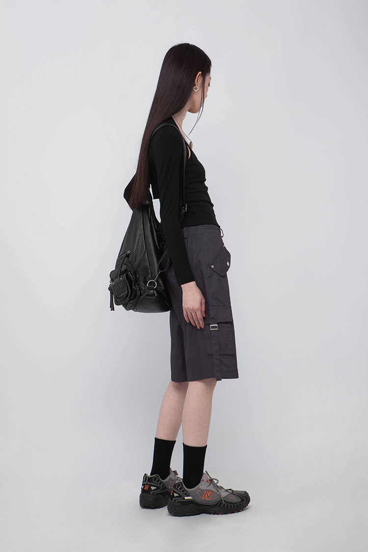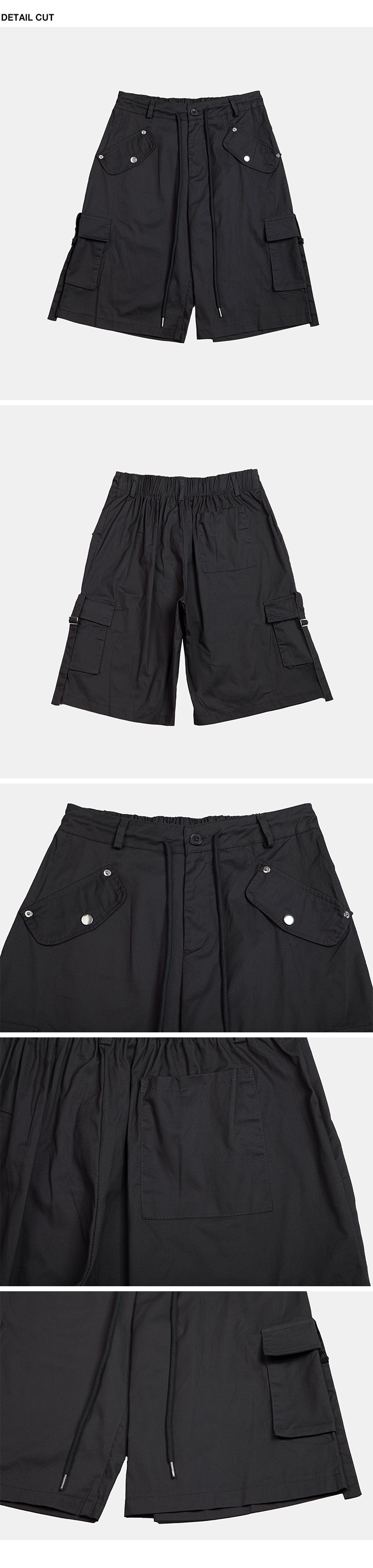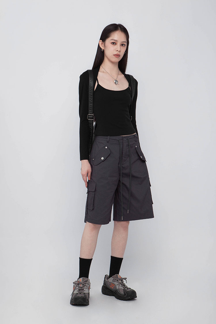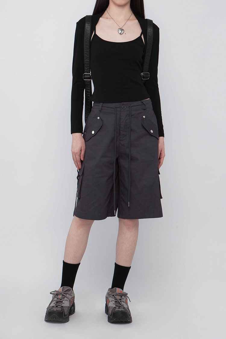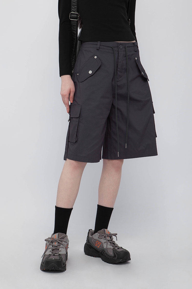 灰色工裝短褲,鬆緊褲頭,抽繩鈕釦拉鍊閉合,皮帶環,多口袋設計,全棉材質,輕膚觸感。