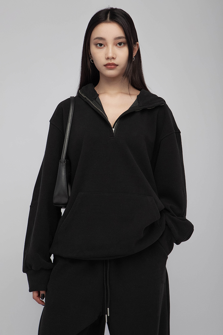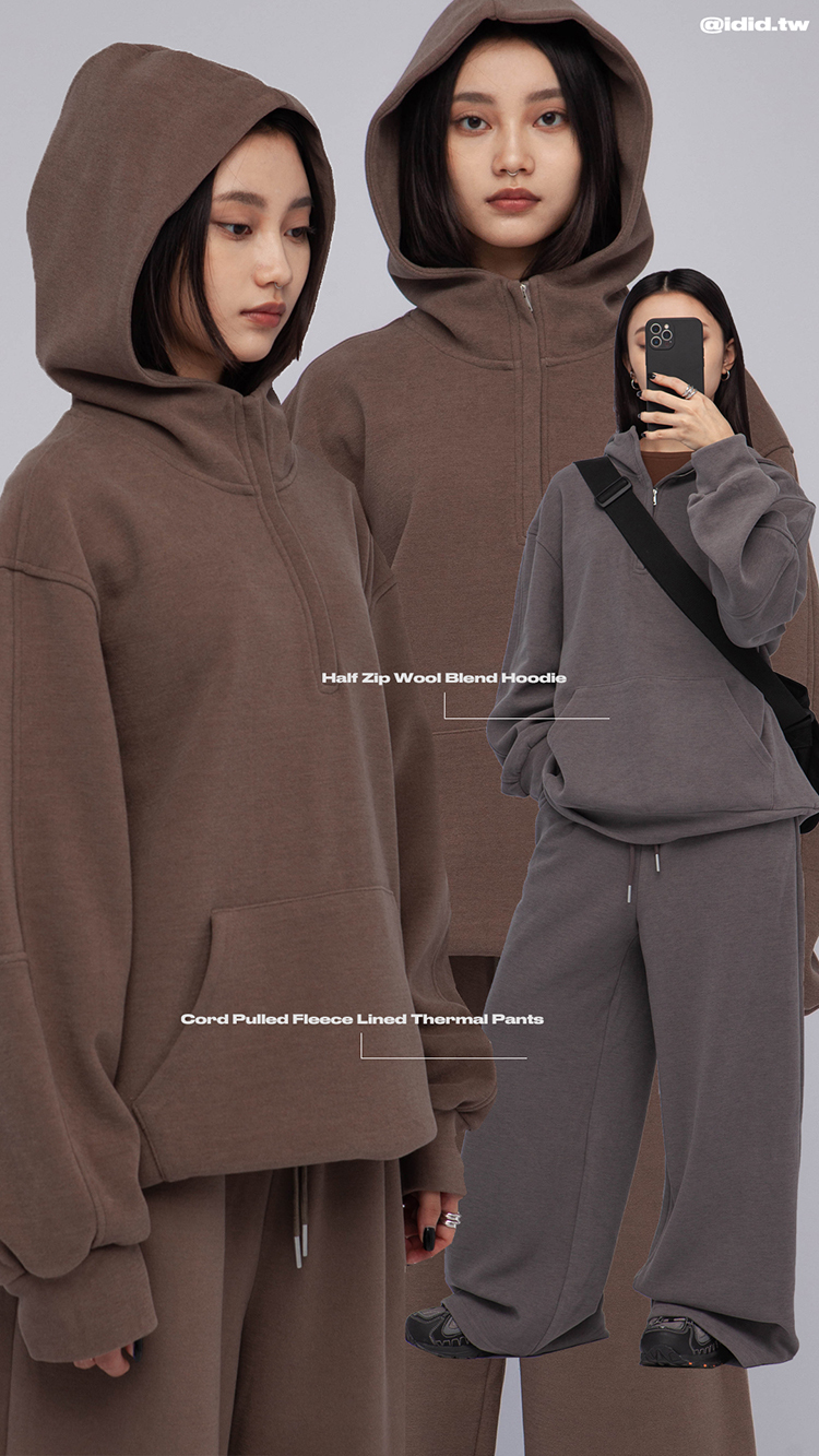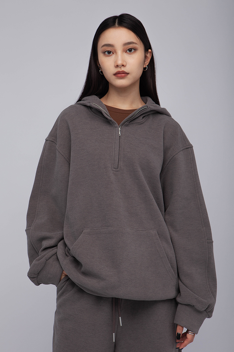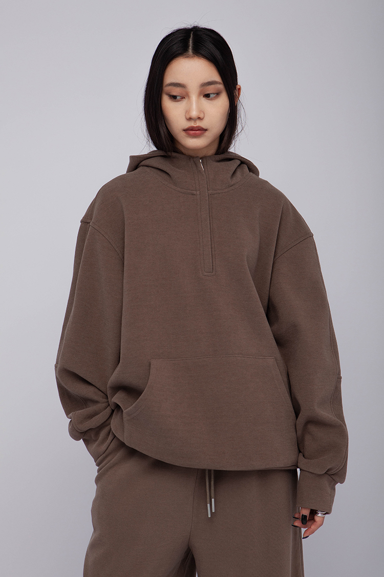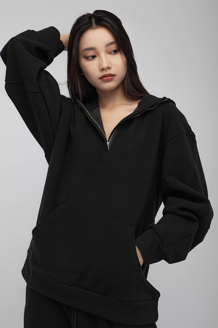長袖連帽運動衫,前襟半拉鍊,散發著一種透肌微辣的氛圍,設計帶有實用性的袋鼠口袋,布料選用高品質的羊毛與棉質混紡,確保柔軟親膚的觸感,抓絨保暖效果,寬鬆落肩設計展現慵懶的風格,帶來自在的穿著感受,在日常生活中輕鬆自如。