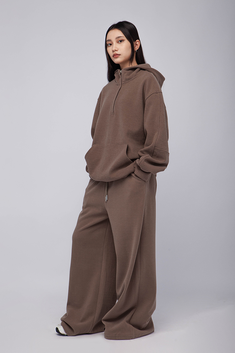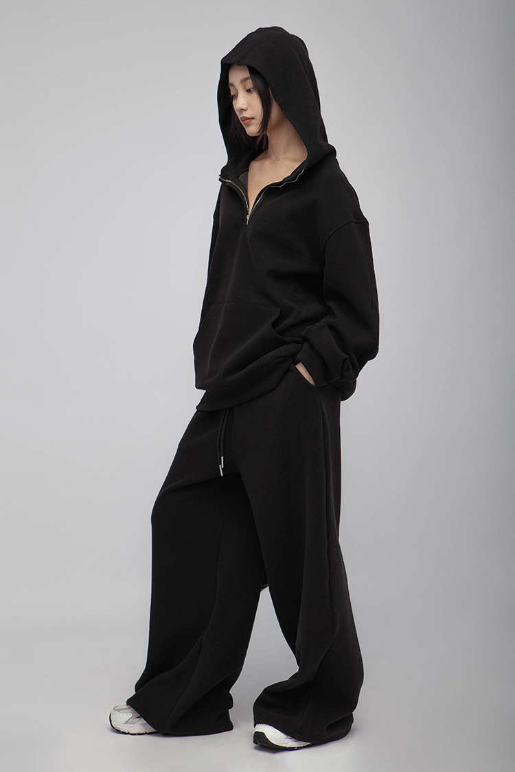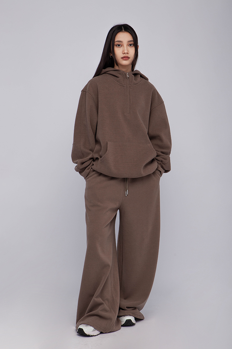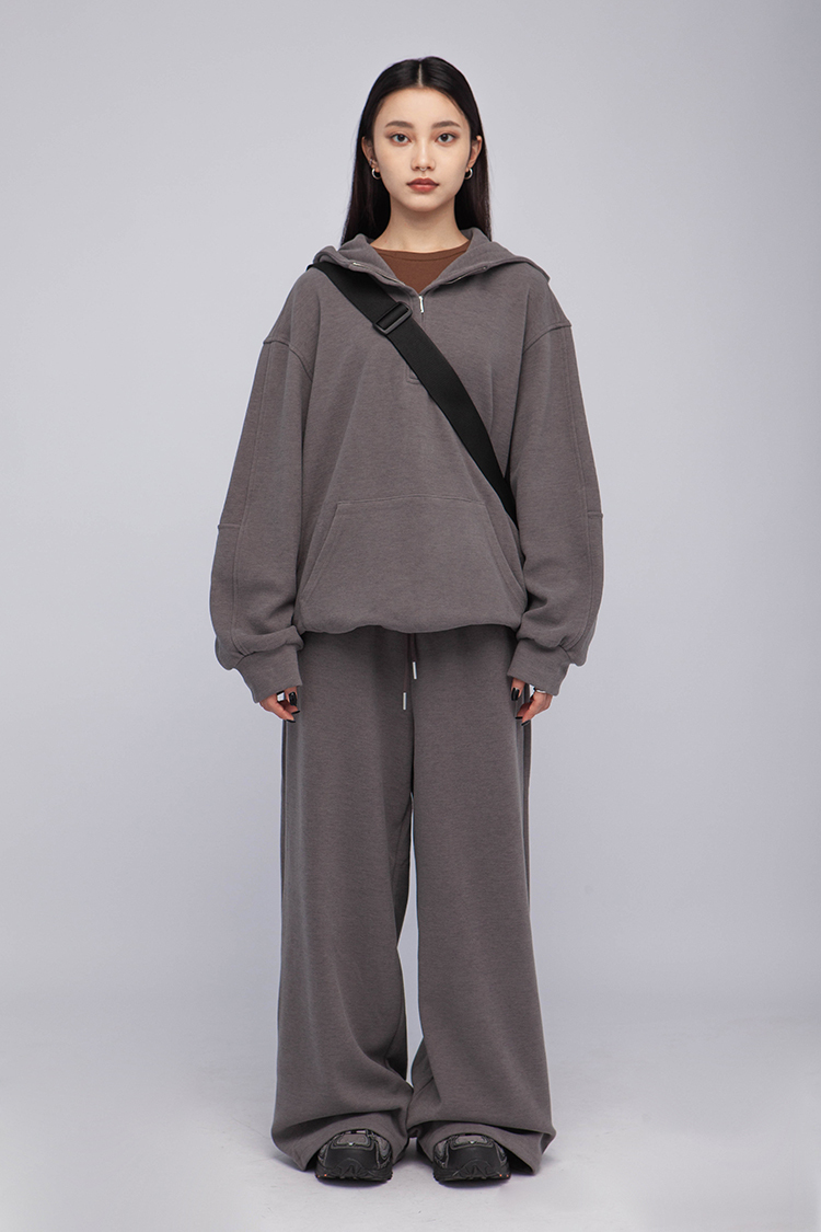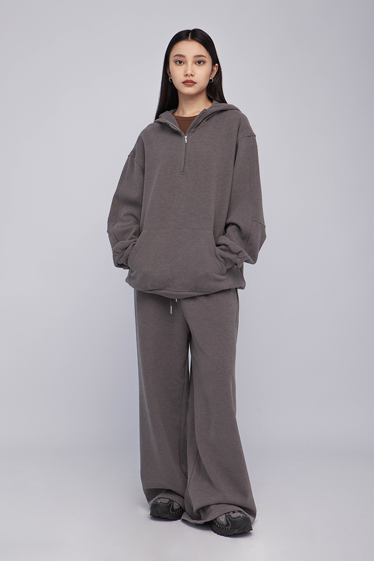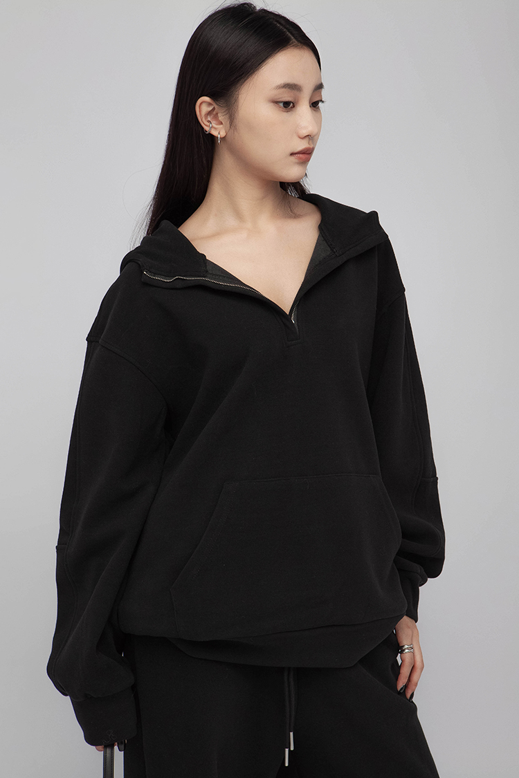長袖連帽運動衫,前襟半拉鍊,散發著一種透肌微辣的氛圍,設計帶有實用性的袋鼠口袋,布料選用高品質的羊毛與棉質混紡,確保柔軟親膚的觸感,抓絨保暖效果,寬鬆落肩設計展現慵懶的風格,帶來自在的穿著感受,在日常生活中輕鬆自如。