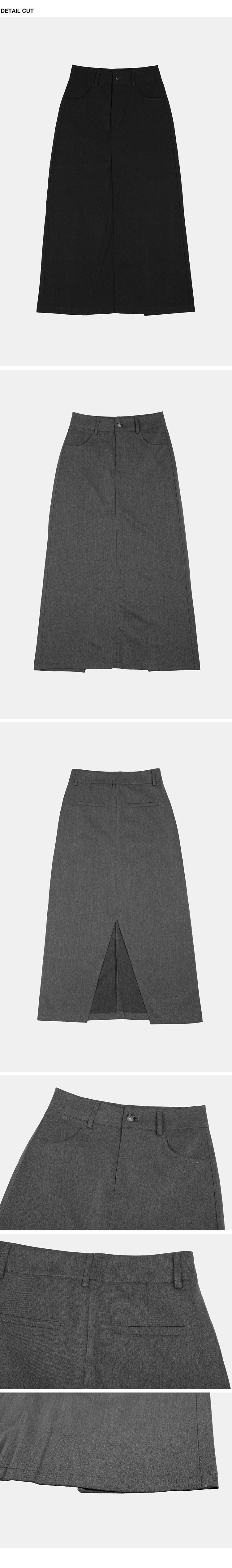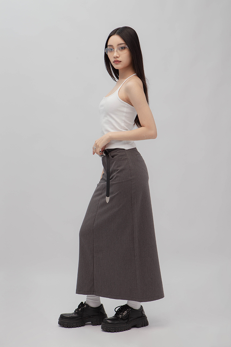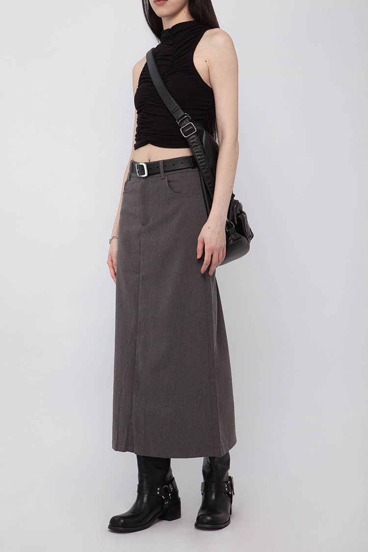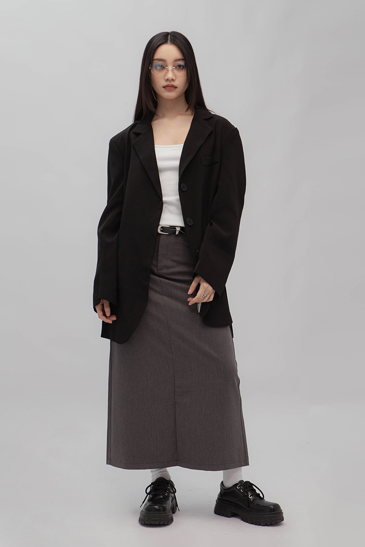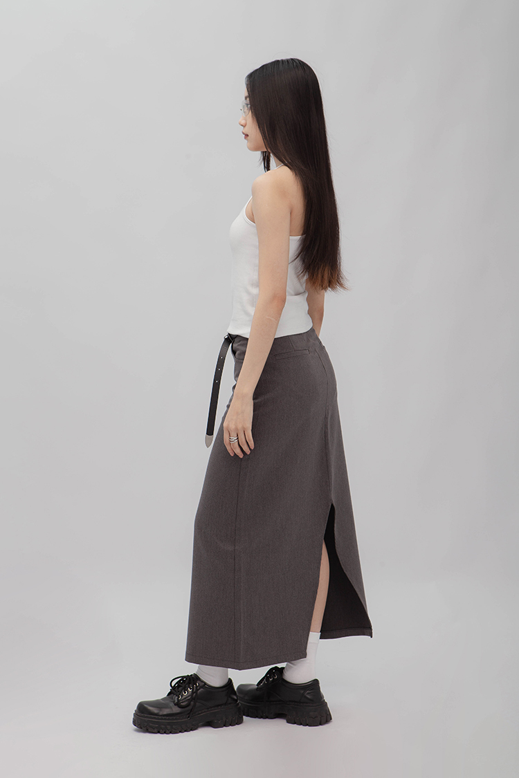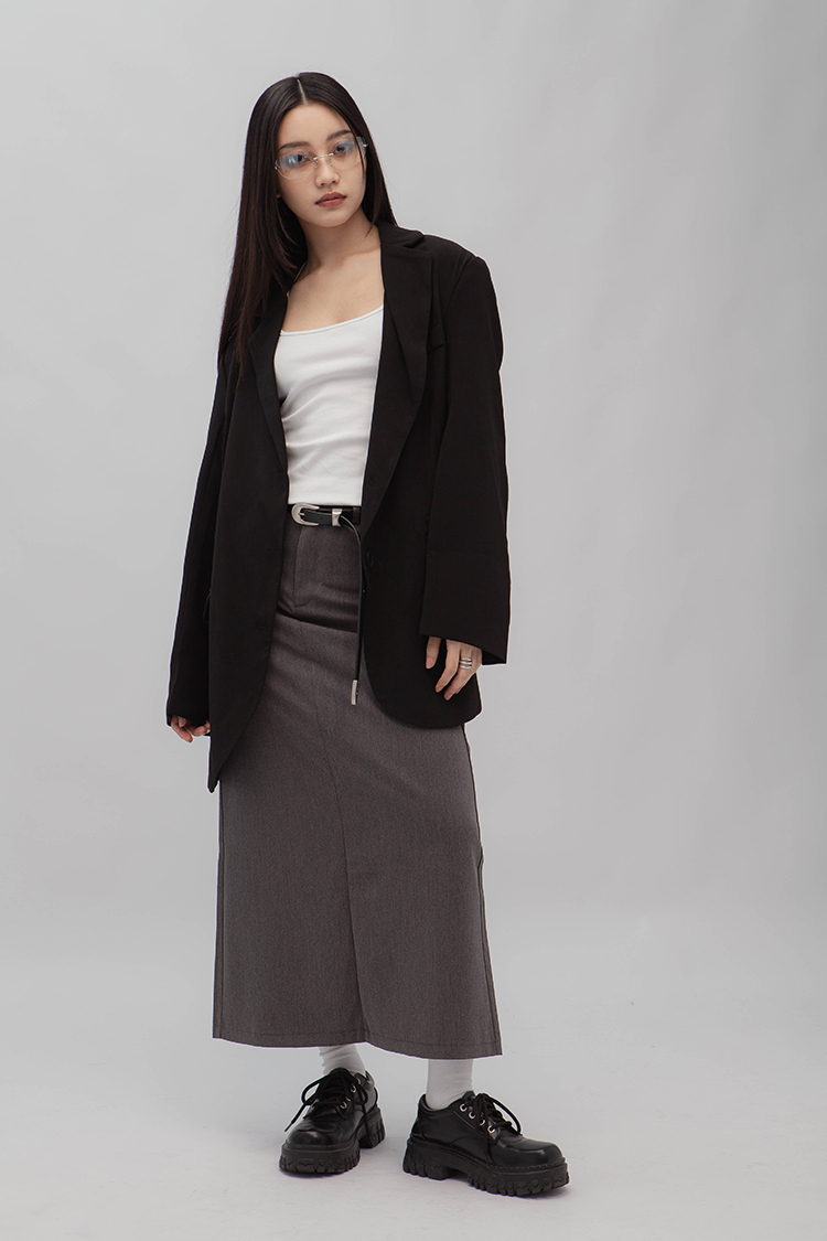 高腰,正面兩個口袋,鈕釦拉鍊閉合,皮帶環,修飾身形的輪廓,硬挺材質斜紋布料,微彈性,中長款,後面下擺A字開衩,便於行走,不論正式場合或是休閒感的假日穿搭,皆能輕鬆駕馭。