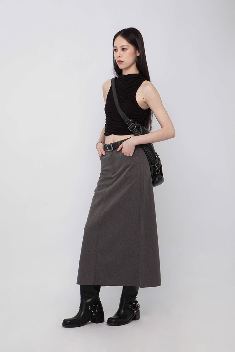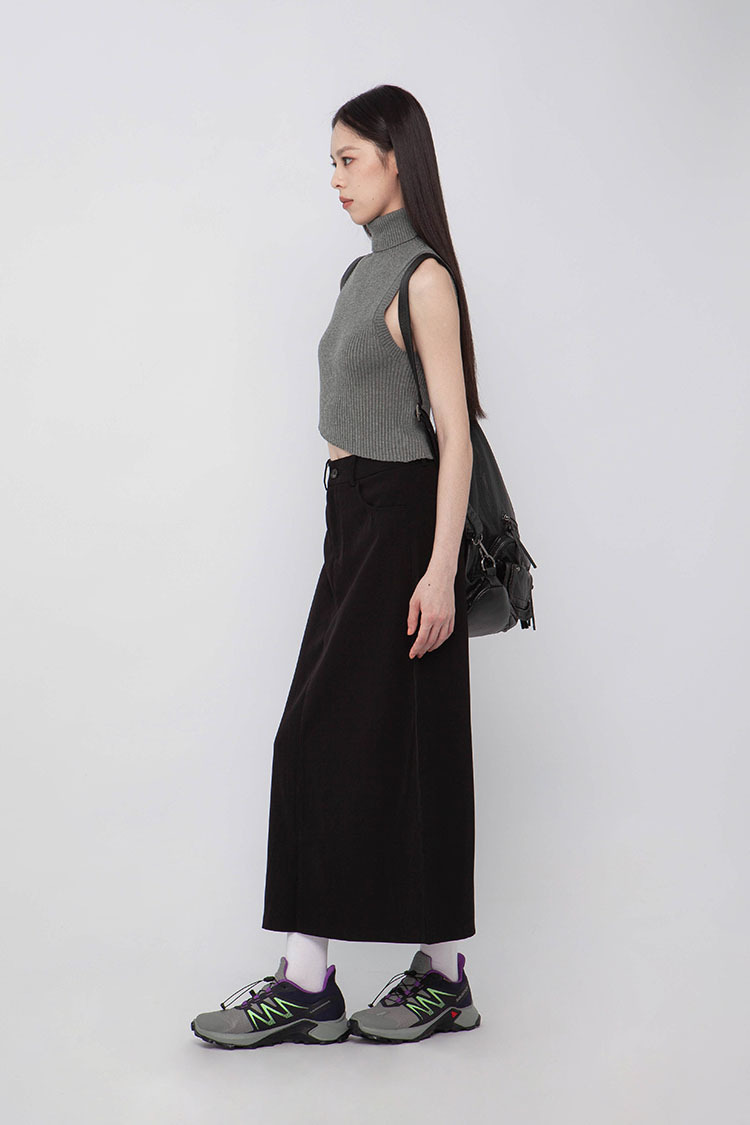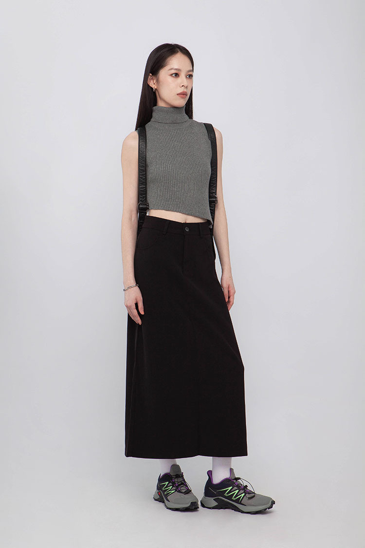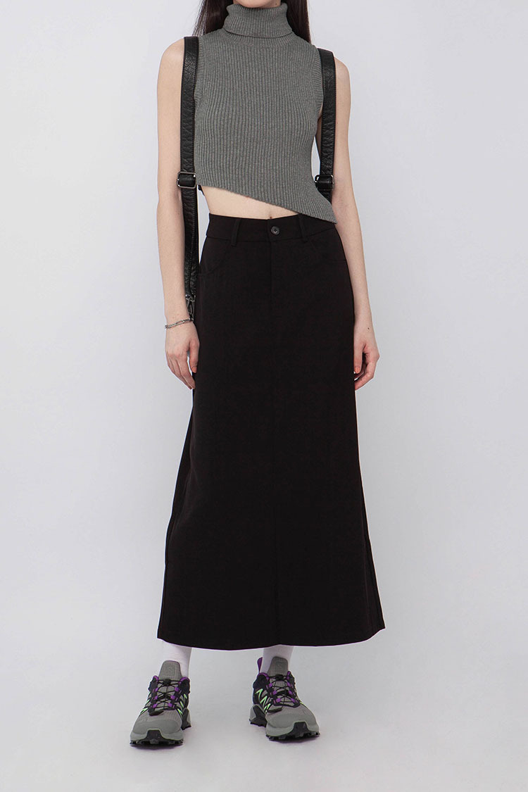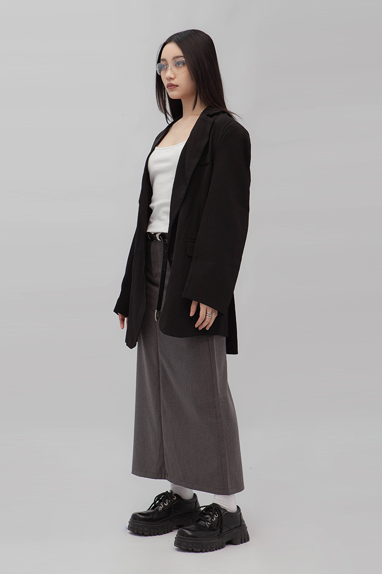 高腰,正面兩個口袋,鈕釦拉鍊閉合,皮帶環,修飾身形的輪廓,硬挺材質斜紋布料,微彈性,中長款,後面下擺A字開衩,便於行走,不論正式場合或是休閒感的假日穿搭,皆能輕鬆駕馭。