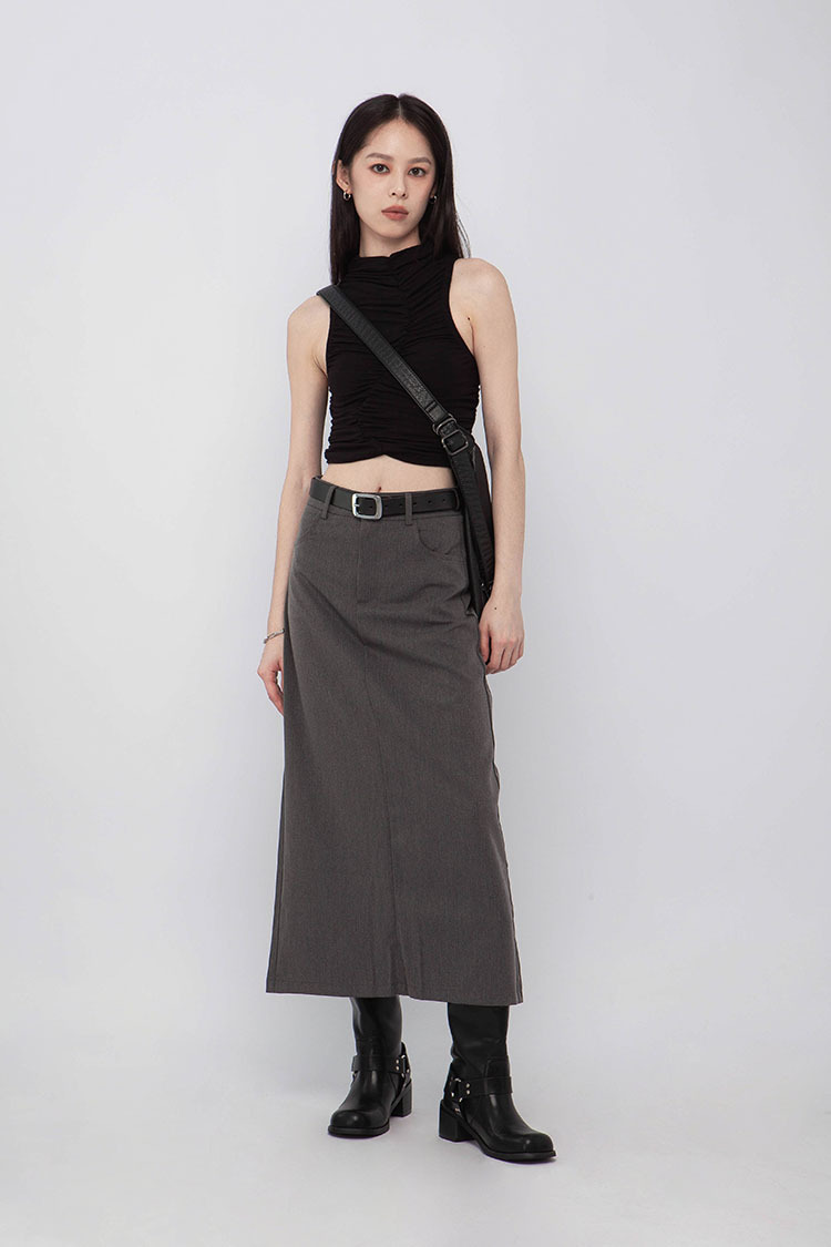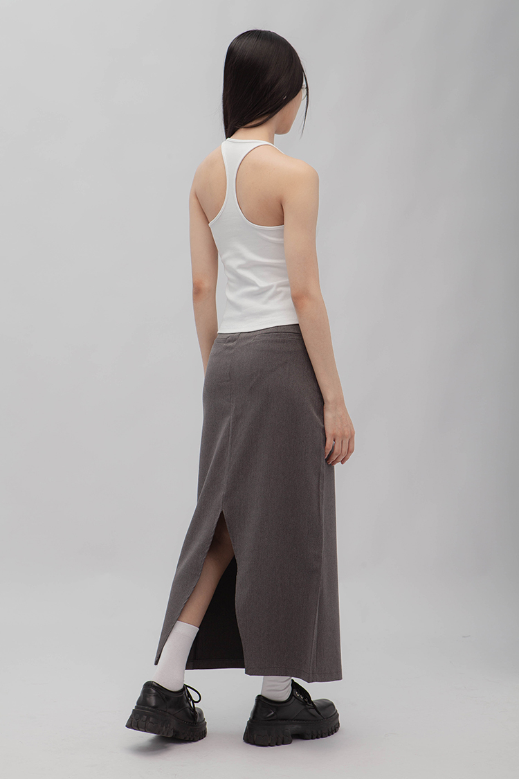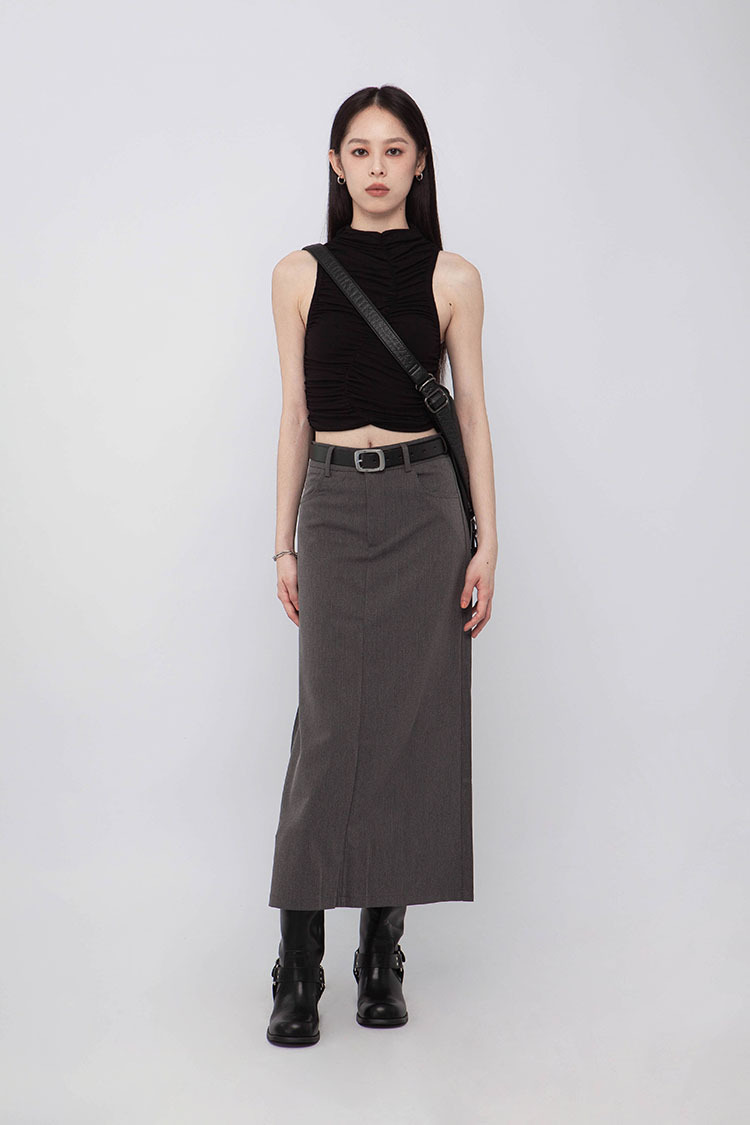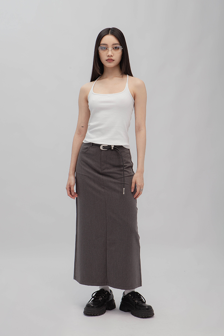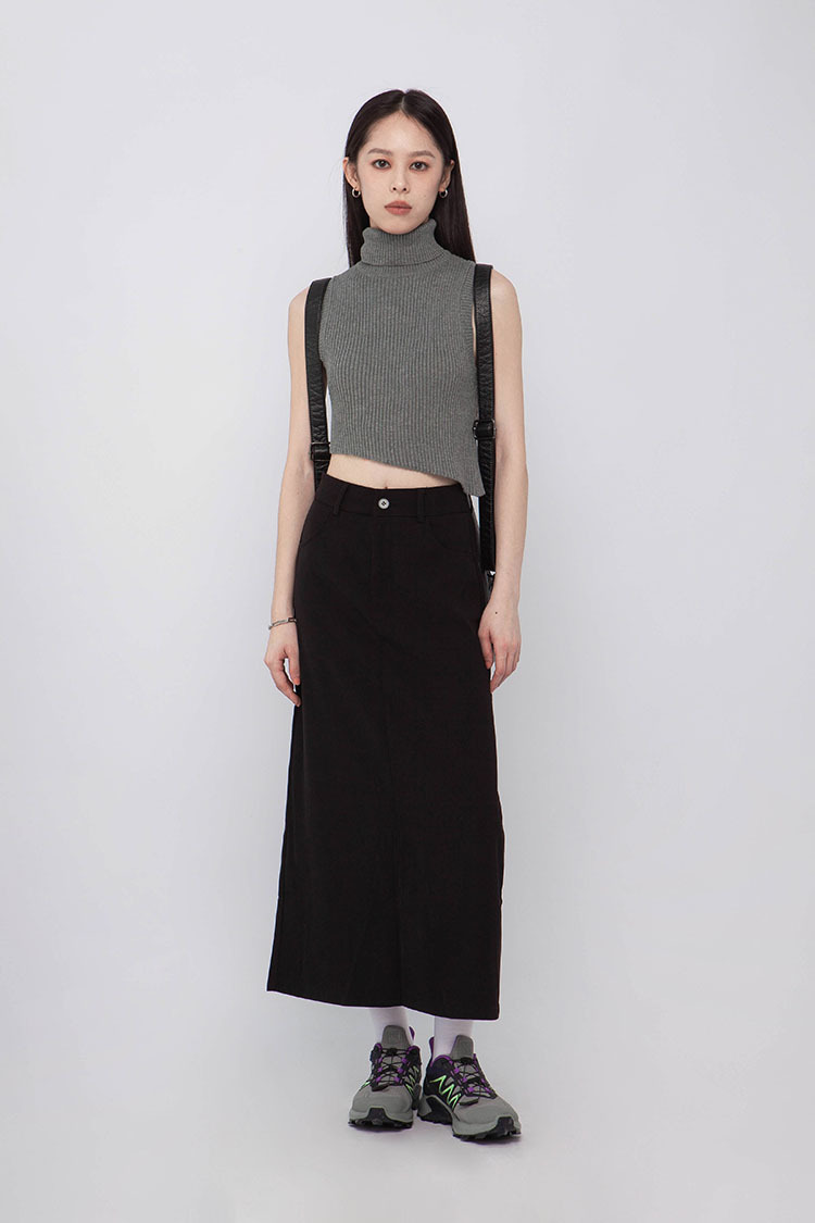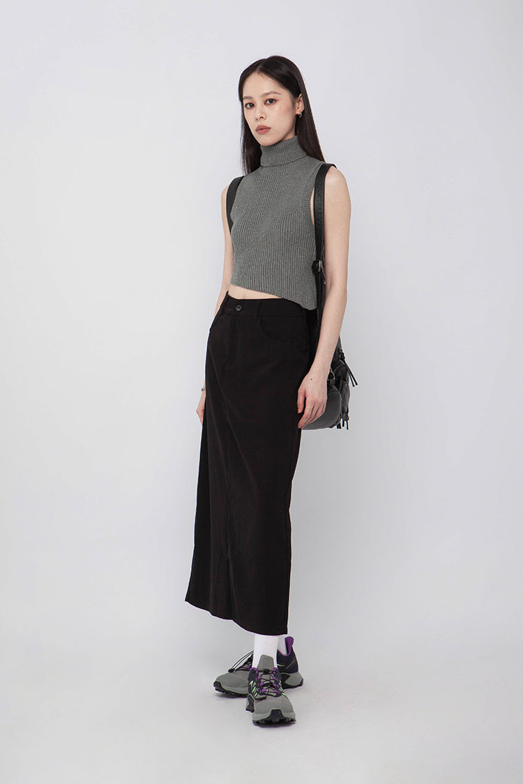高腰,正面兩個口袋,鈕釦拉鍊閉合,皮帶環,修飾身形的輪廓,硬挺材質斜紋布料,微彈性,中長款,後面下擺A字開衩,便於行走,不論正式場合或是休閒感的假日穿搭,皆能輕鬆駕馭。