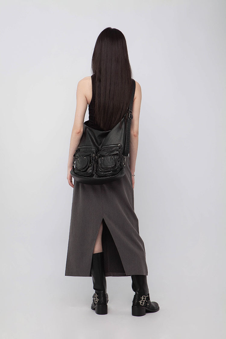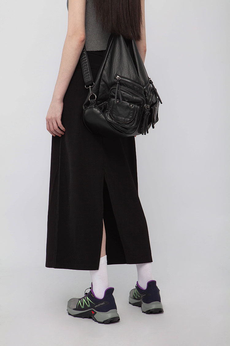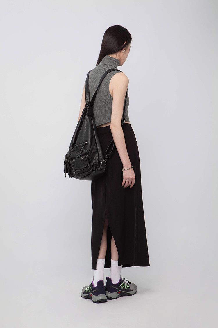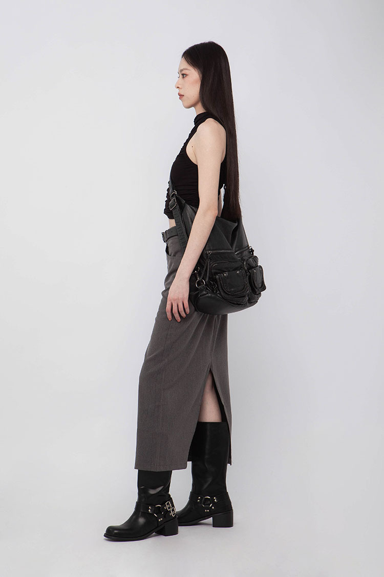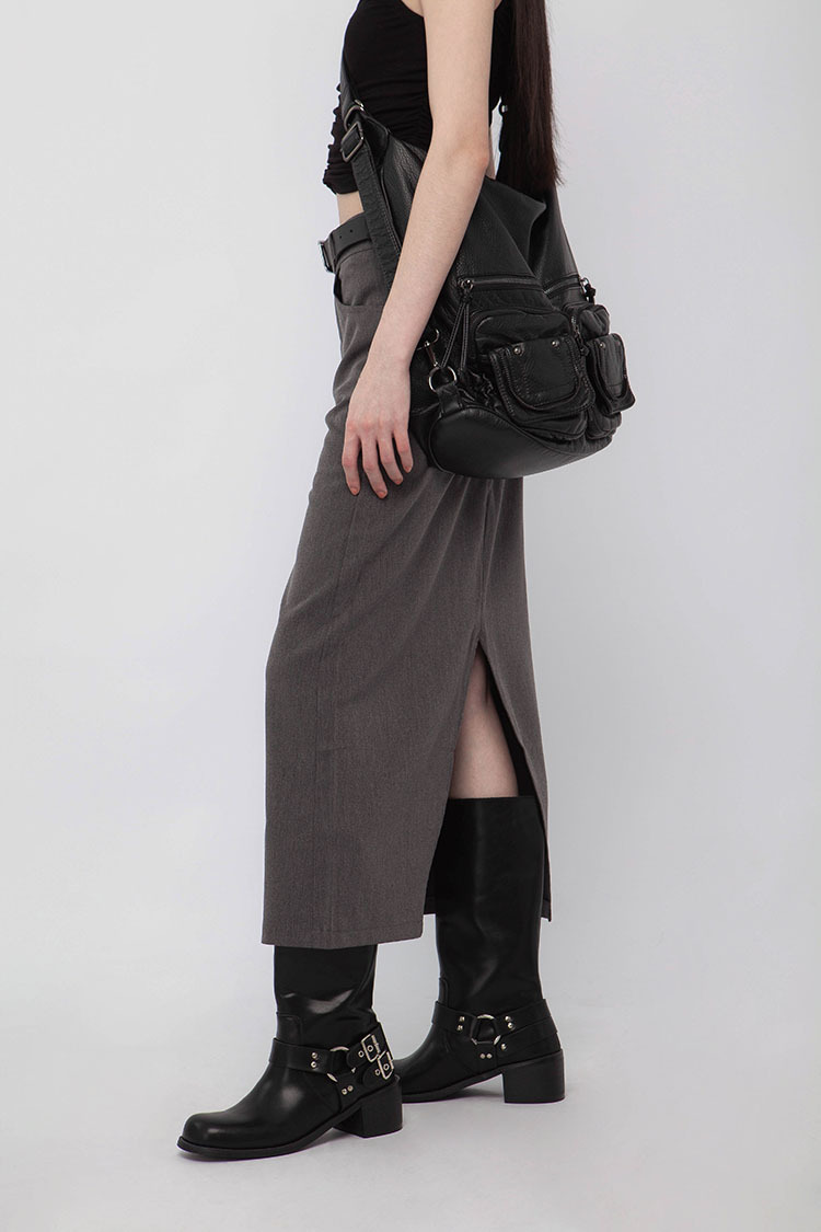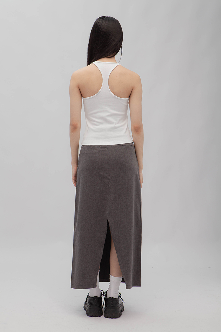 高腰,正面兩個口袋,鈕釦拉鍊閉合,皮帶環,修飾身形的輪廓,硬挺材質斜紋布料,微彈性,中長款,後面下擺A字開衩,便於行走,不論正式場合或是休閒感的假日穿搭,皆能輕鬆駕馭。