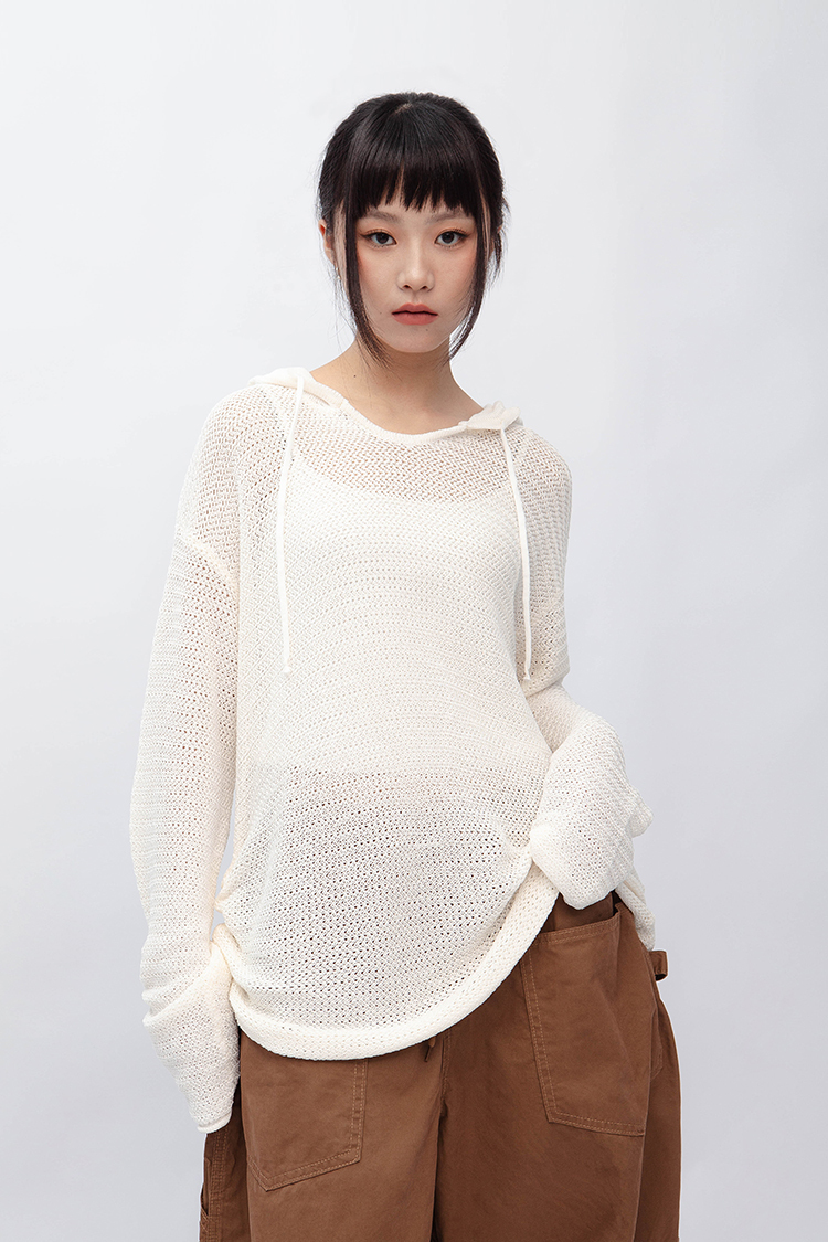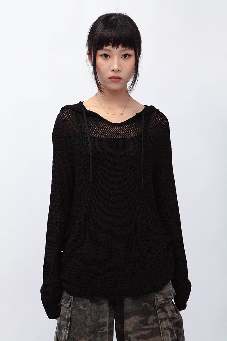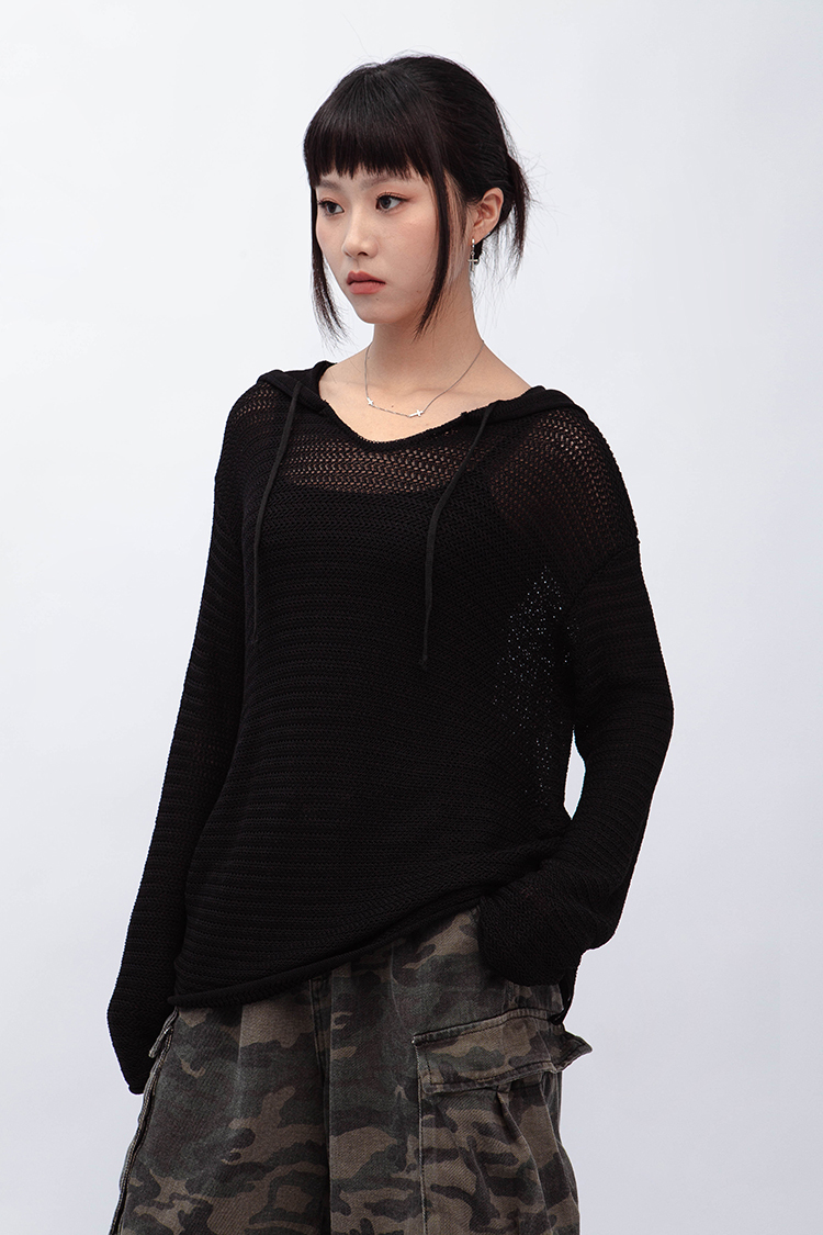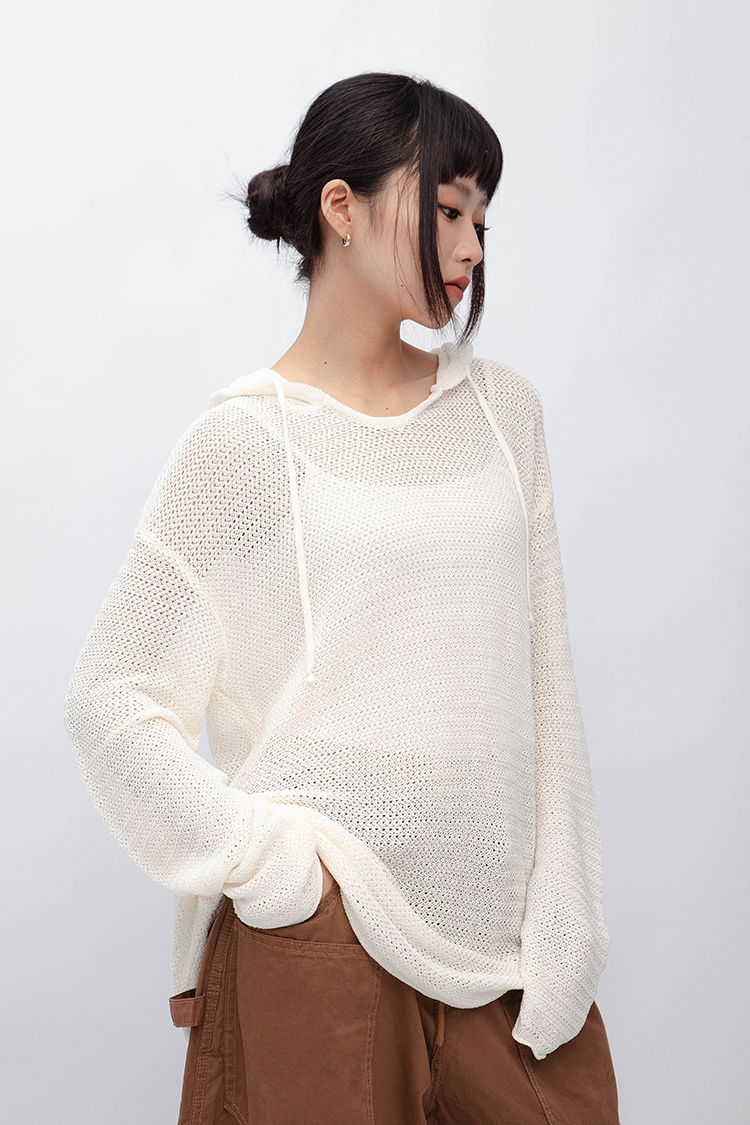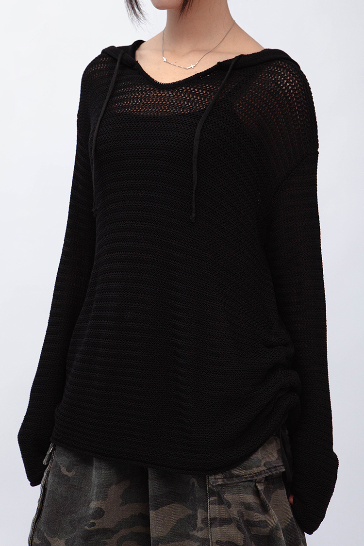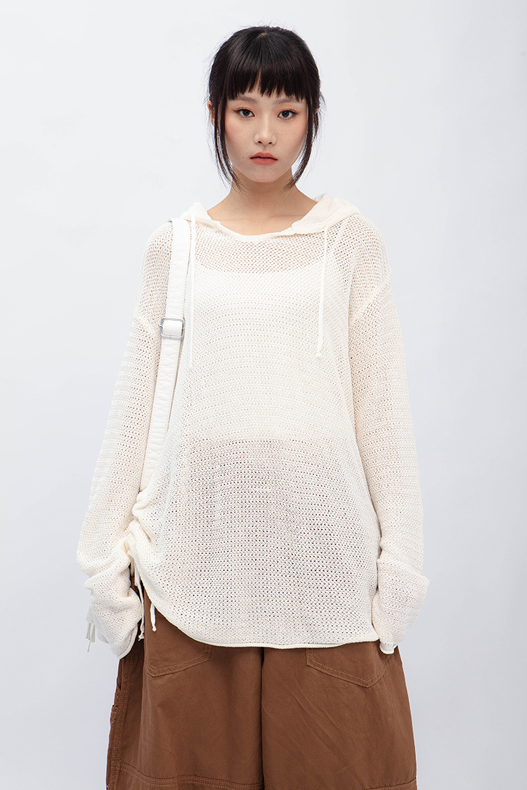 鏤空連帽針織衫,以寬鬆慵懶的剪裁呈現,帶來輕鬆自在的穿著感。鏤空微透針織面料,展現隨性中帶點小性感的風格。側邊下擺設計有可調節抽繩,可依需求調整版型與長度,適合秋冬季節的輕薄層次感。