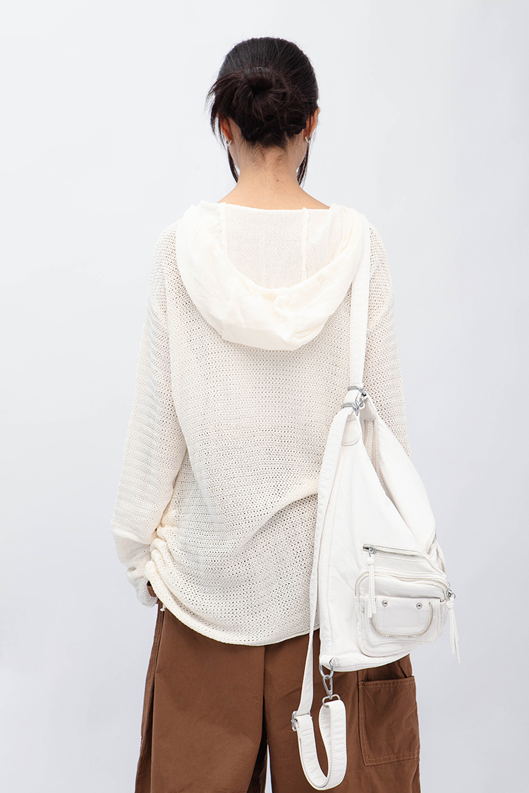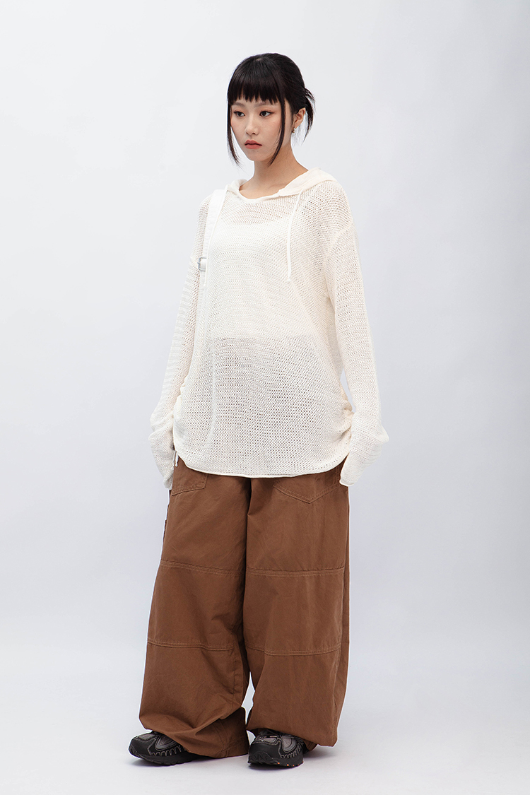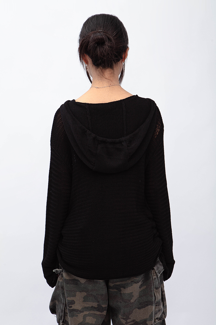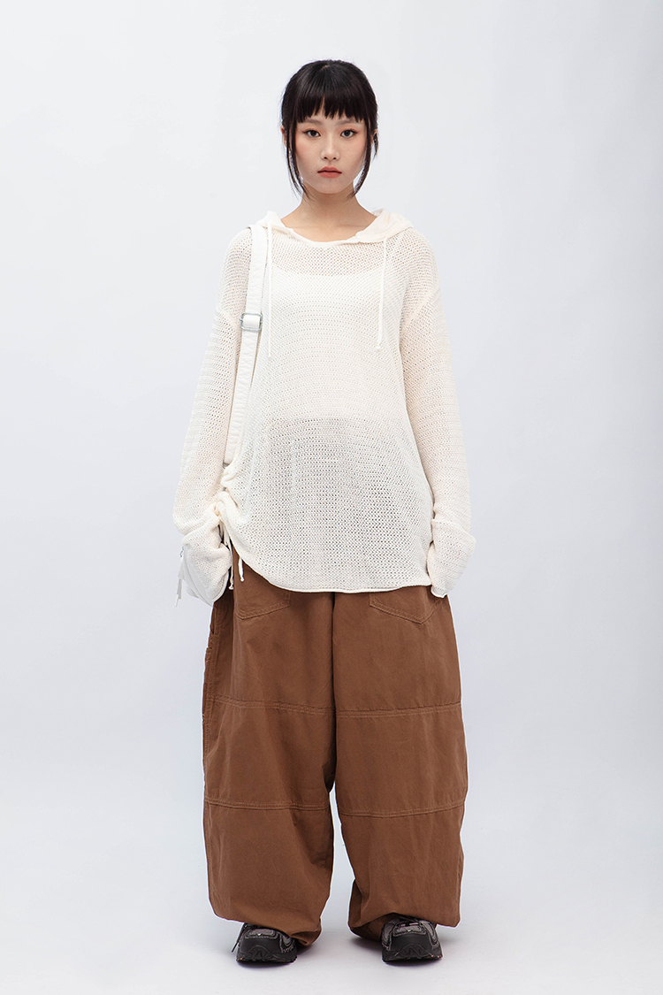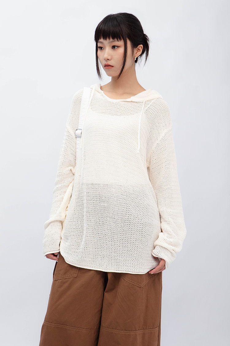 鏤空連帽針織衫,以寬鬆慵懶的剪裁呈現,帶來輕鬆自在的穿著感。鏤空微透針織面料,展現隨性中帶點小性感的風格。側邊下擺設計有可調節抽繩,可依需求調整版型與長度,適合秋冬季節的輕薄層次感。