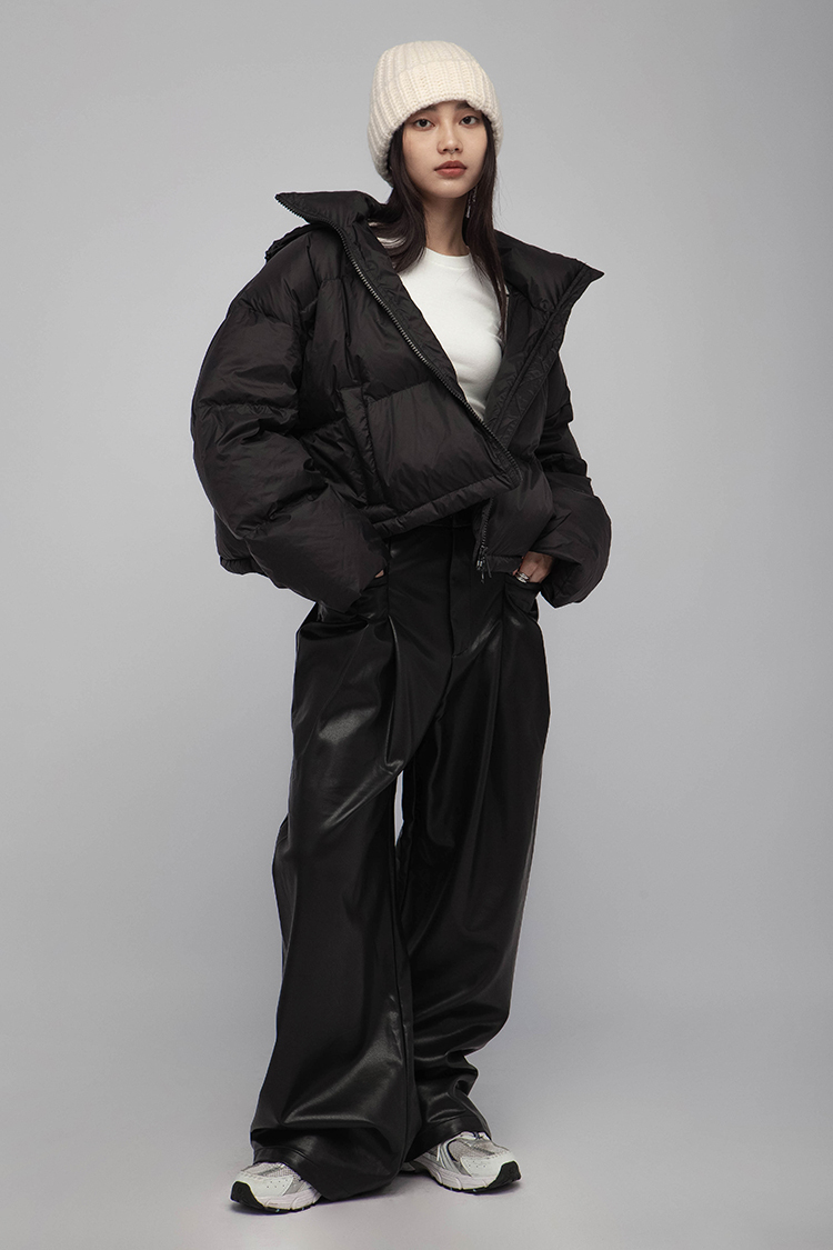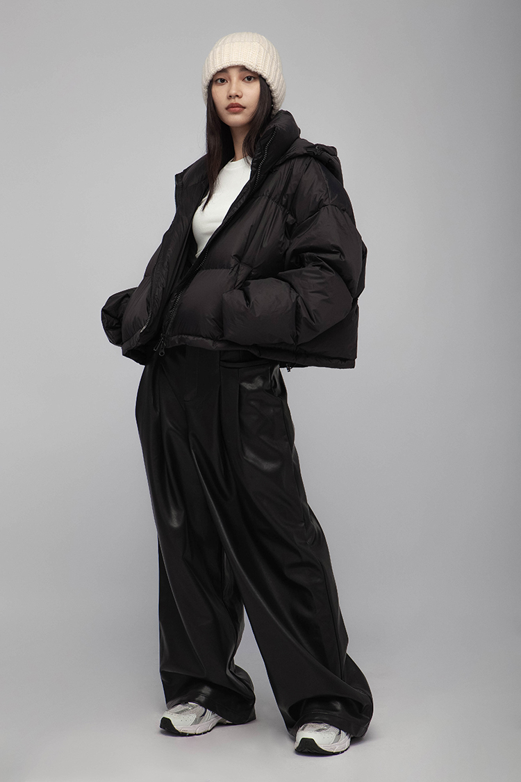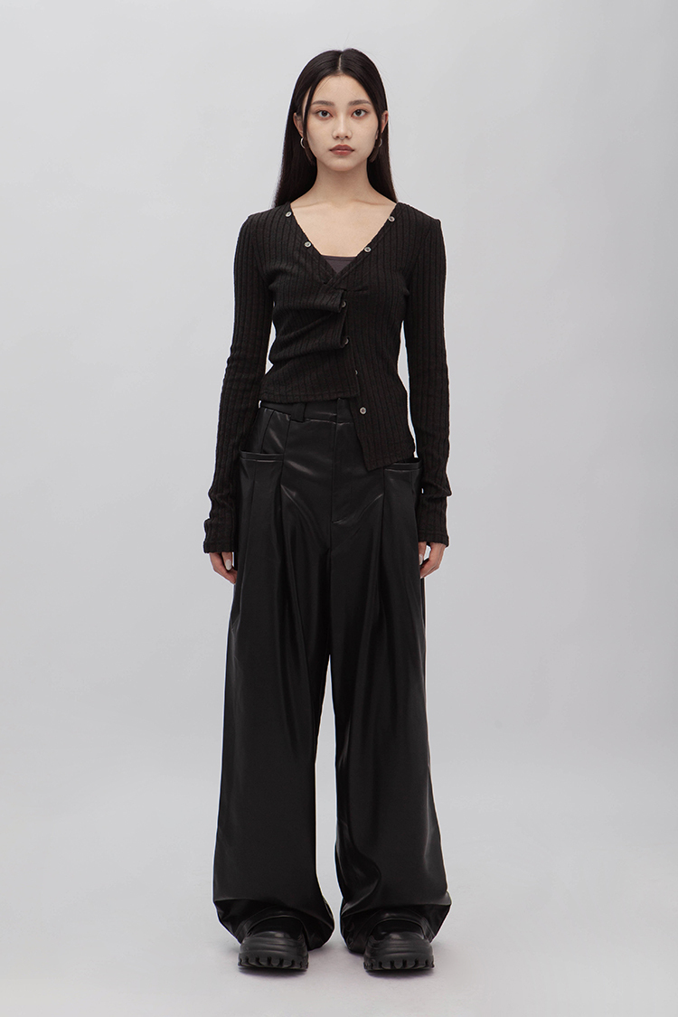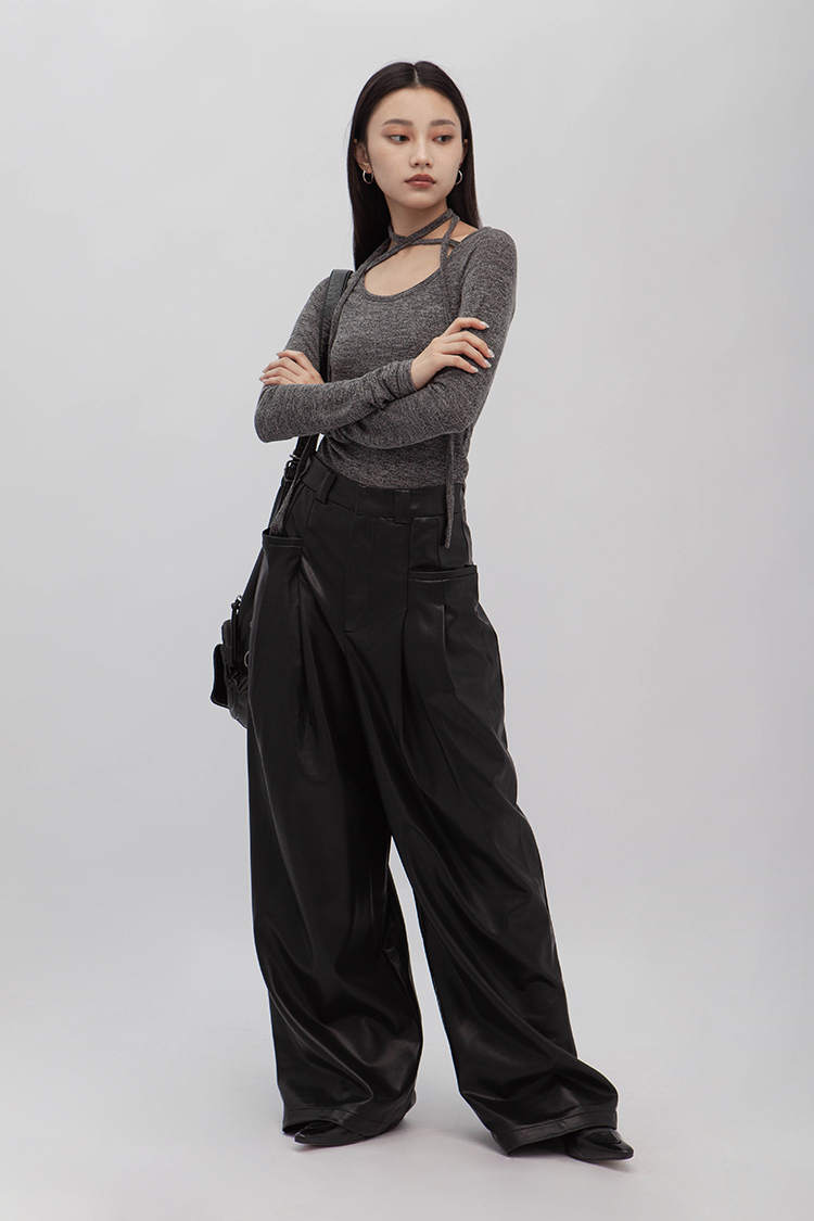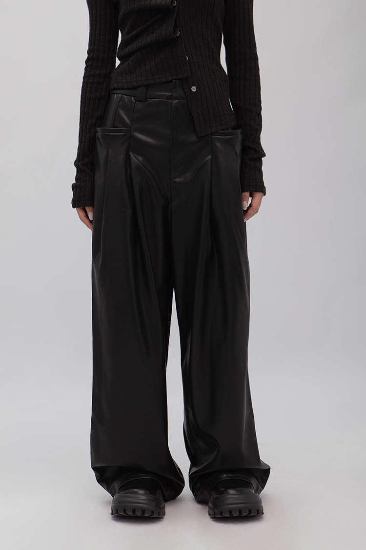 高腰剪裁,拉鍊門襟配隱形鉤扣,前側立體大口袋,同向雙收摺,使整體視覺更加修長,後面裝飾假口袋,人造柔軟皮革,細緻帶有光澤,自然垂墜感,直筒寬鬆版型,內裡舒適毛絨溫暖觸感,整體俐落廓形,高品質時髦必備。
