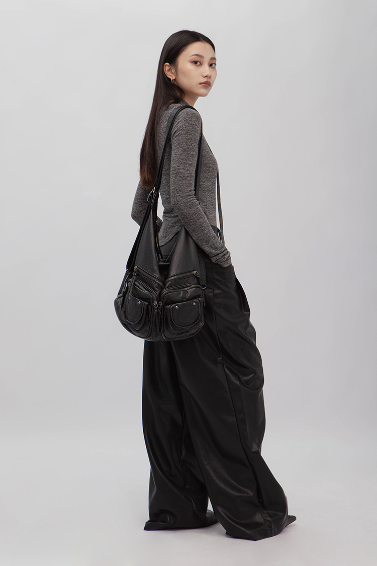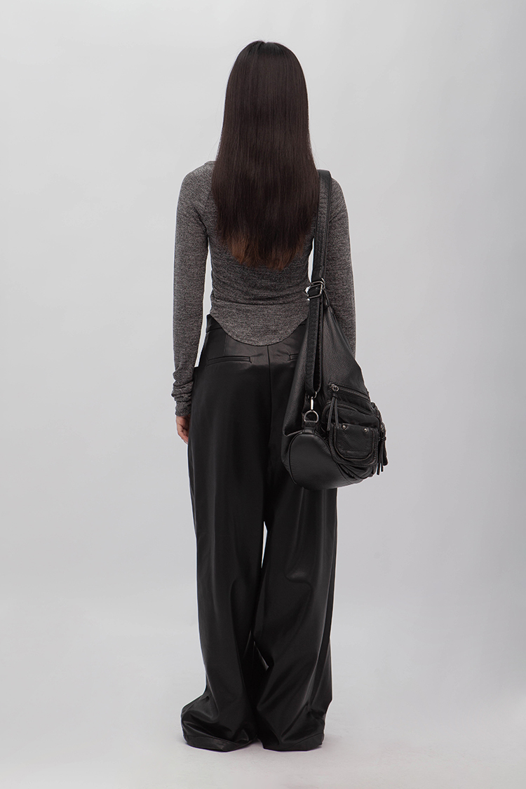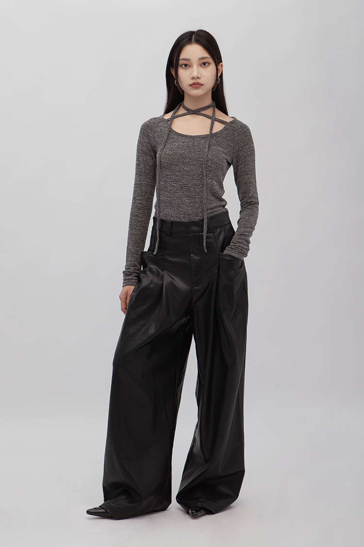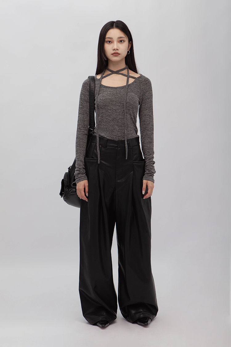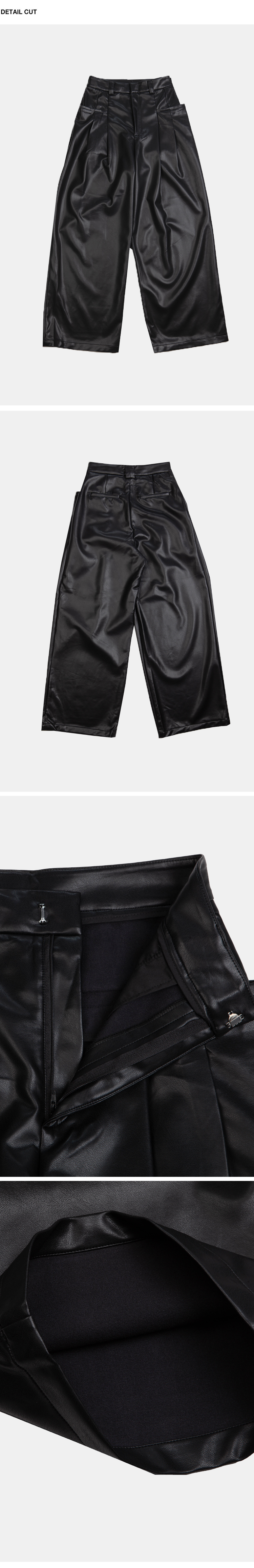 高腰剪裁,拉鍊門襟配隱形鉤扣,前側立體大口袋,同向雙收摺,使整體視覺更加修長,後面裝飾假口袋,人造柔軟皮革,細緻帶有光澤,自然垂墜感,直筒寬鬆版型,內裡舒適毛絨溫暖觸感,整體俐落廓形,高品質時髦必備。