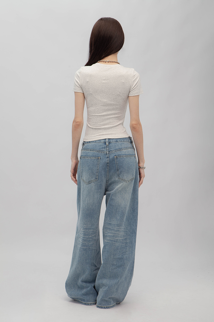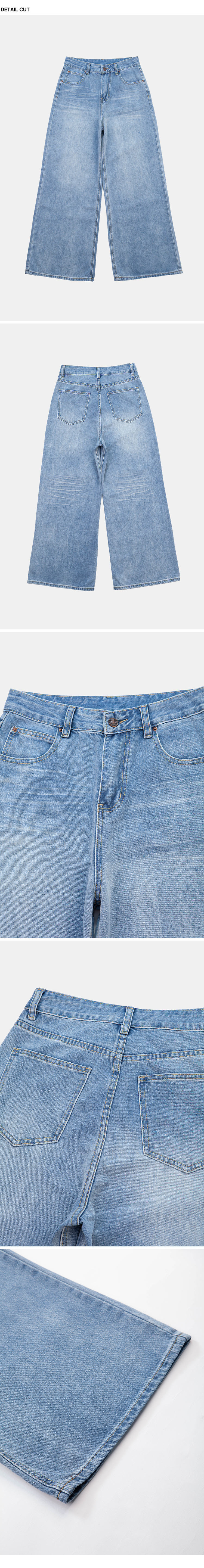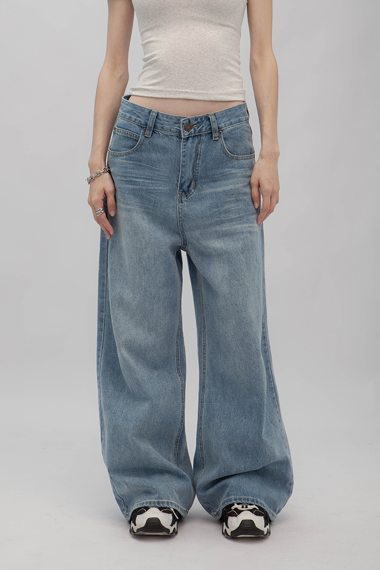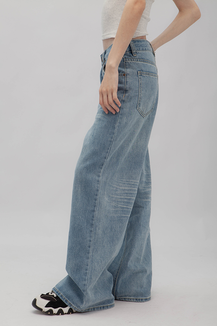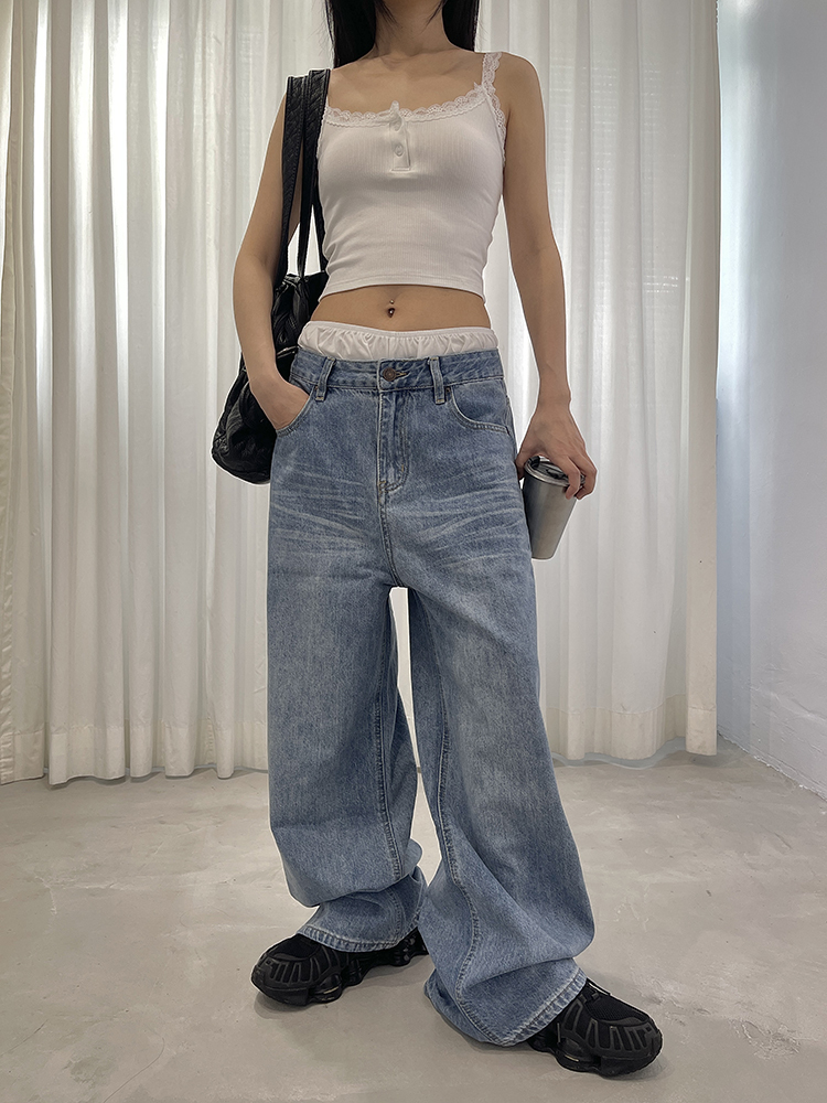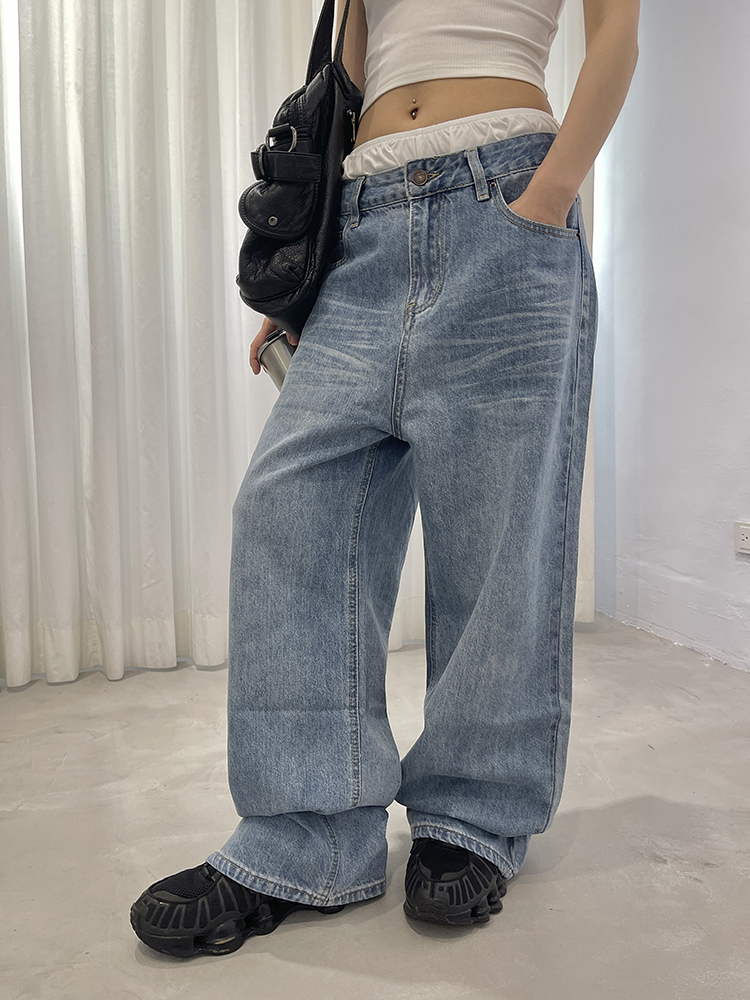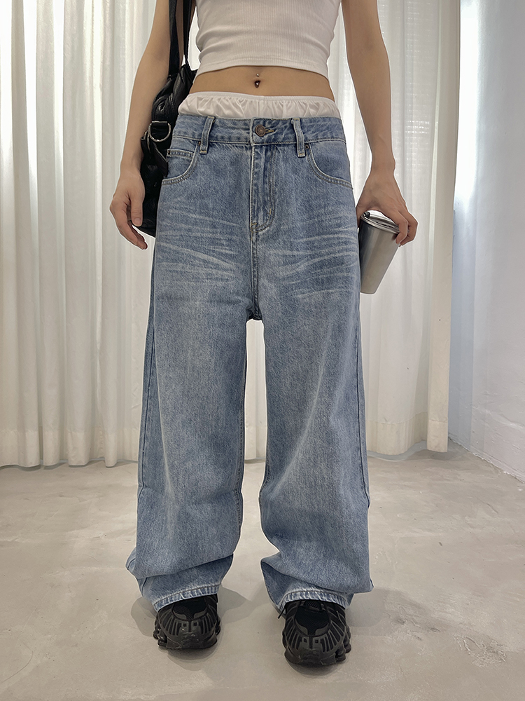 中腰剪裁,銅釦拉鍊閉合,五口袋,淺藍水洗工藝,貓鬚處理,黃色撞色縫線,無彈性,直筒寬管,修飾腿部線條,高棉,透氣且柔軟,中等厚度,衣櫃必備。