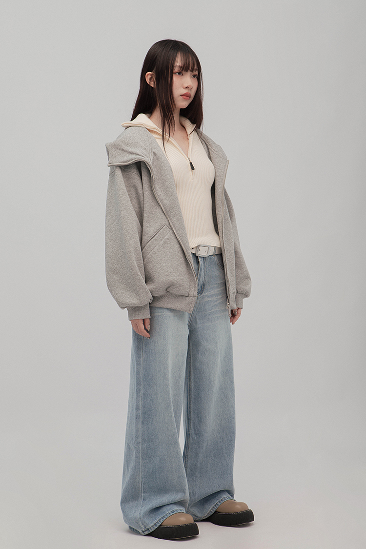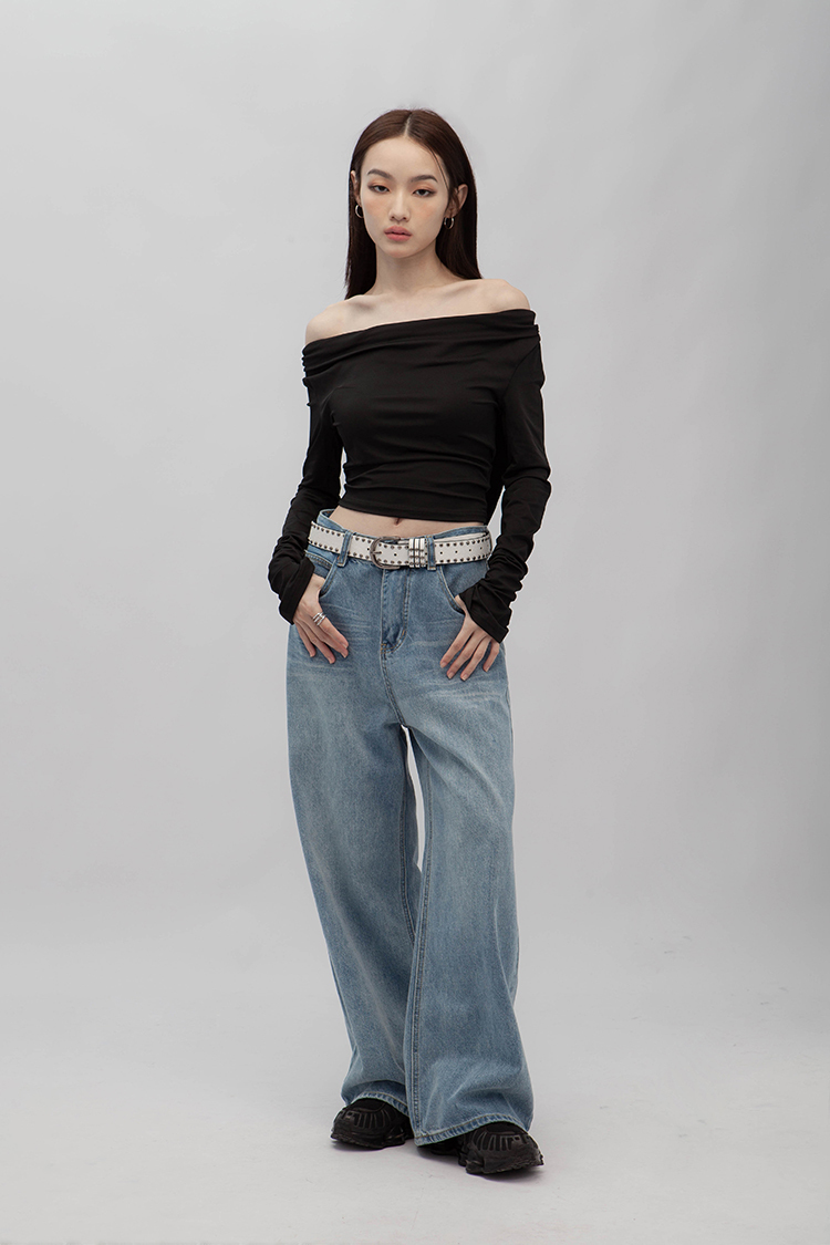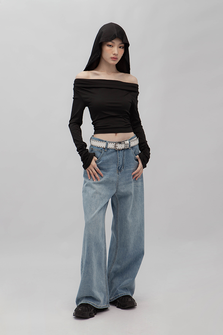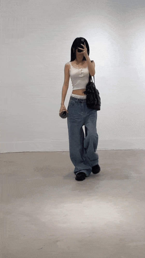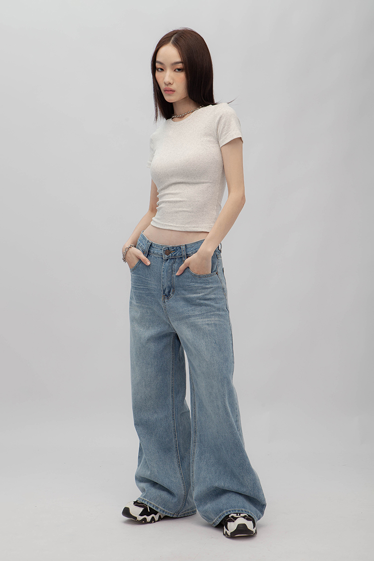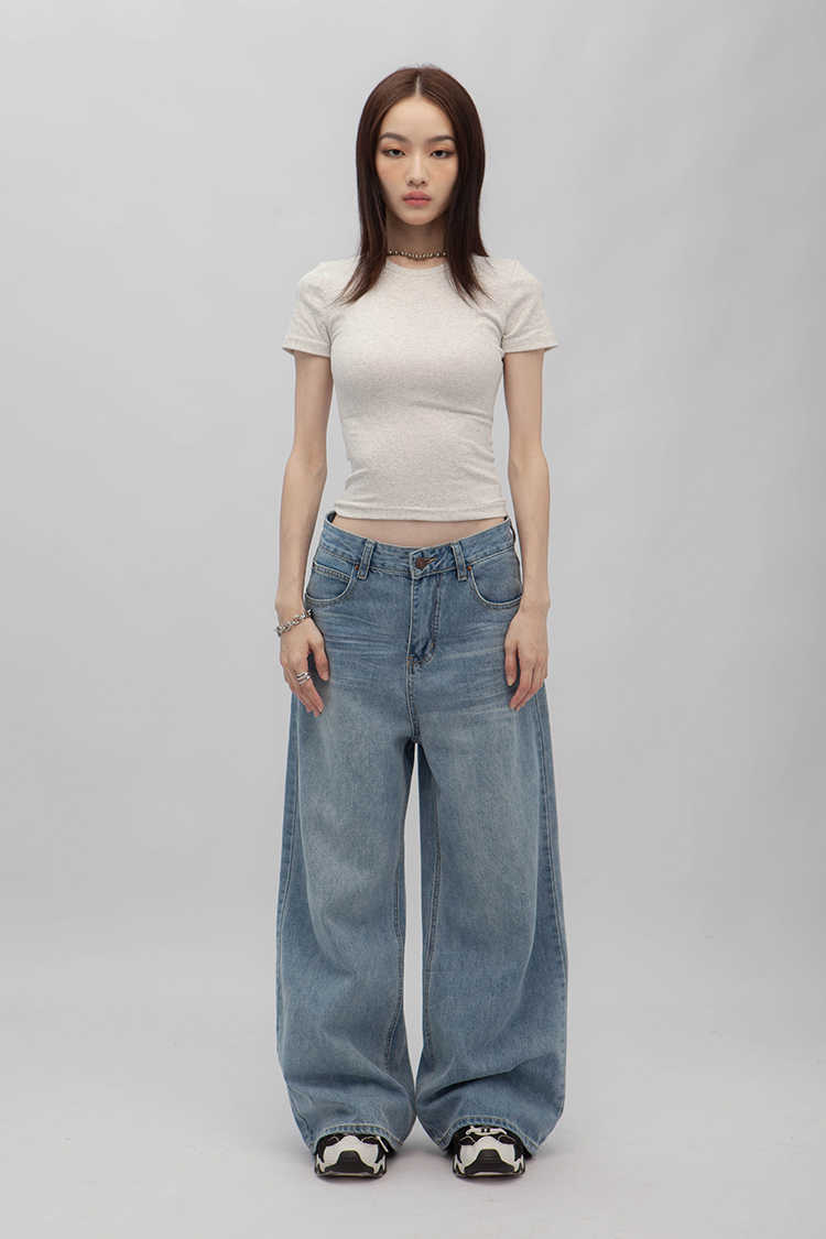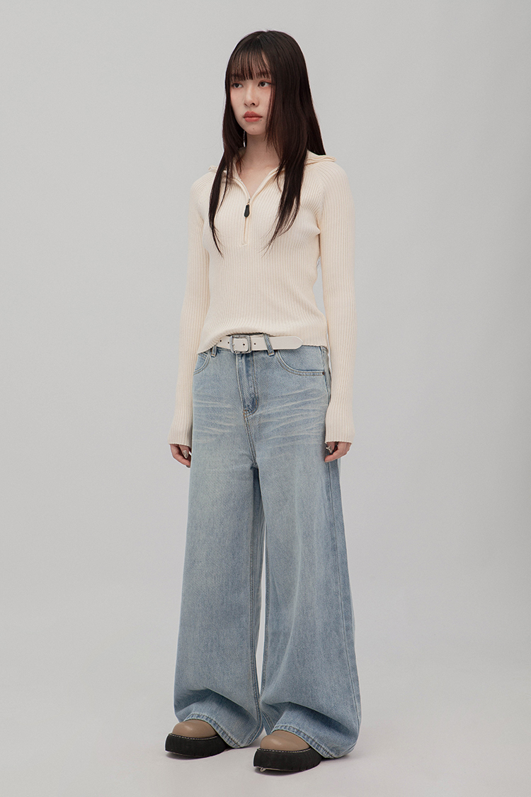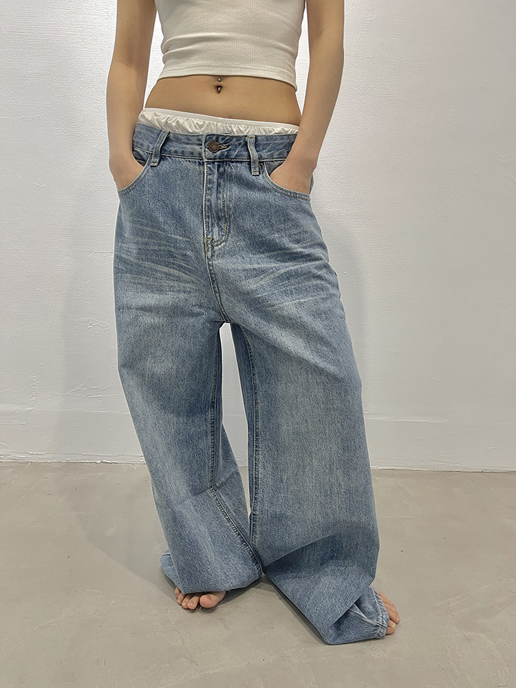中腰剪裁,銅釦拉鍊閉合,五口袋,淺藍水洗工藝,貓鬚處理,黃色撞色縫線,無彈性,直筒寬管,修飾腿部線條,高棉,透氣且柔軟,中等厚度,衣櫃必備。