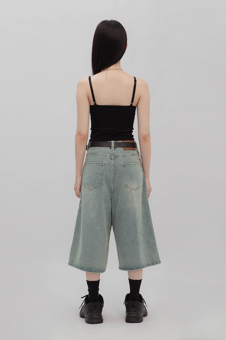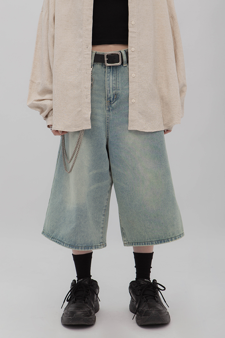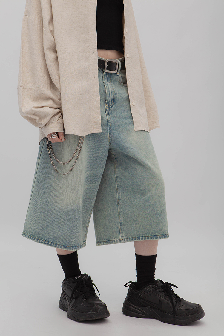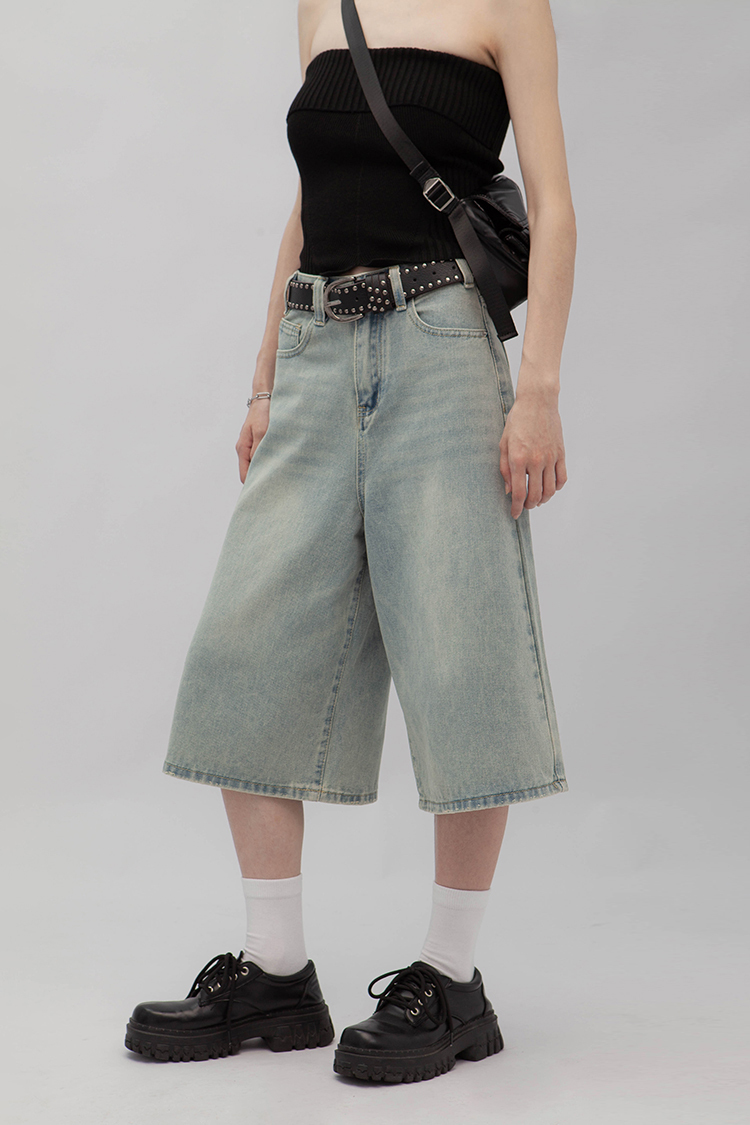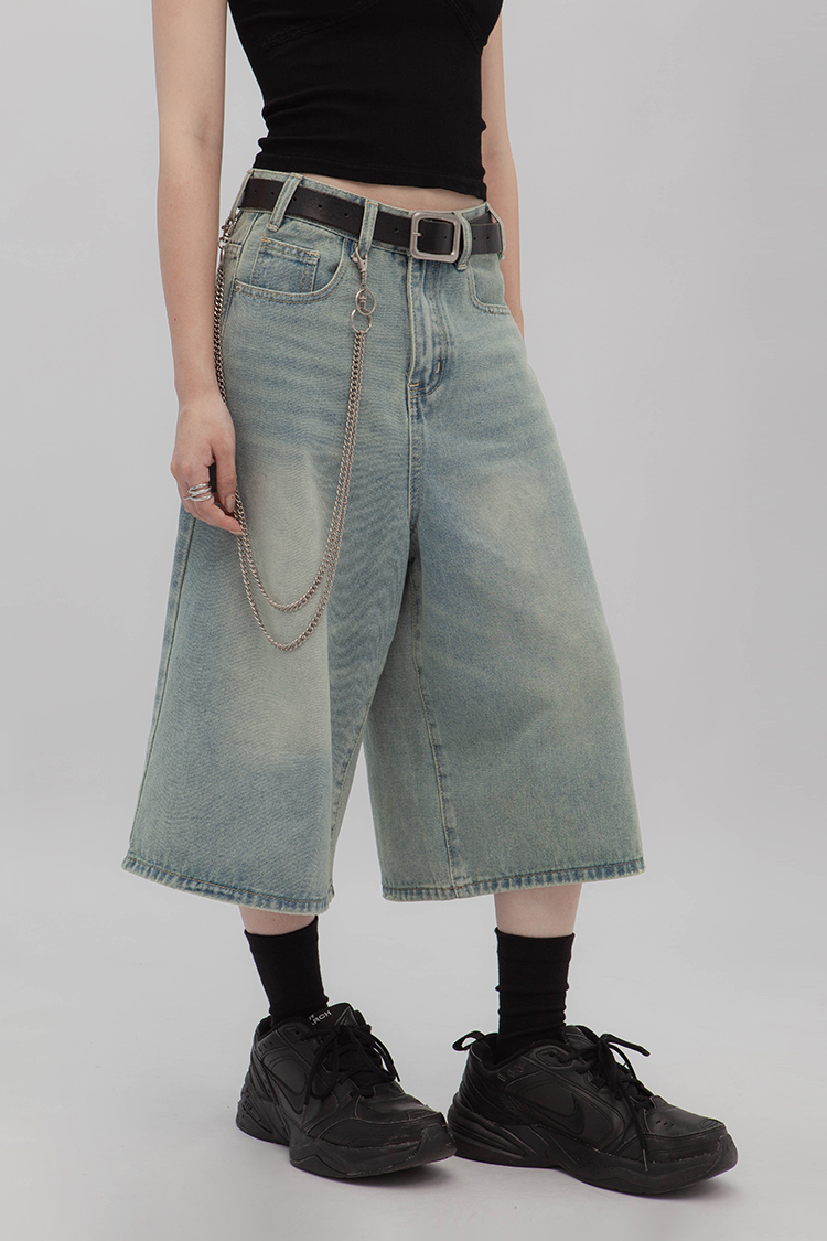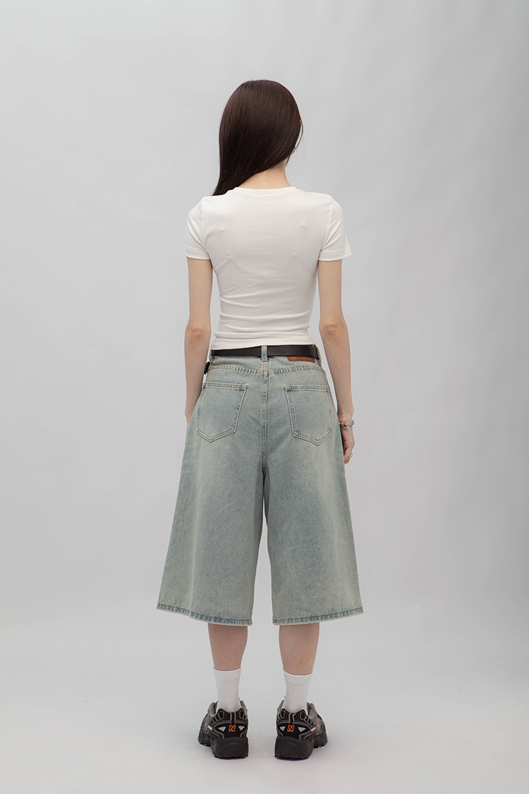 中腰剪裁,鈕釦拉鍊閉合,五口袋,淺藍水洗工藝,貓鬚處理,無彈性,寬管直筒七分褲,高棉透氣且柔軟,中等厚度,經典耐穿。