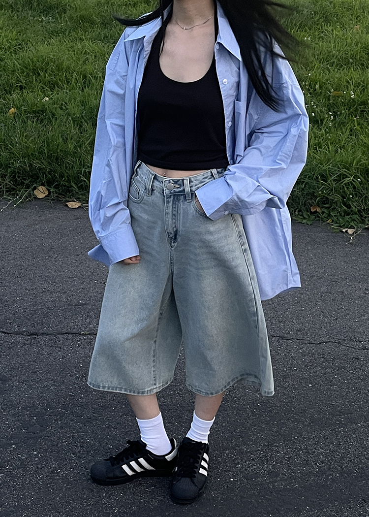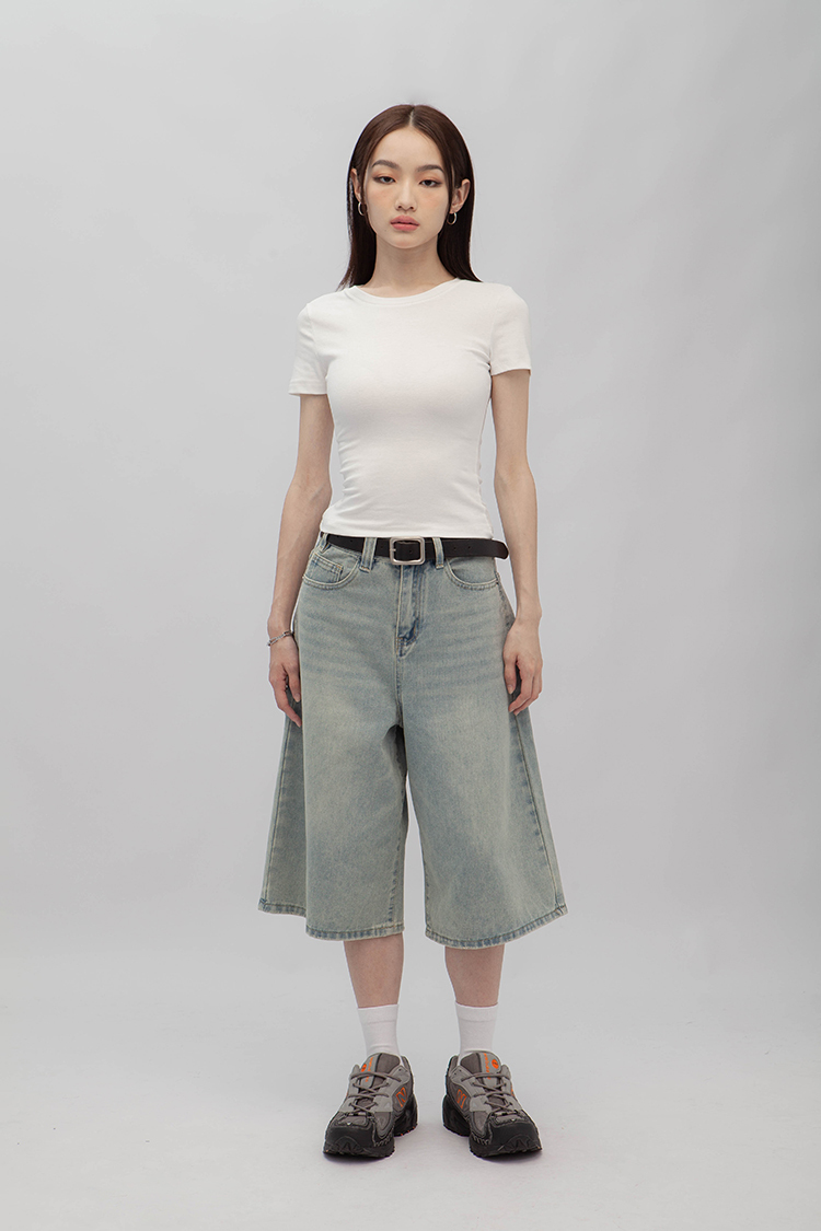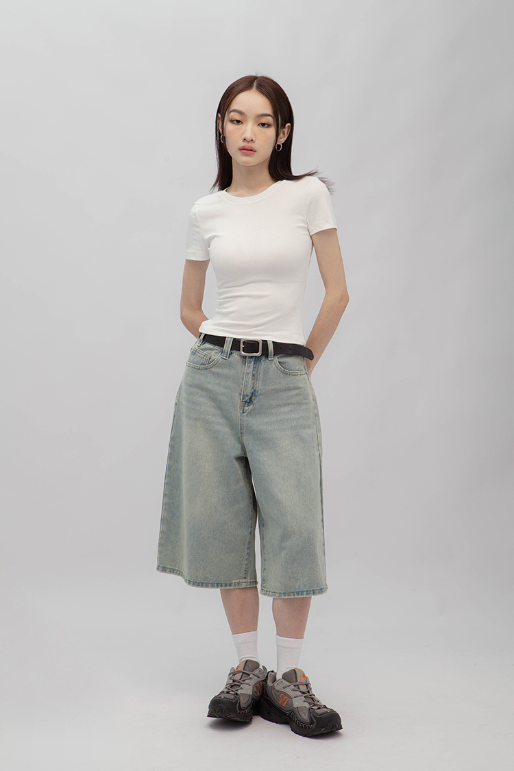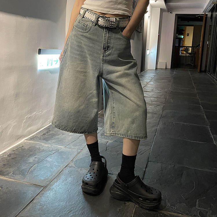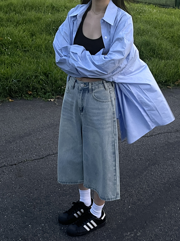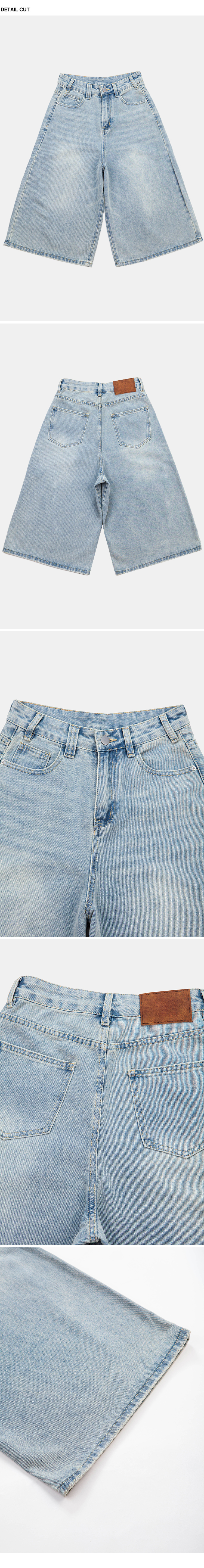 中腰剪裁,鈕釦拉鍊閉合,五口袋,淺藍水洗工藝,貓鬚處理,無彈性,寬管直筒七分褲,高棉透氣且柔軟,中等厚度,經典耐穿。