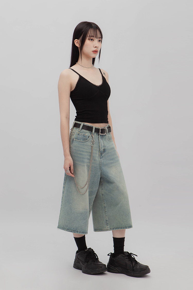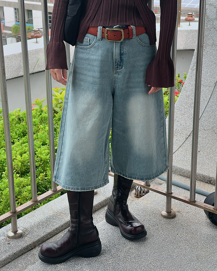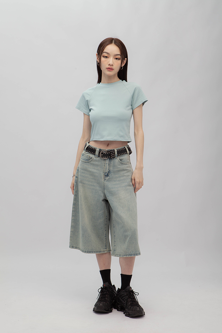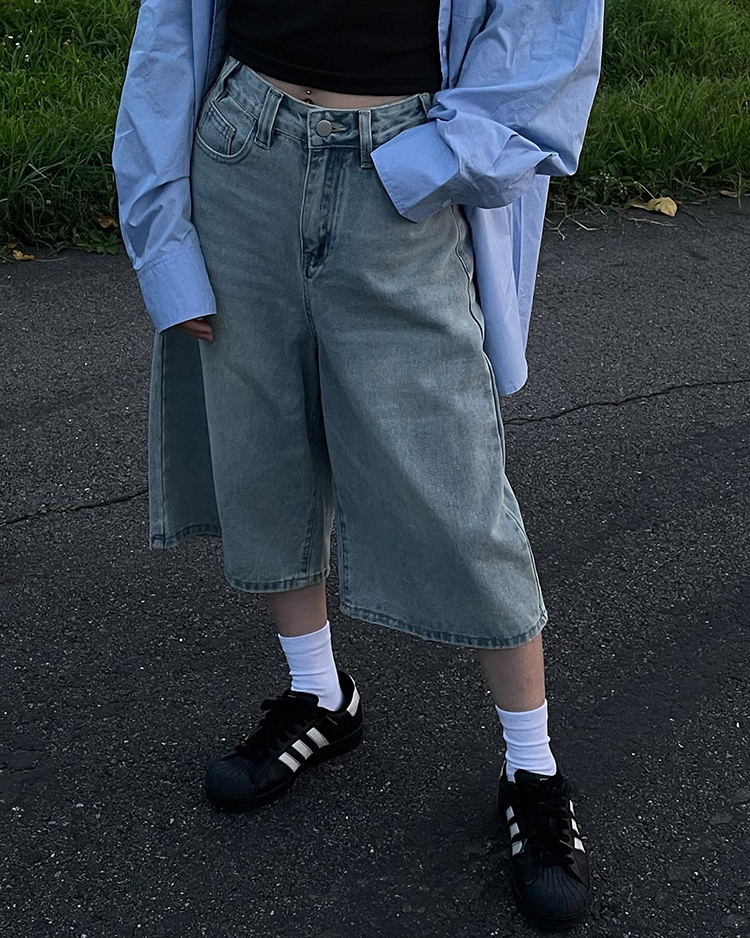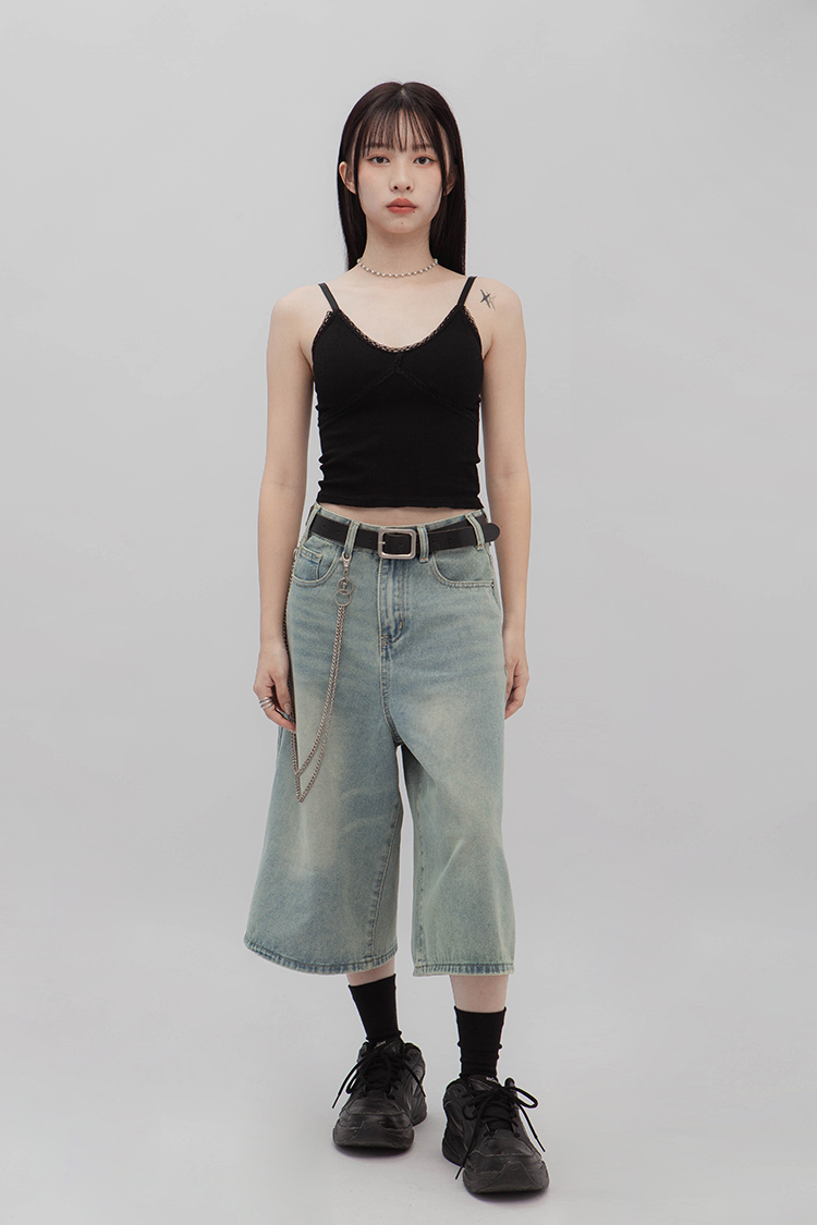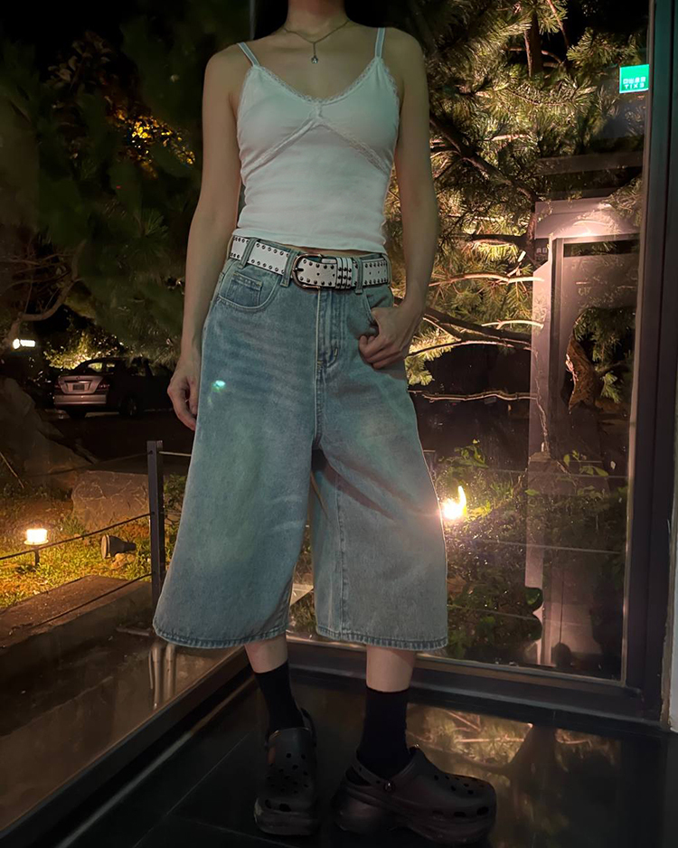 中腰剪裁,鈕釦拉鍊閉合,五口袋,淺藍水洗工藝,貓鬚處理,無彈性,寬管直筒七分褲,高棉透氣且柔軟,中等厚度,經典耐穿。