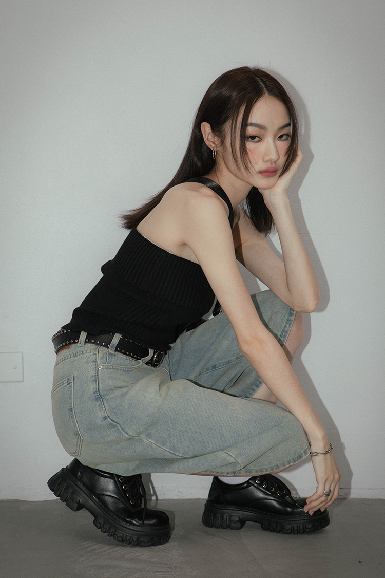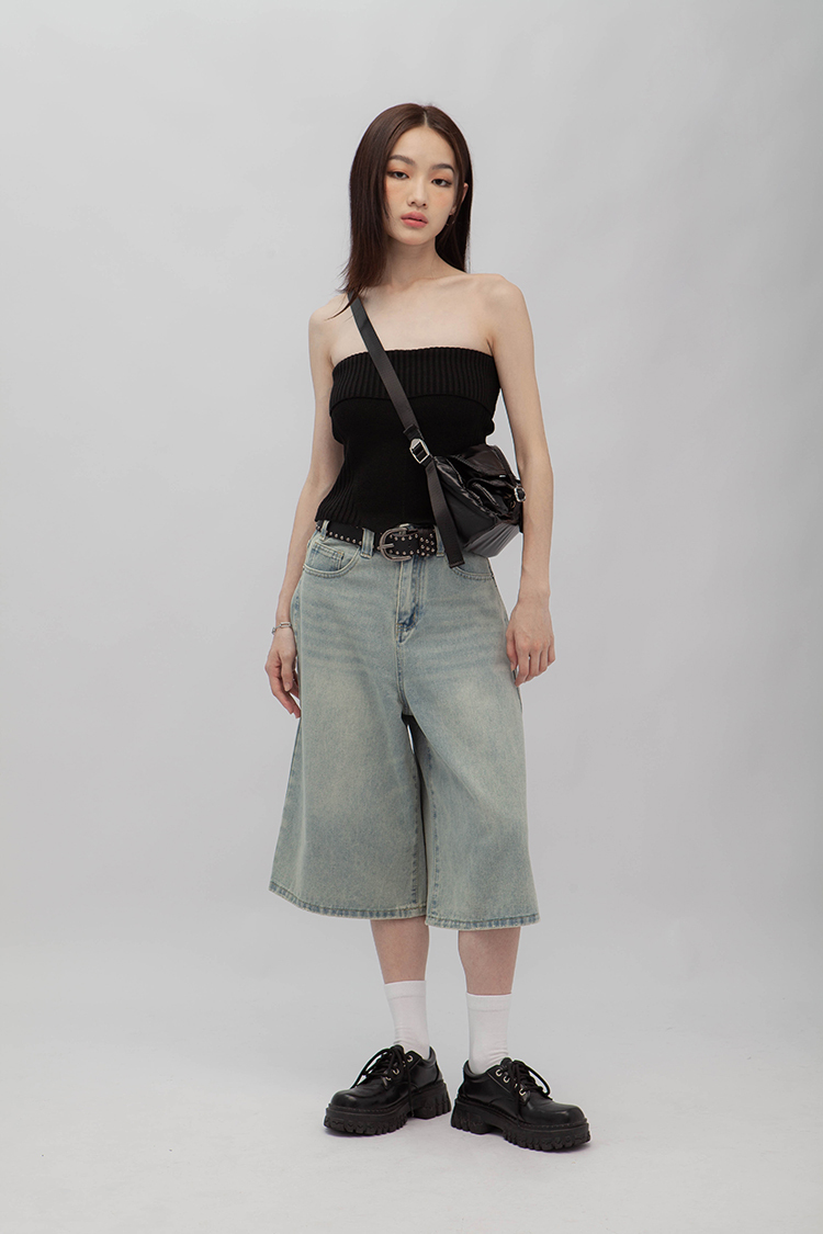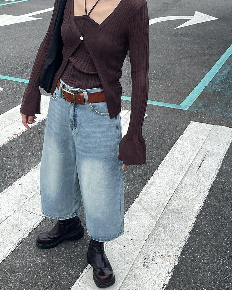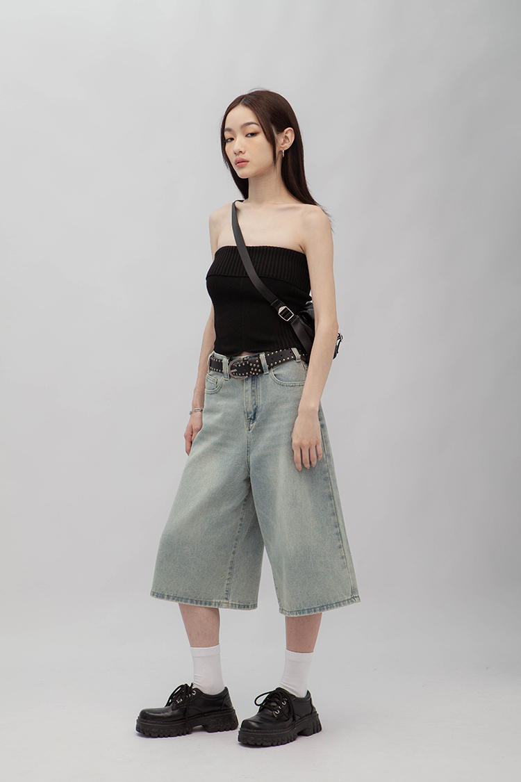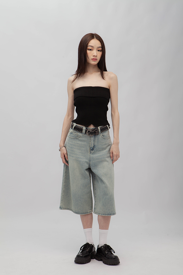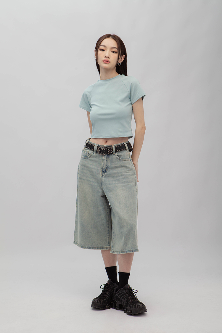 中腰剪裁,鈕釦拉鍊閉合,五口袋,淺藍水洗工藝,貓鬚處理,無彈性,寬管直筒七分褲,高棉透氣且柔軟,中等厚度,經典耐穿。
