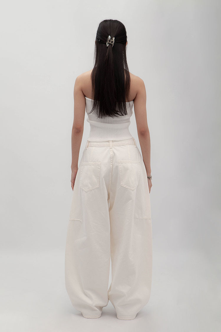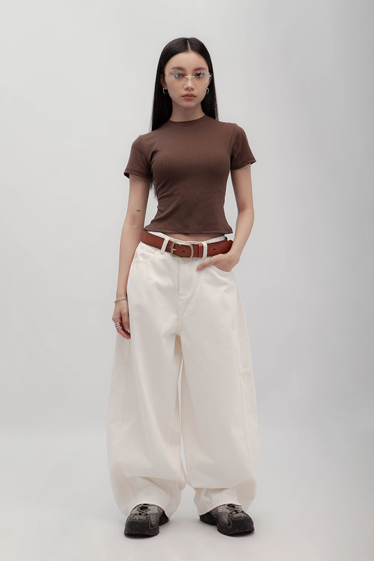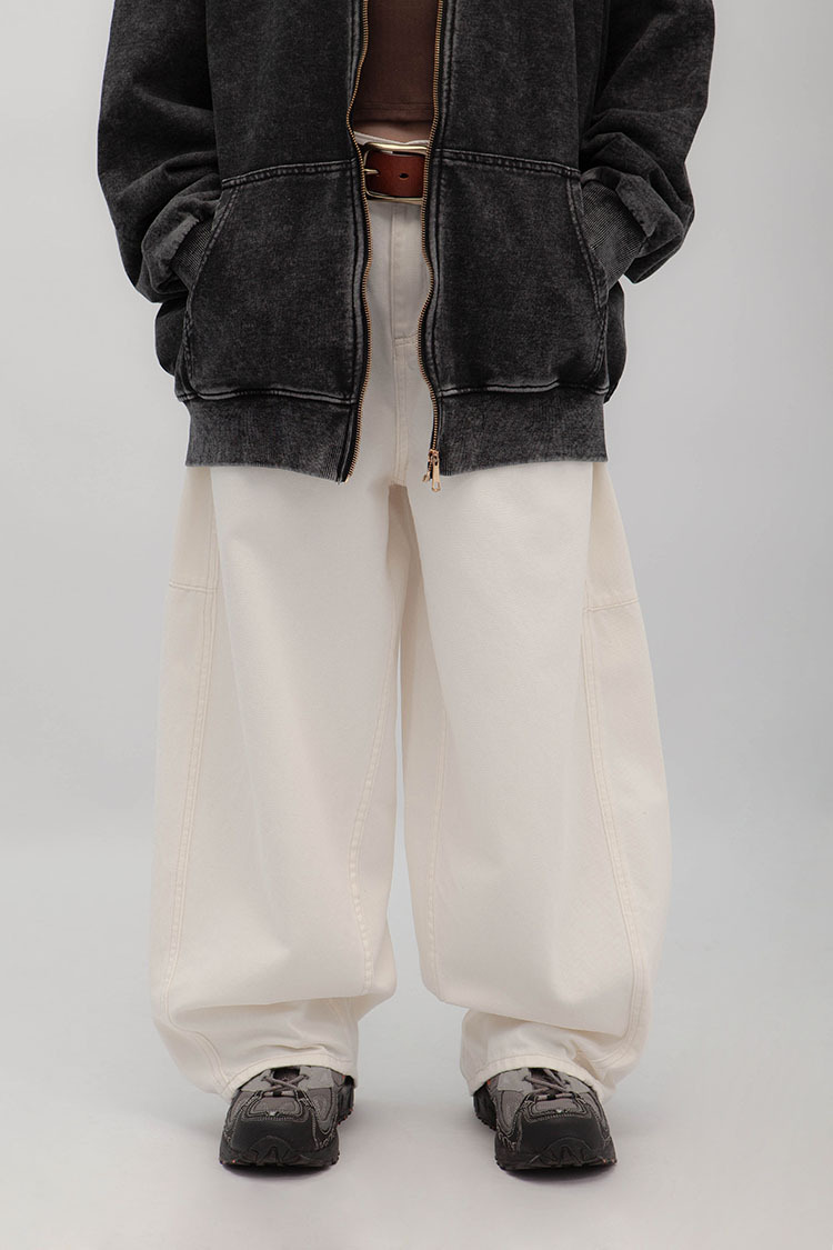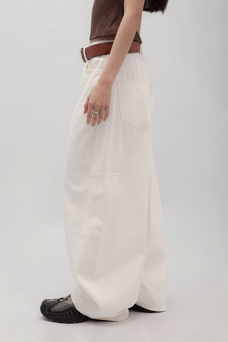 立體彎刀剪裁為設計亮點,透過側邊弧線與立體線條結構,寬鬆隨性的褲型輪廓。側縫線略往前裁剪,視覺上能自然延伸腿部線條,對梨形身材友好;材質手感厚實卻不悶熱,含高比例棉質,穿起來挺拔有垂感、不易垮塌。