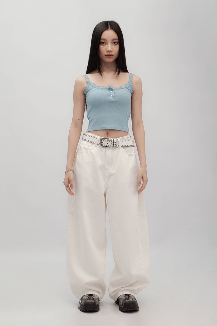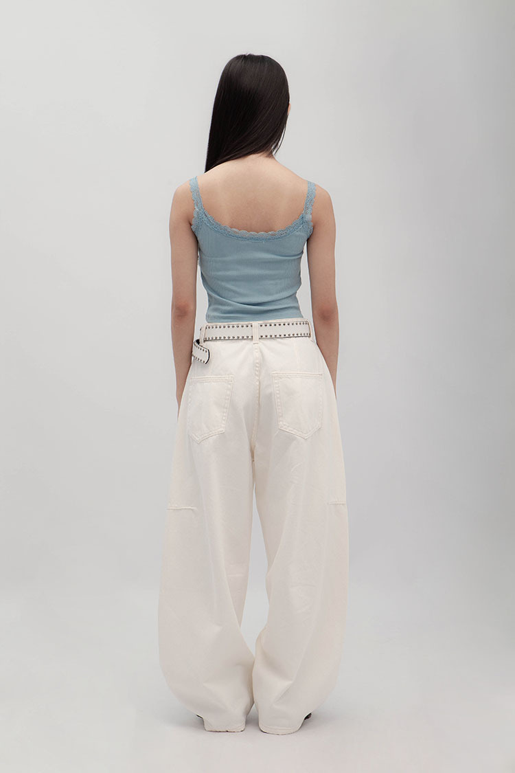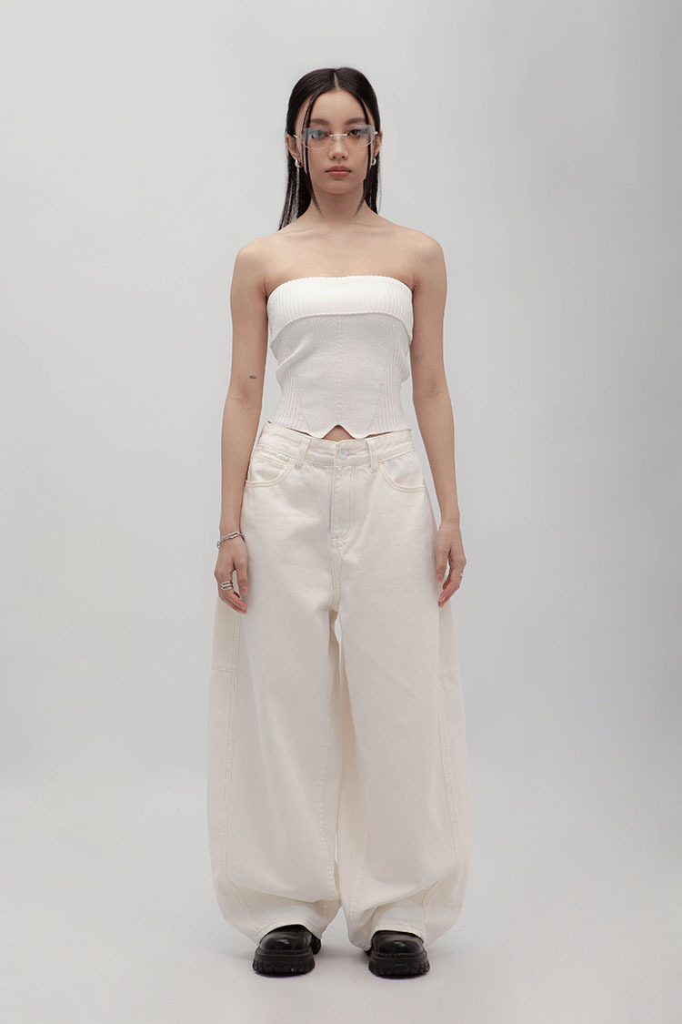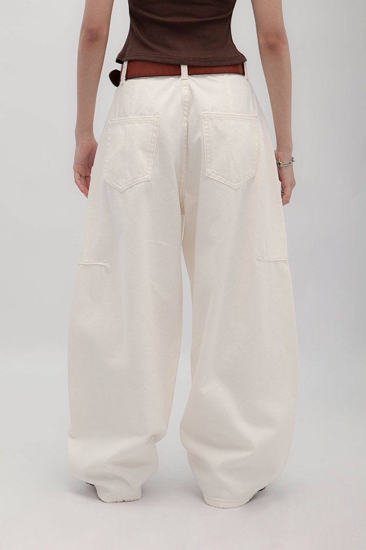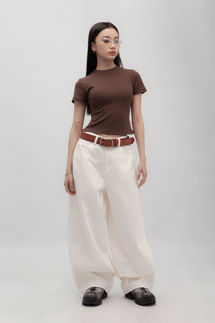 立體彎刀剪裁為設計亮點,透過側邊弧線與立體線條結構,寬鬆隨性的褲型輪廓。側縫線略往前裁剪,視覺上能自然延伸腿部線條,對梨形身材友好;材質手感厚實卻不悶熱,含高比例棉質,穿起來挺拔有垂感、不易垮塌。