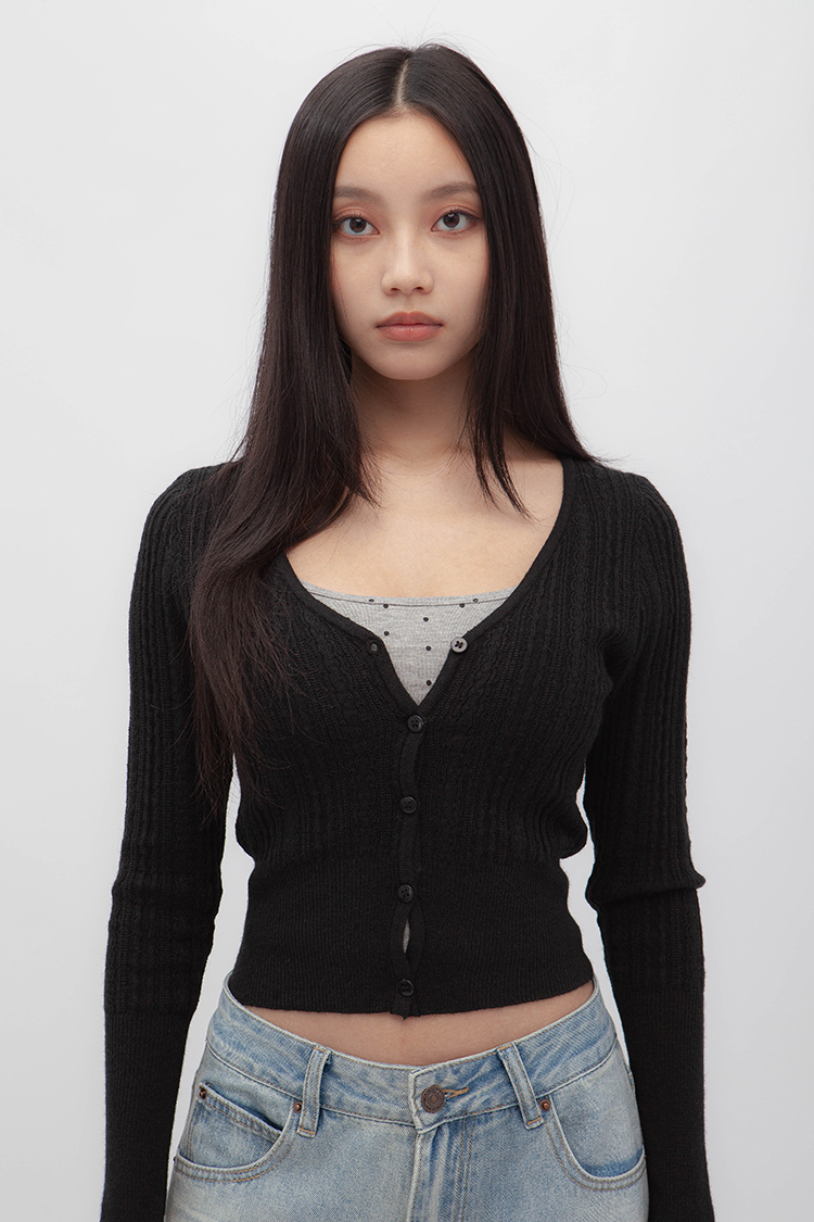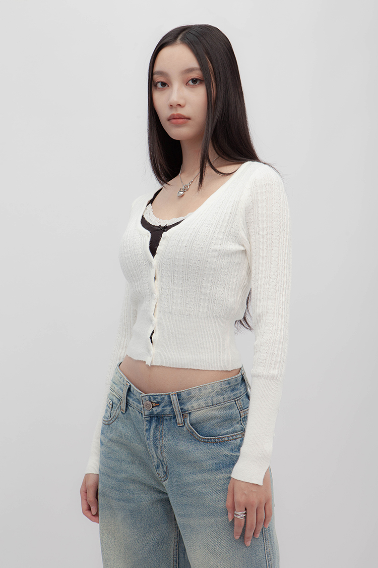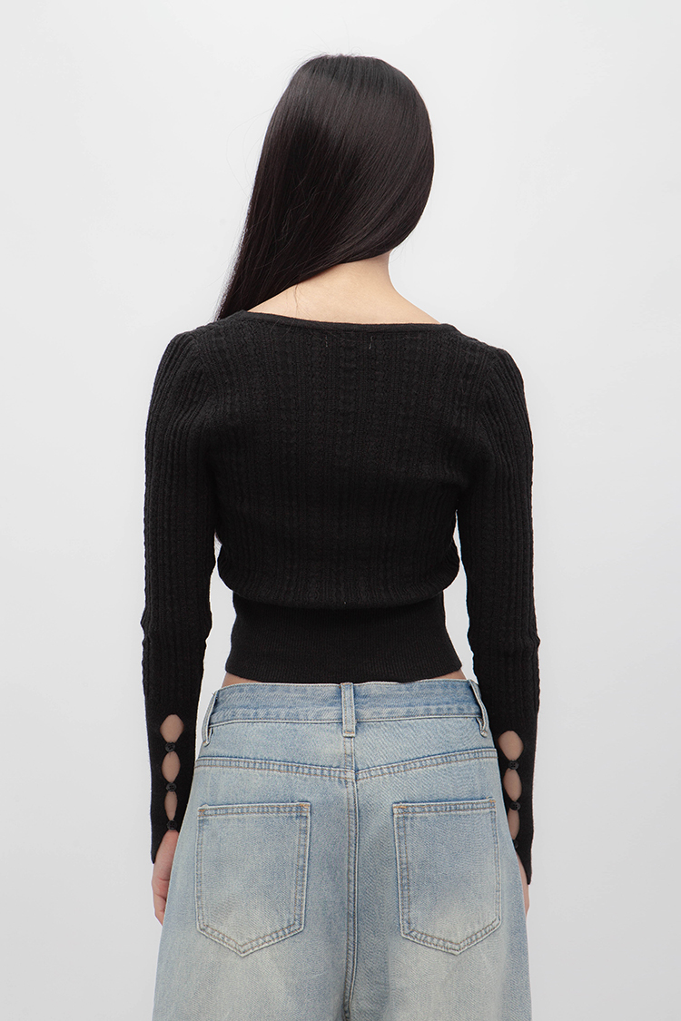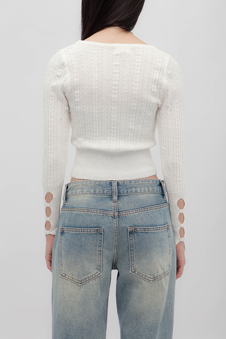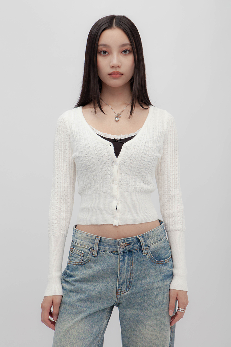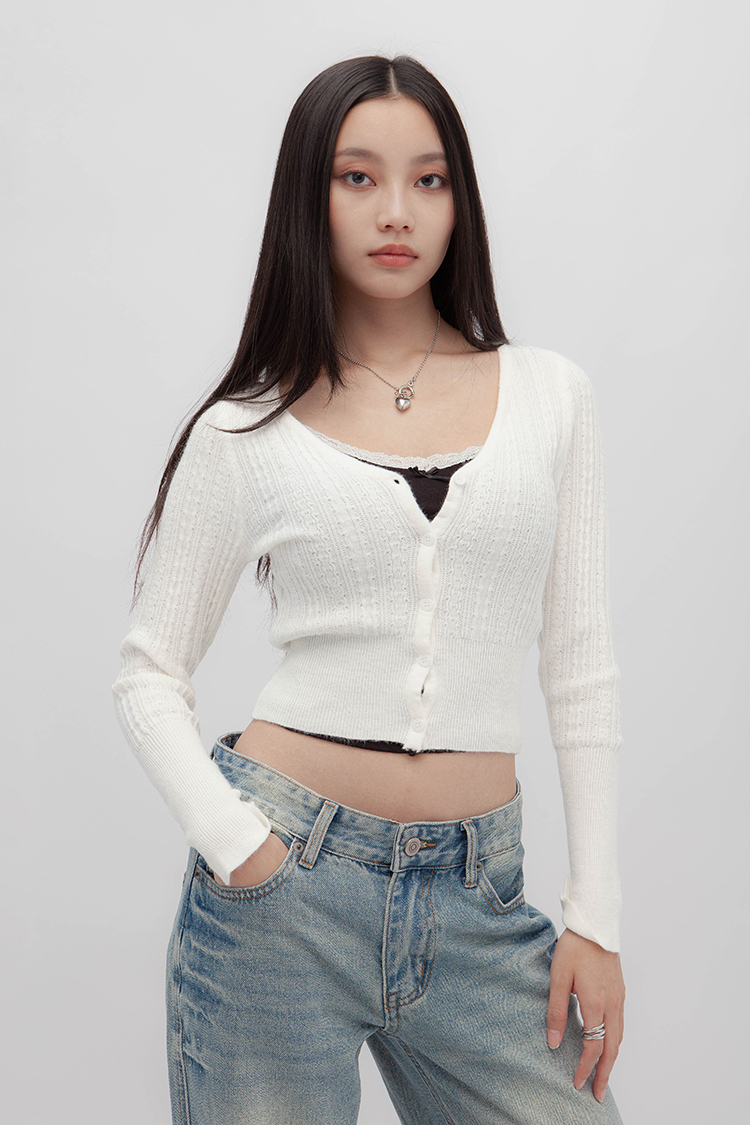 V領短版搭配鏤空袖口與細緻肌理針織,穿起來修飾度高、帶點小性感,高腰下身搭配也超好看。