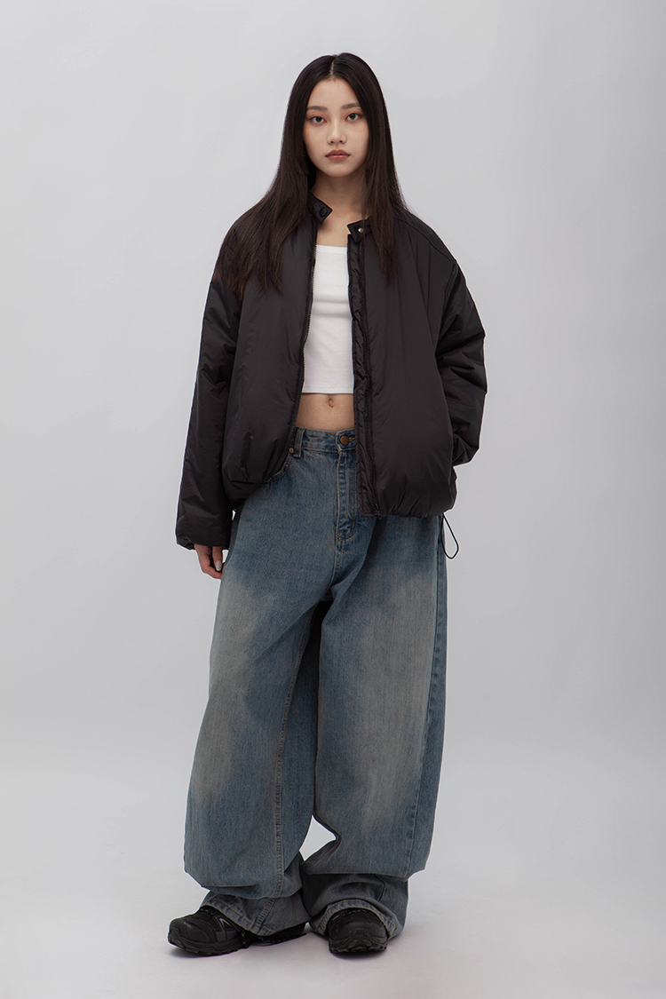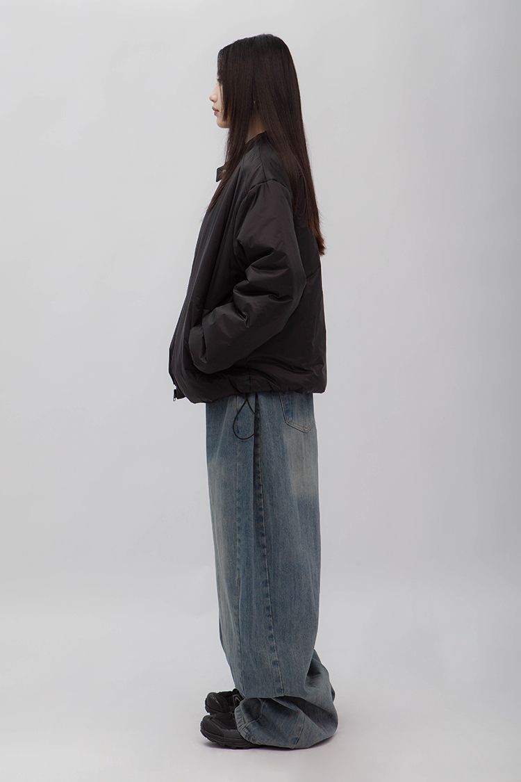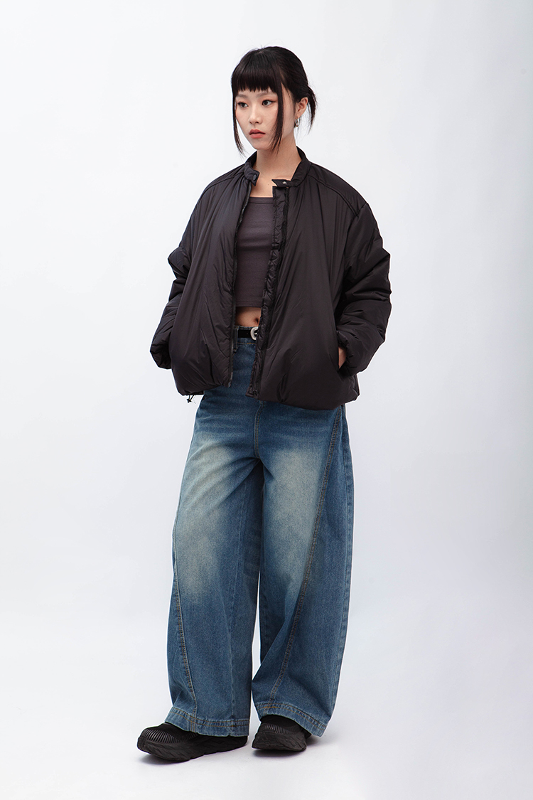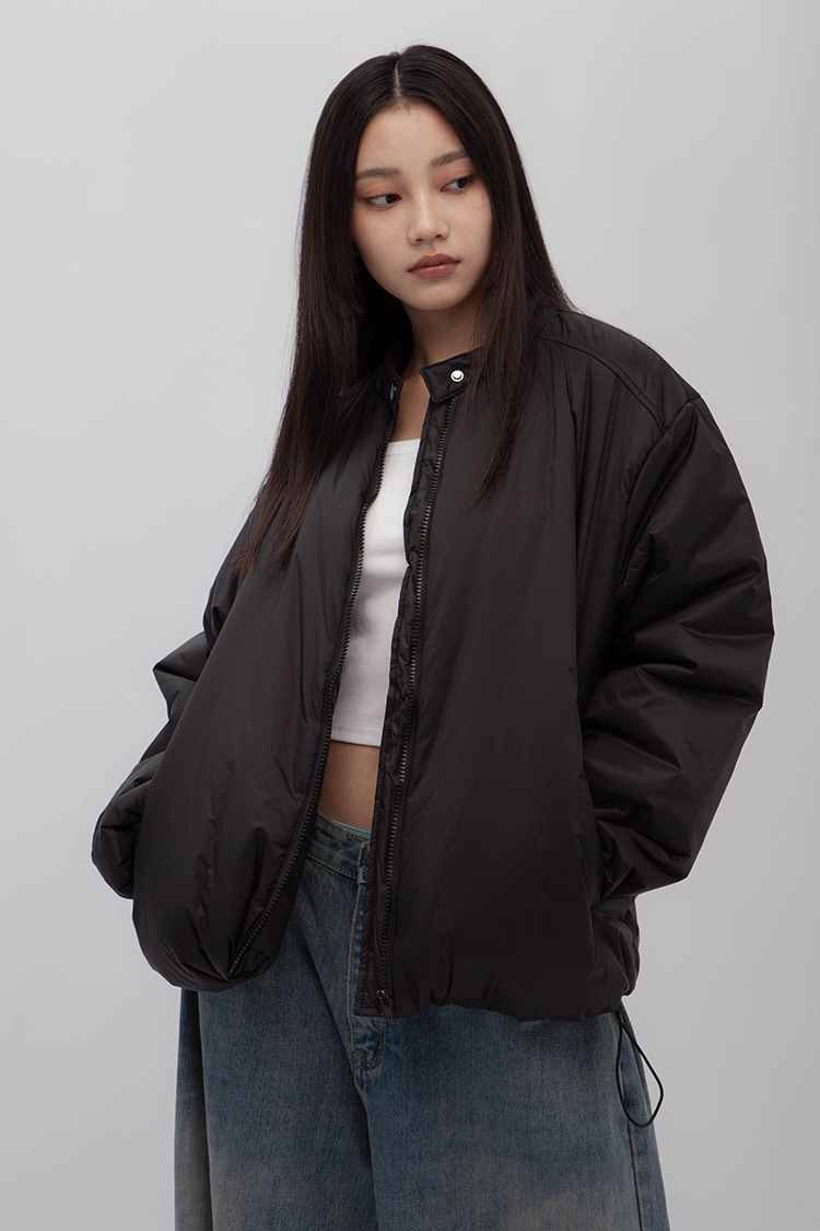 圓領單釦,拉鍊閉合,肩膀有修飾雙條走線裁縫,落肩,單嵌線前口袋,下擺兩側可調節抽繩,厚實鋪棉,配觸感超級舒適的內裡,蓬蓬輪廓。