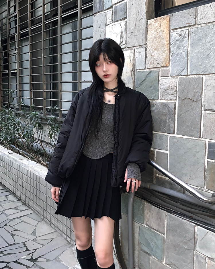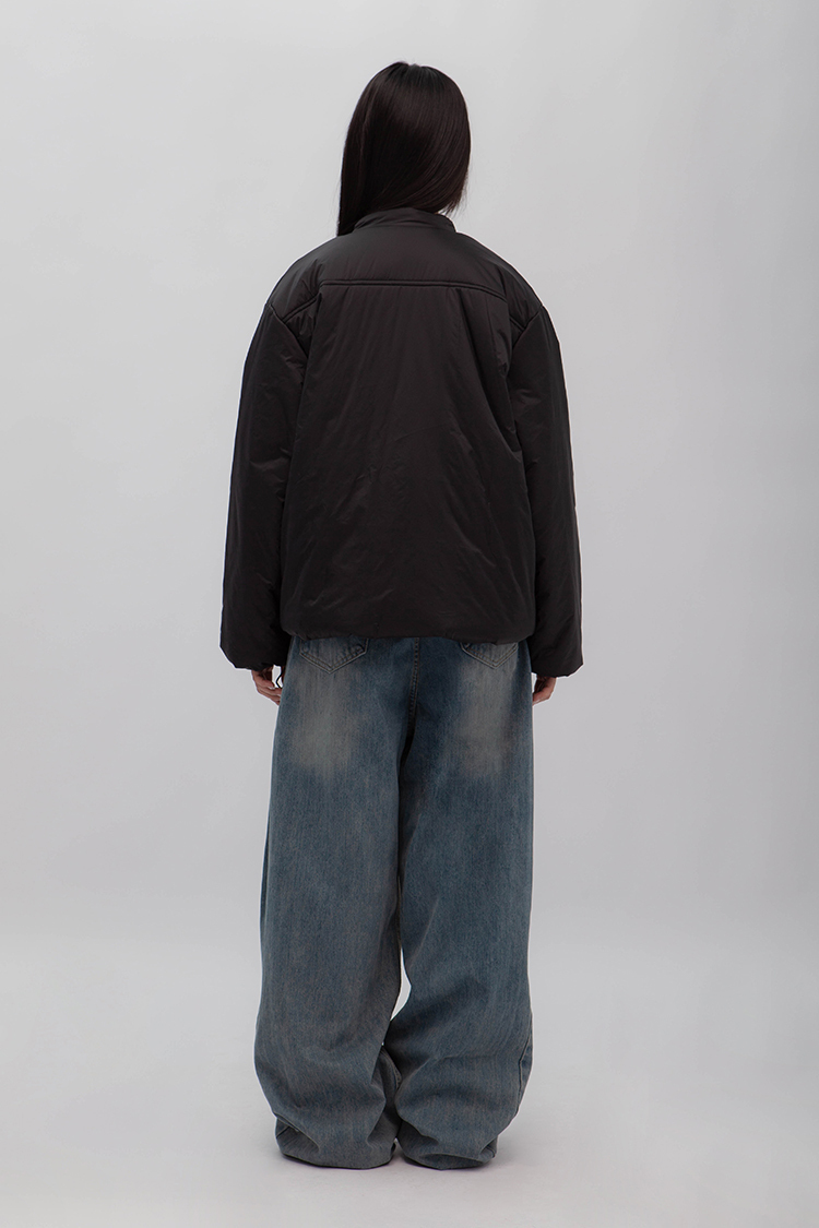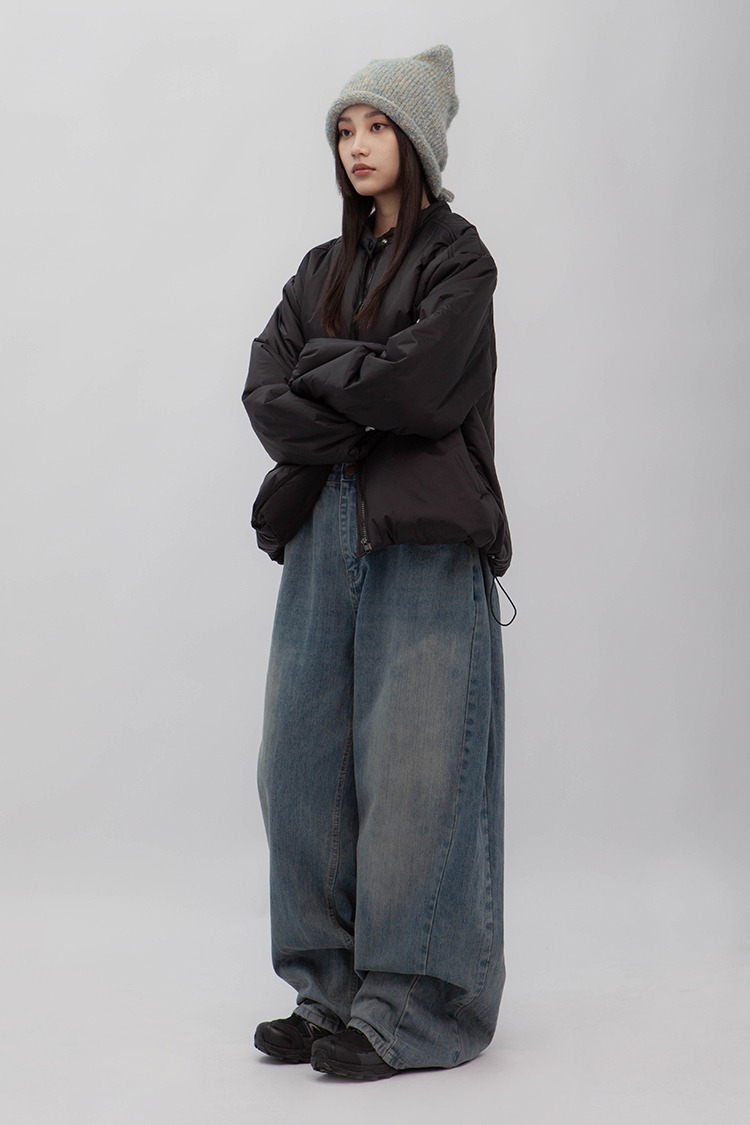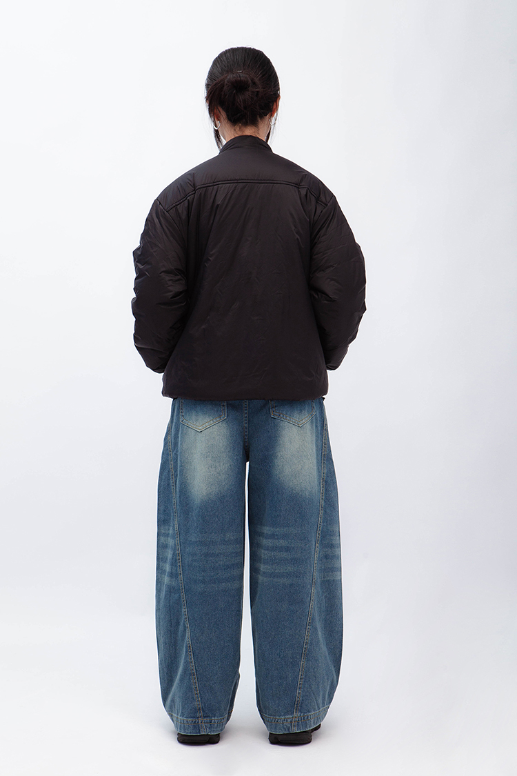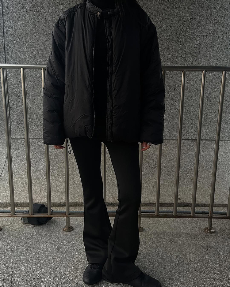 圓領單釦,拉鍊閉合,肩膀有修飾雙條走線裁縫,落肩,單嵌線前口袋,下擺兩側可調節抽繩,厚實鋪棉,配觸感超級舒適的內裡,蓬蓬輪廓。