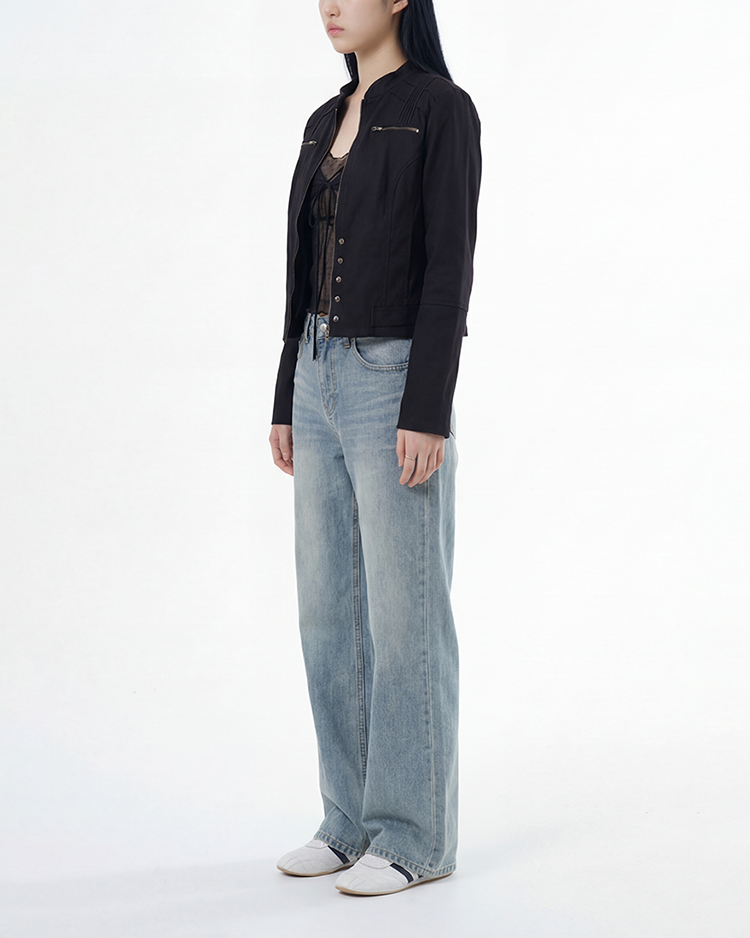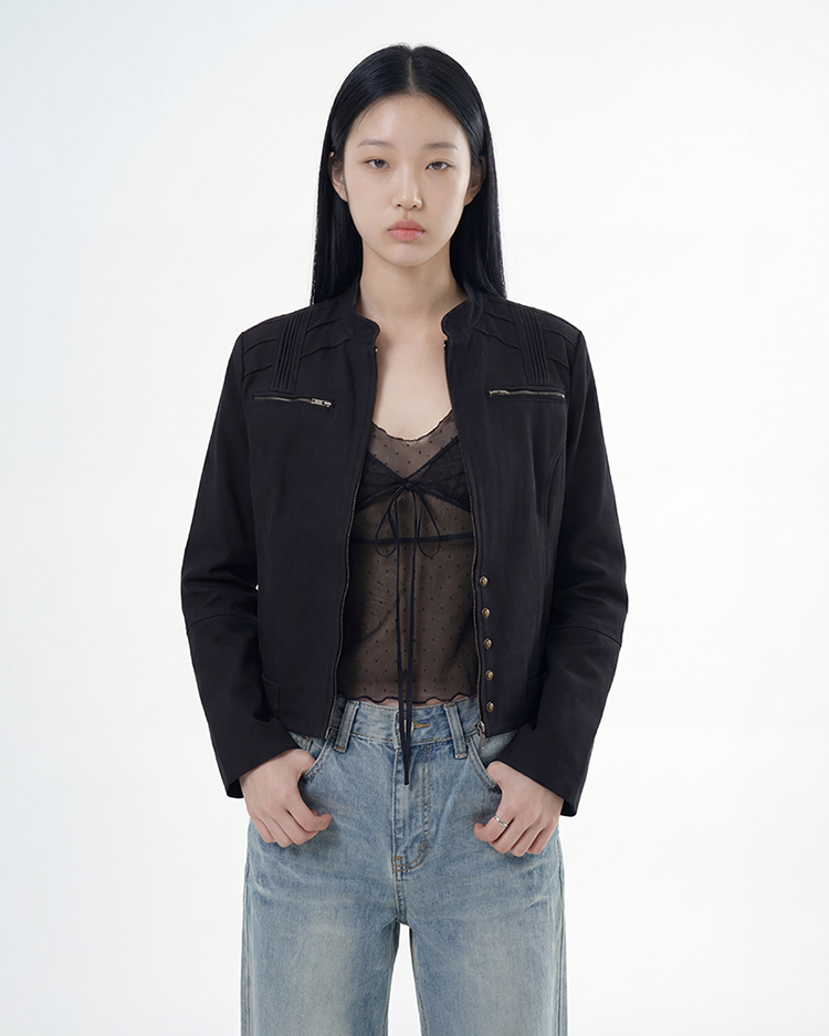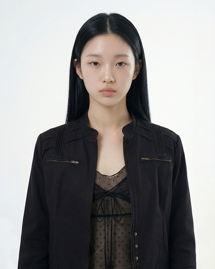 以俐落的立領剪裁結合胸前精緻的對稱壓褶工藝,賦予夾克立體且具建築感的結構廓形,短版合身剪裁,配合紮實斜紋手感。