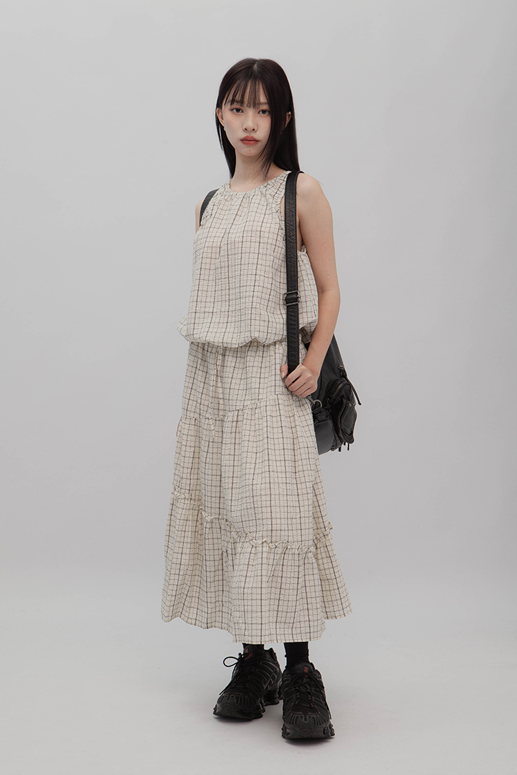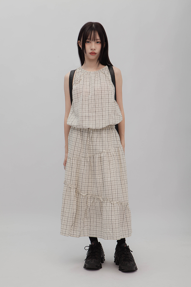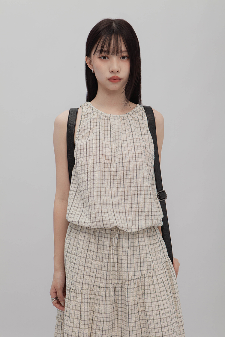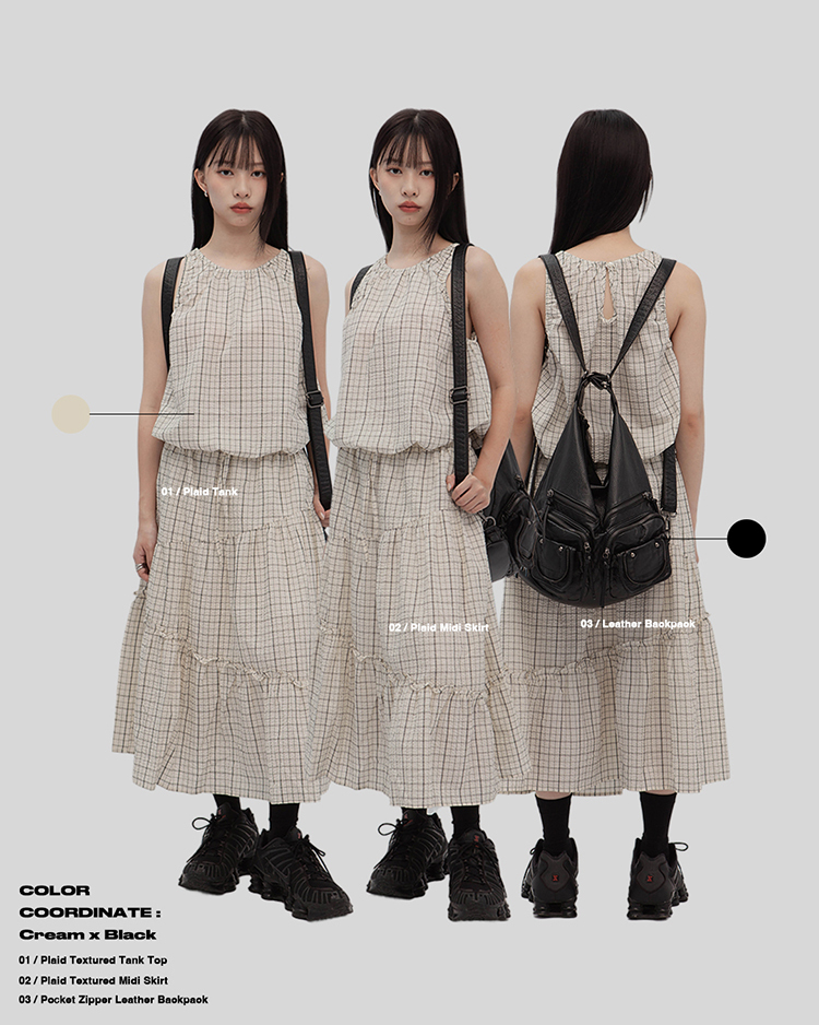 米白色和黑色格紋相間,泡泡肌理感,親膚透氣,成套搭配引人注目,輕鬆打造夏日造型,每天多一點浪漫。
